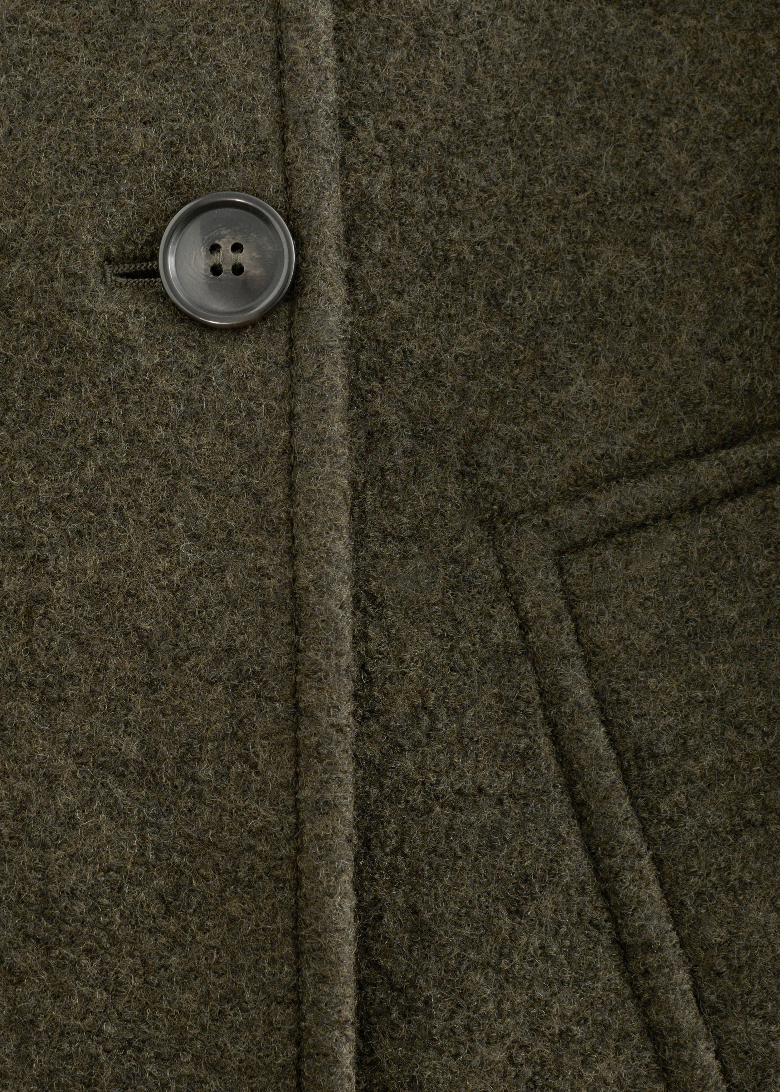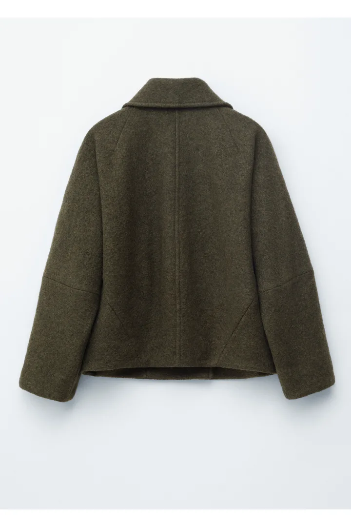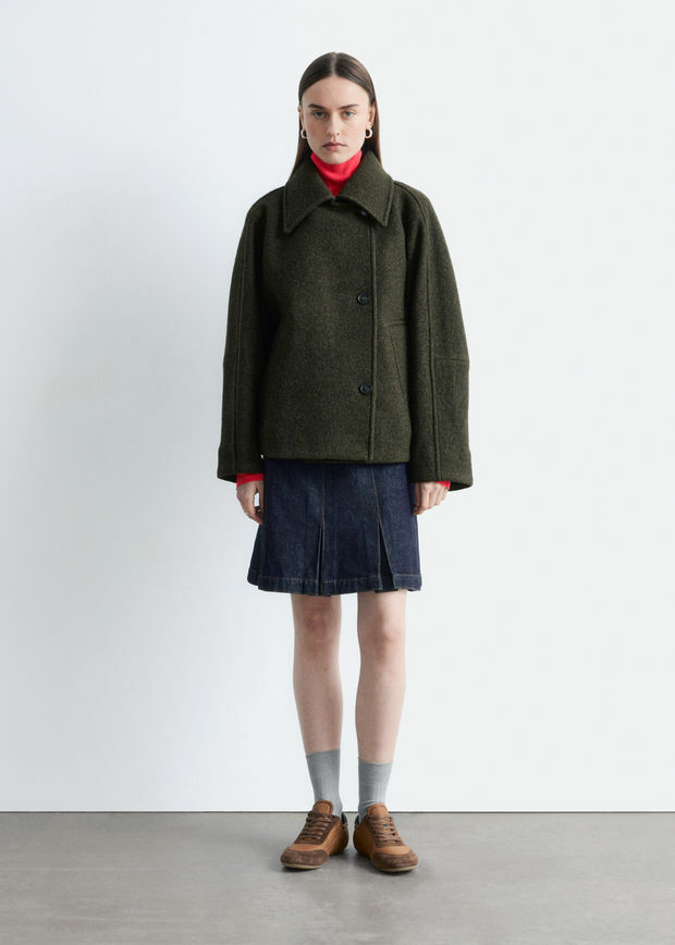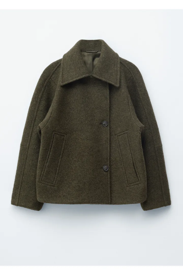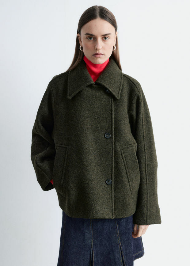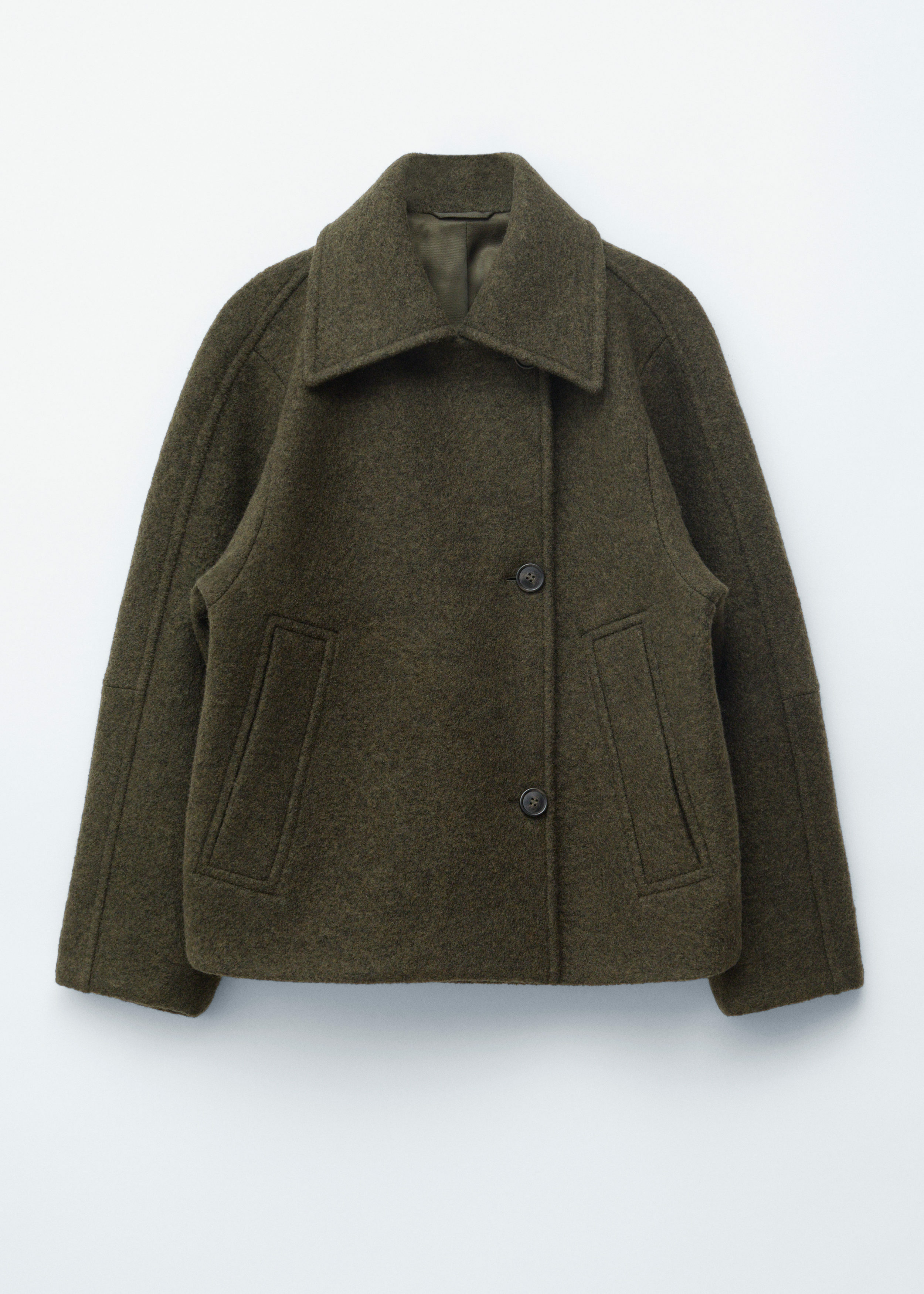 오버사이즈 실루엣의 울 자켓이에요. 여밈부의 오프셋 버튼, 큼직한 카라, 그리고 은은한 테이퍼드 슬리브의 커트라인 솔기가 특징이에요. 앞면부 웰트 포켓과 이너 포켓이 자리해 있답니다.