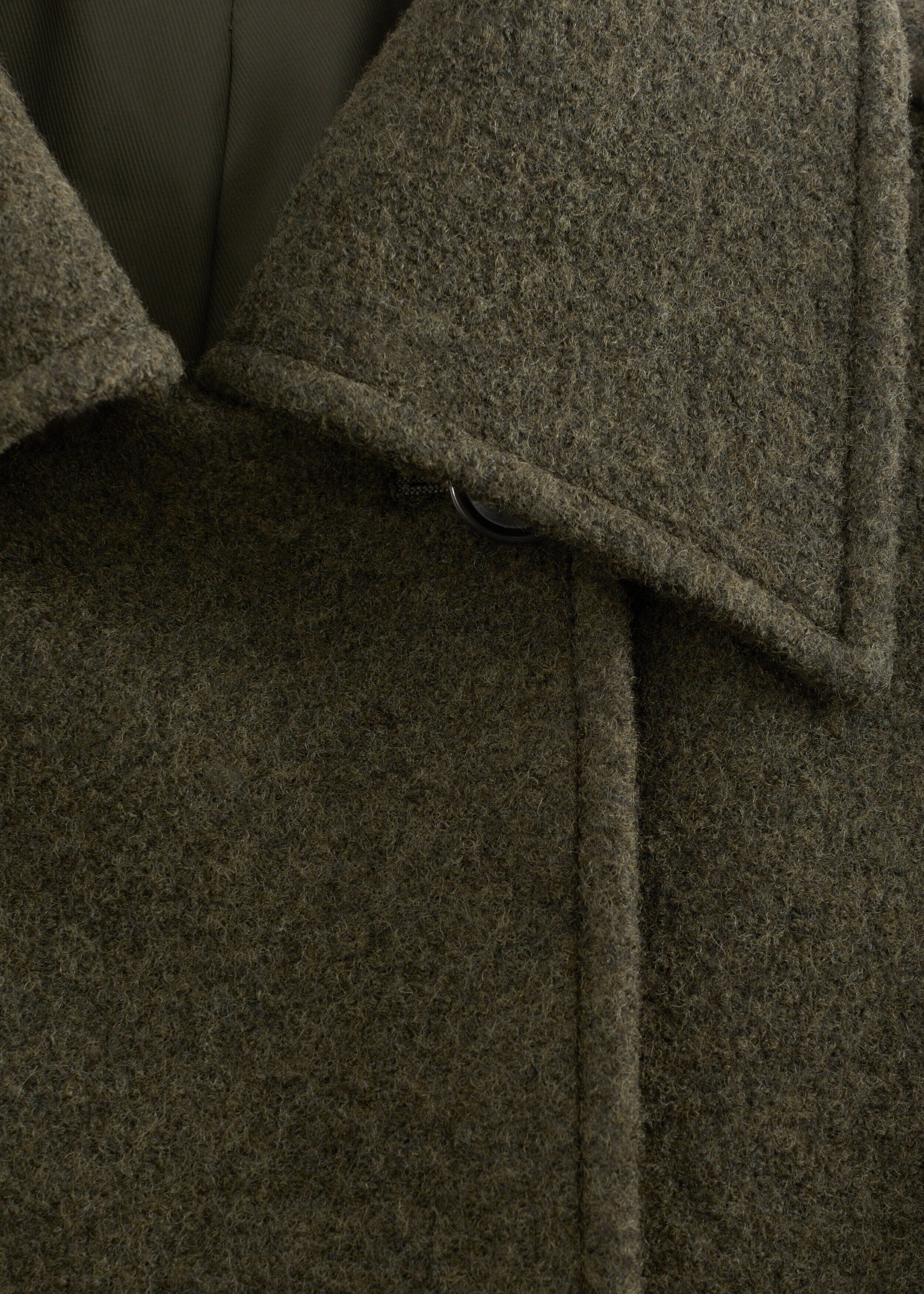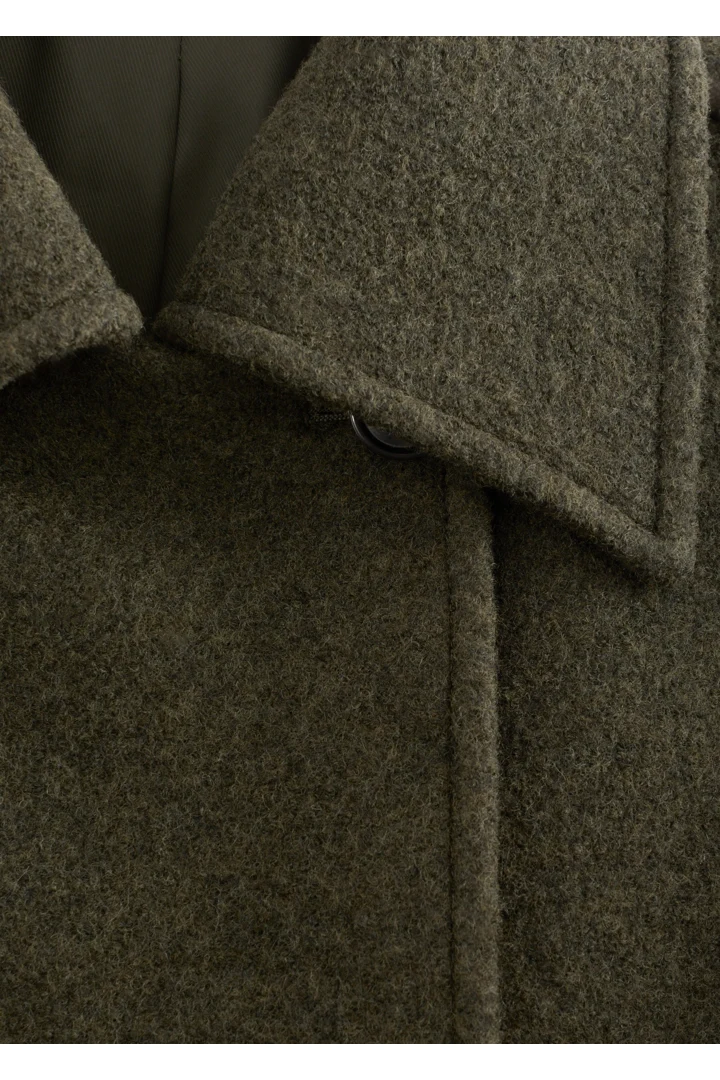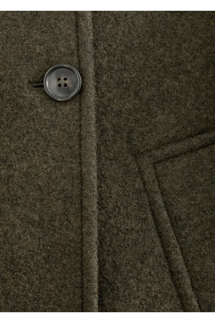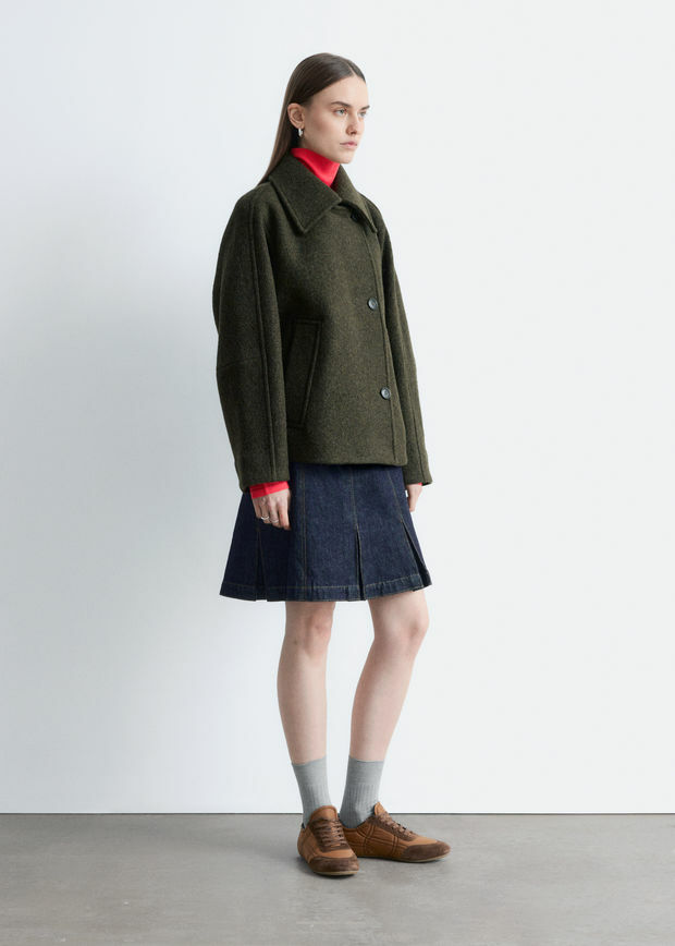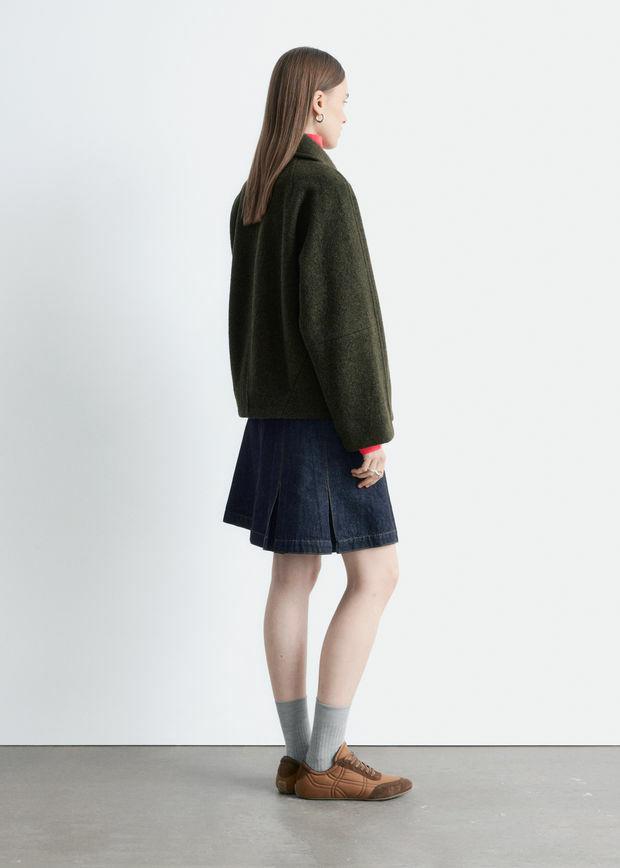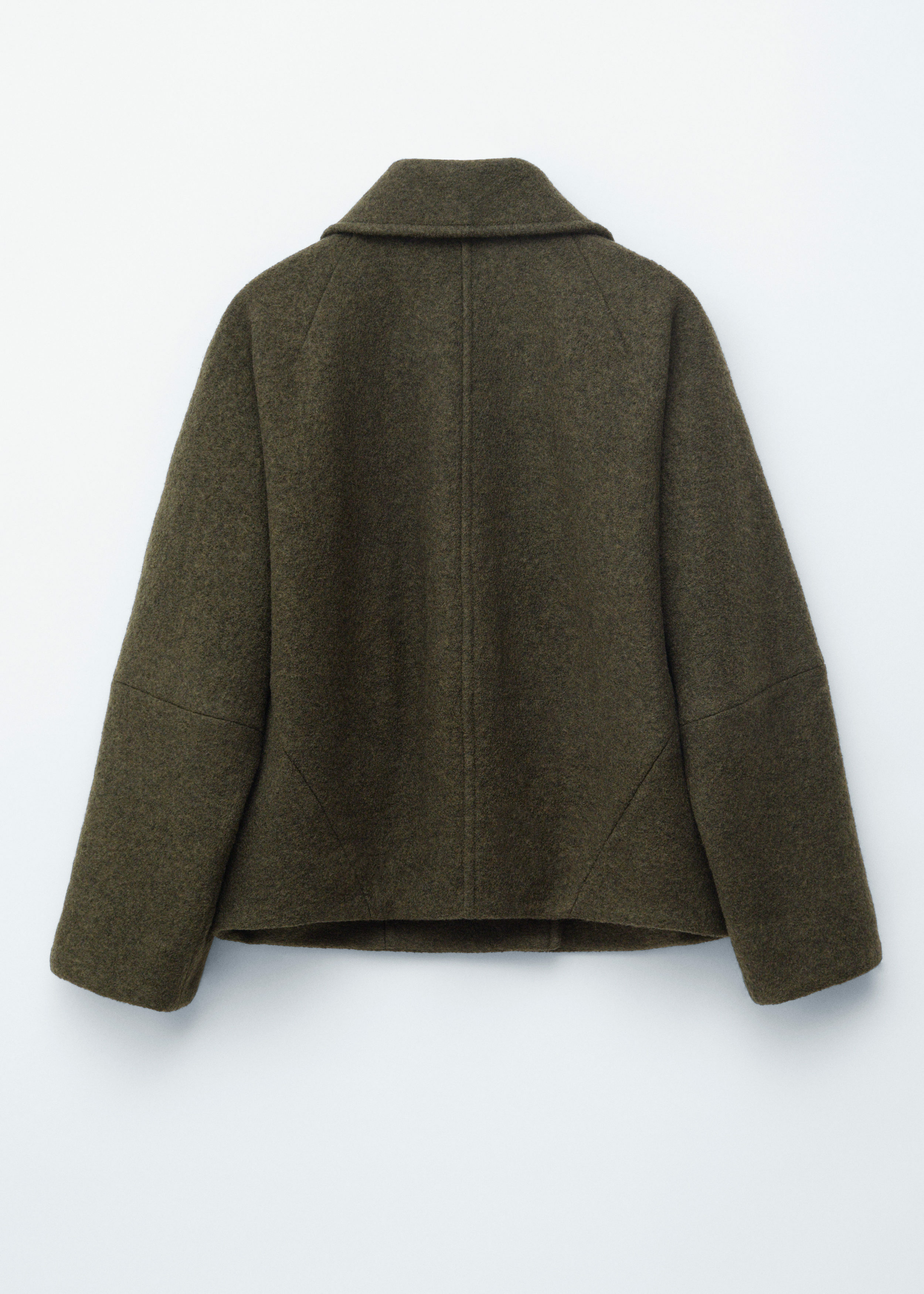 오버사이즈 실루엣의 울 자켓이에요. 여밈부의 오프셋 버튼, 큼직한 카라, 그리고 은은한 테이퍼드 슬리브의 커트라인 솔기가 특징이에요. 앞면부 웰트 포켓과 이너 포켓이 자리해 있답니다.