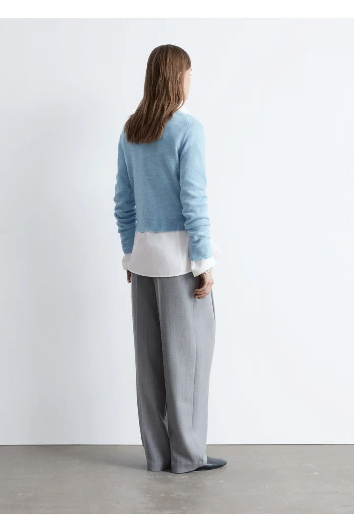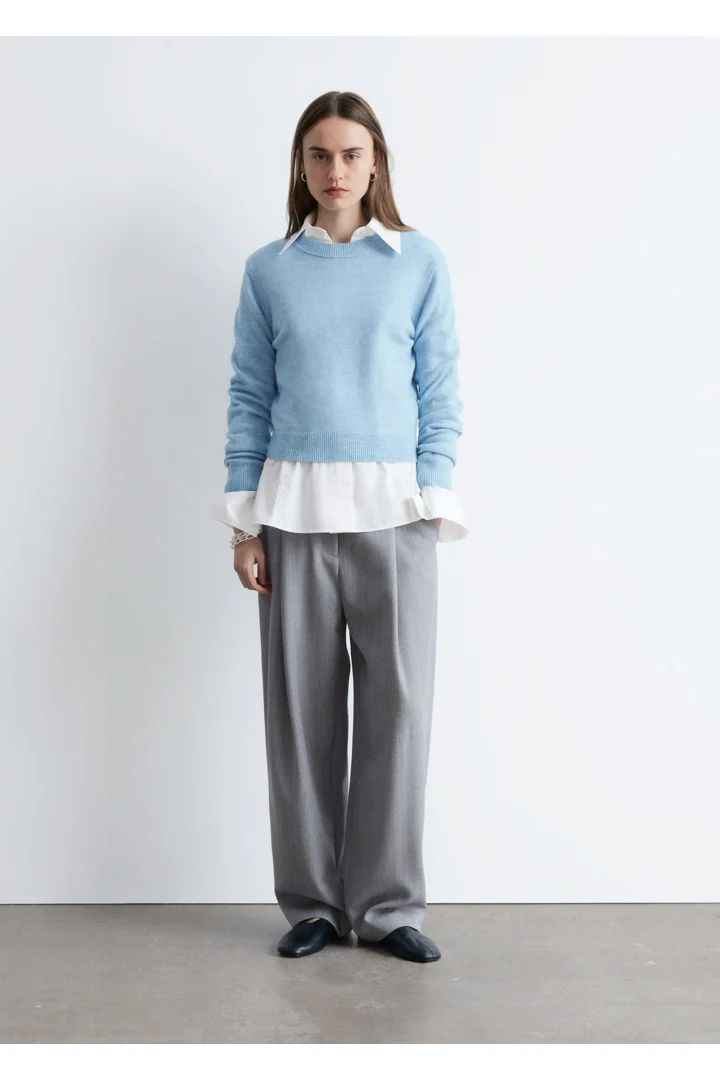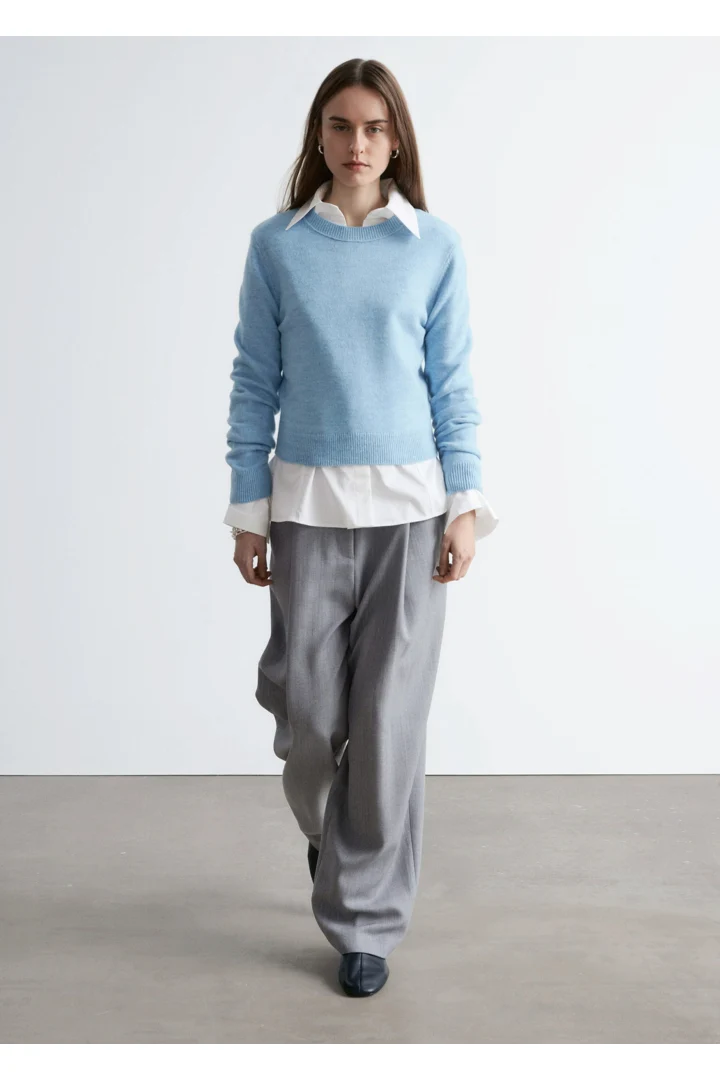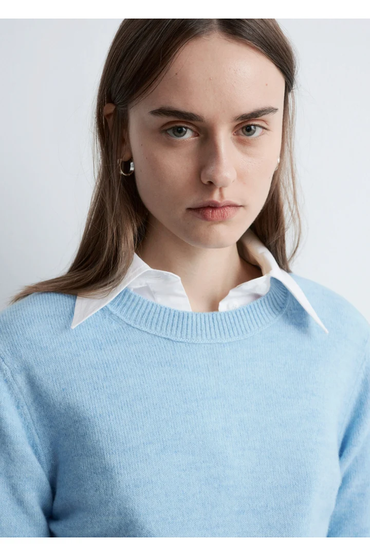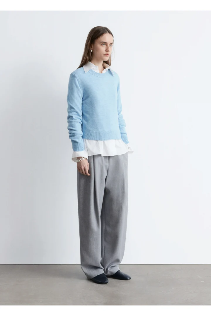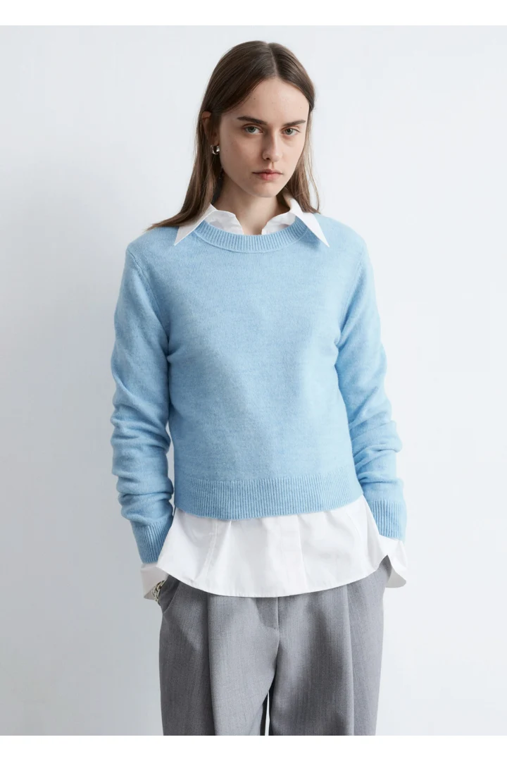 울 & 코튼 혼방 니트 소재의 롱 슬리브 스웨터예요. 링크 스티치로 둘러 장식된 립 트리밍의 라운드 네크라인, 그리고 커프스와 헴라인의 립 디테일이 특징이랍니다.