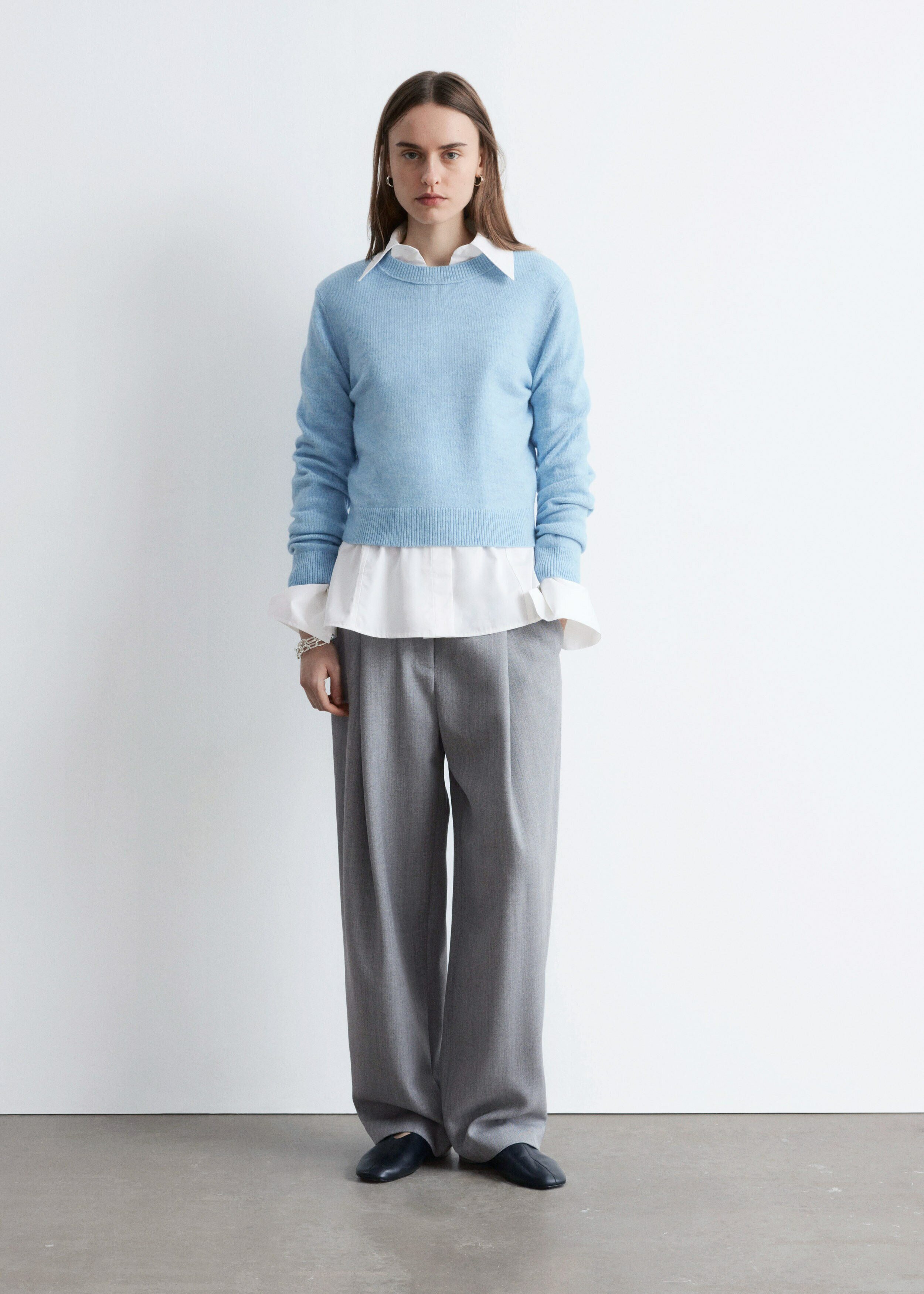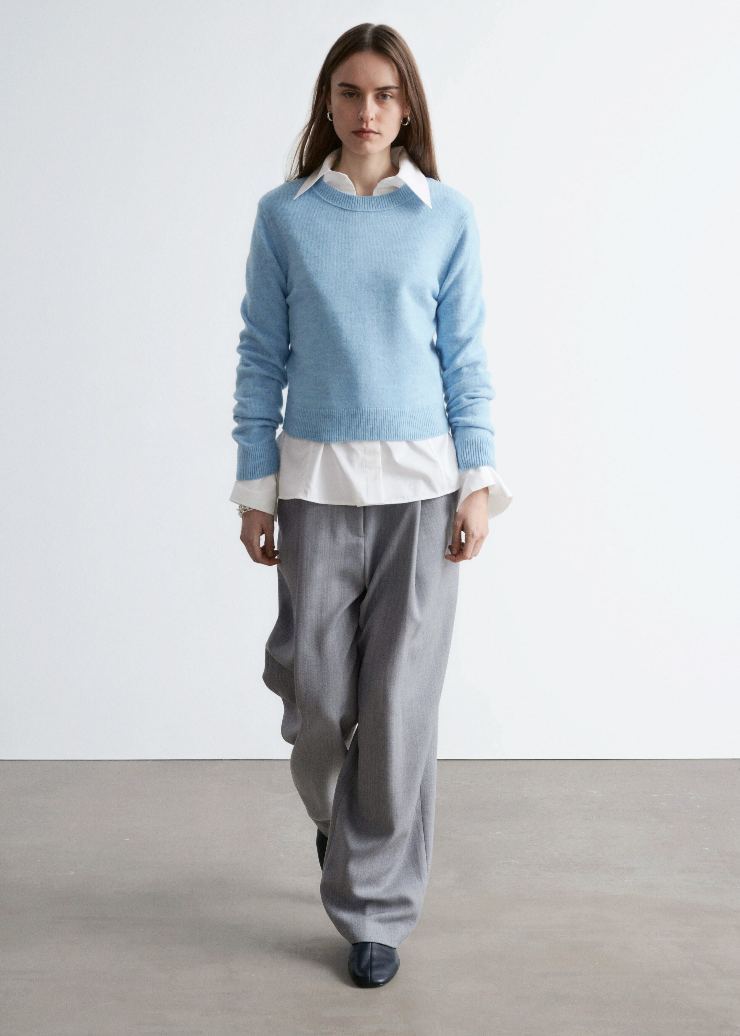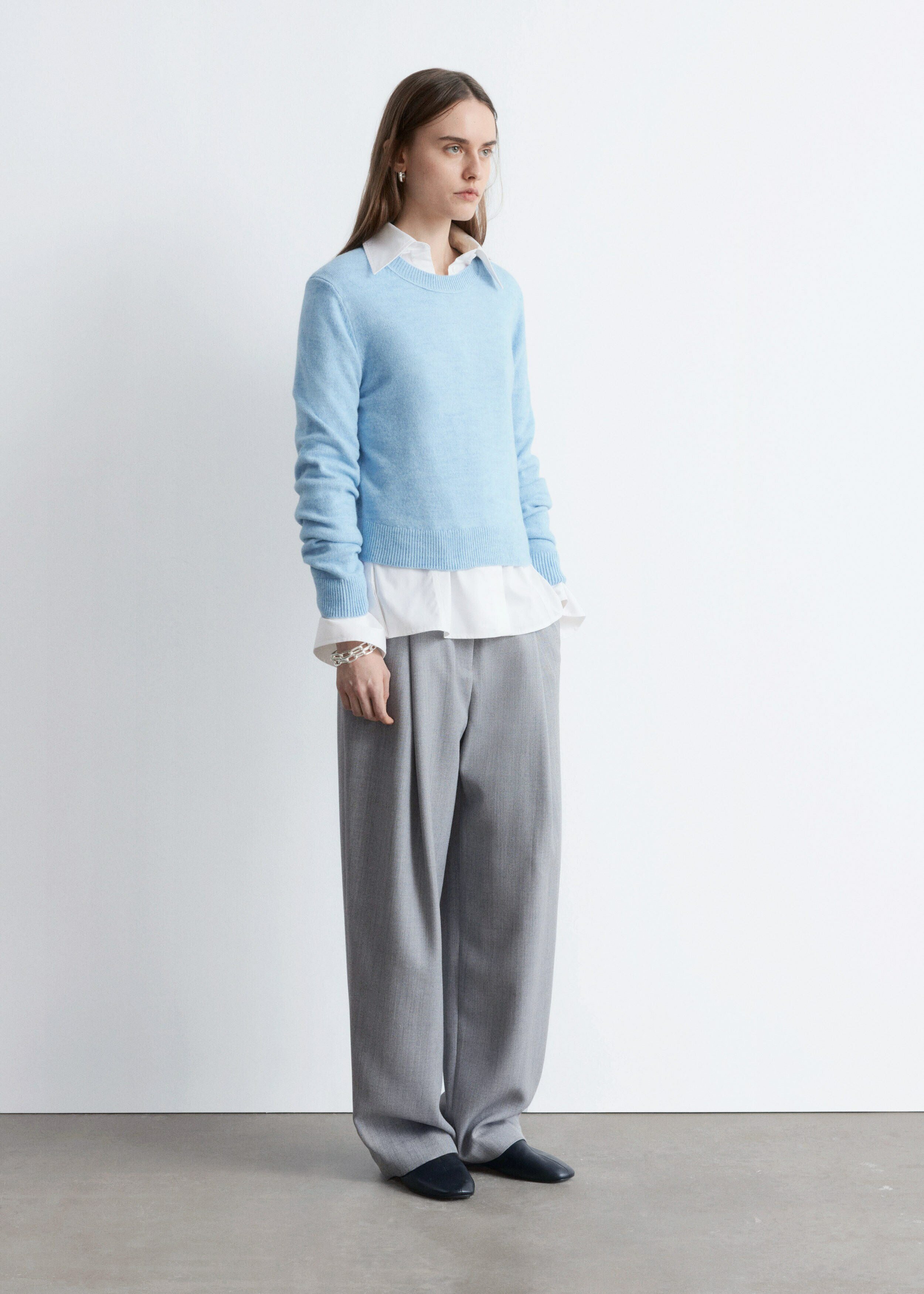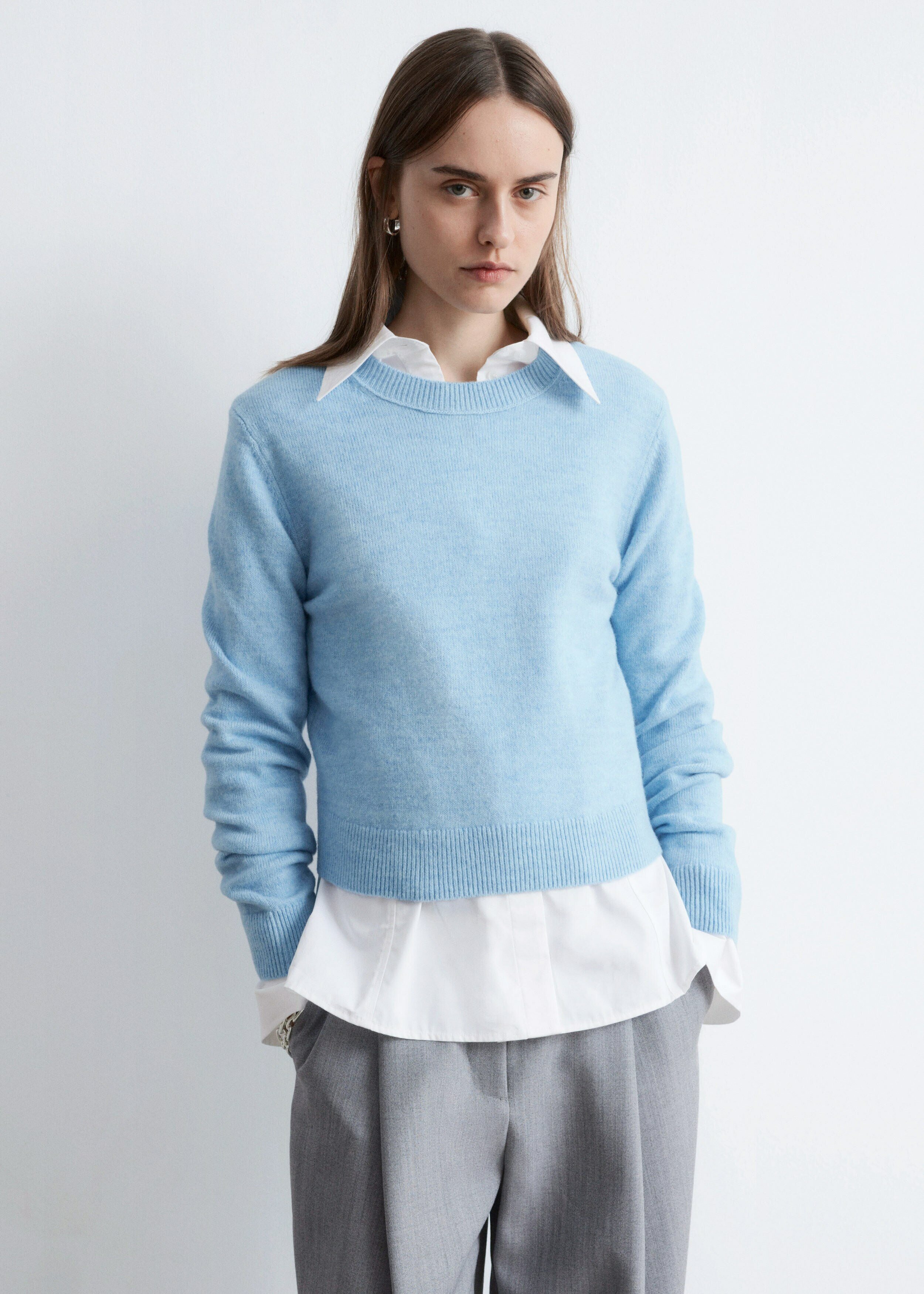 울 & 코튼 혼방 니트 소재의 롱 슬리브 스웨터예요. 링크 스티치로 둘러 장식된 립 트리밍의 라운드 네크라인, 그리고 커프스와 헴라인의 립 디테일이 특징이랍니다.