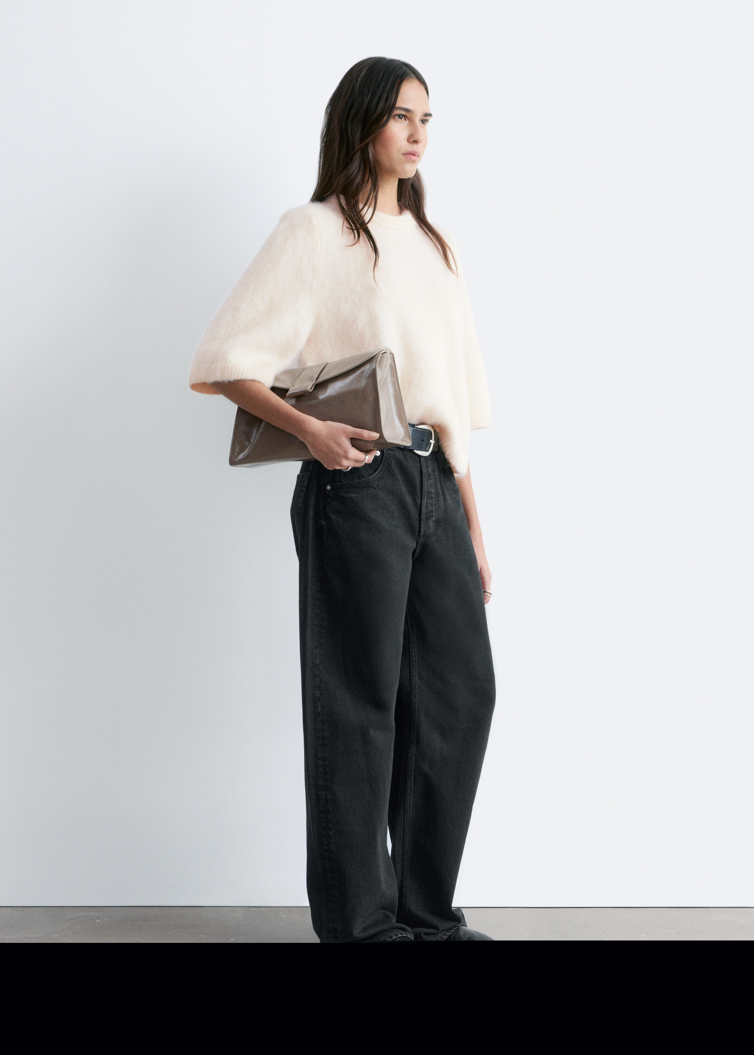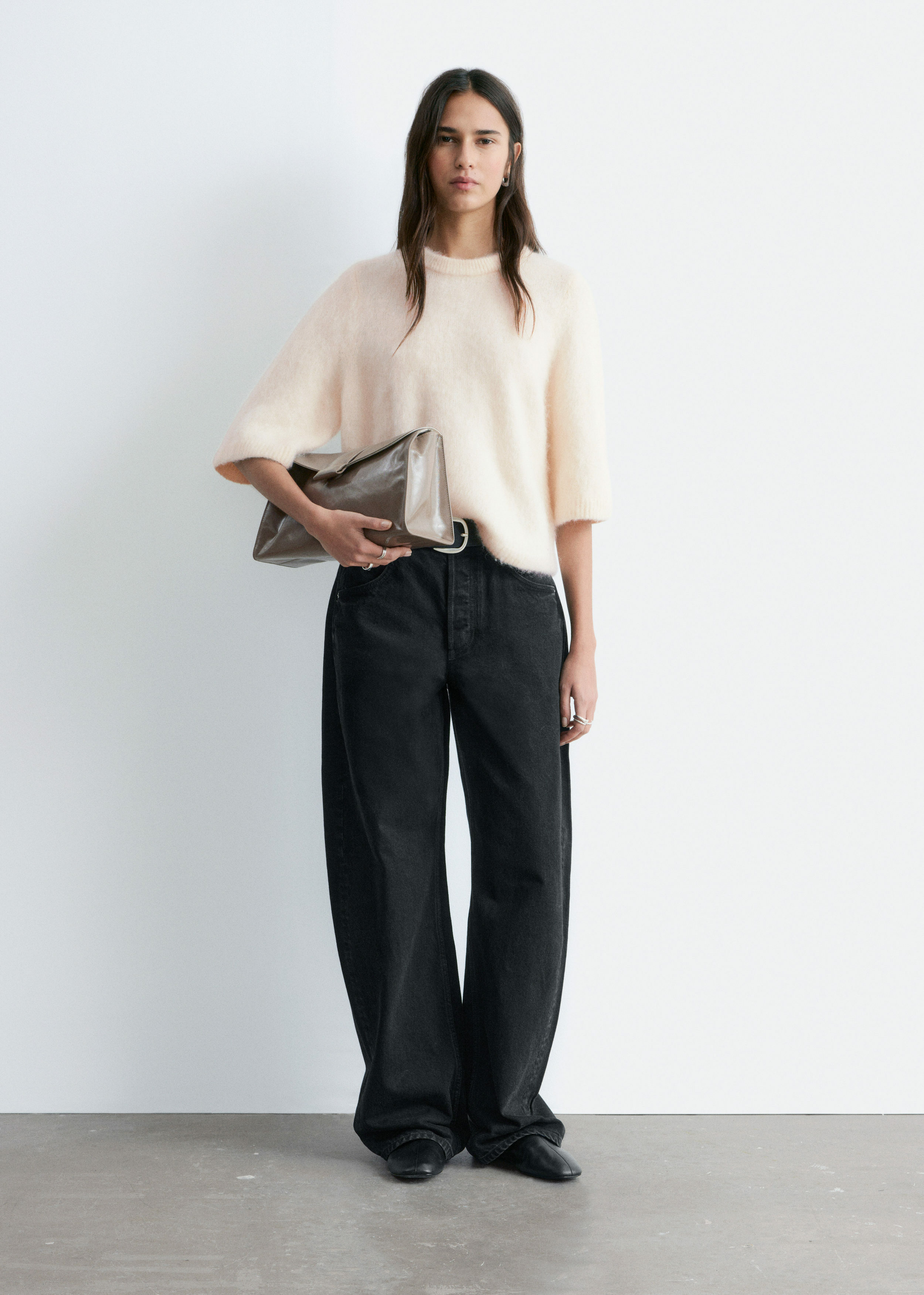 브러시드 모헤어 & 울 혼방 니트 소재의 티셔츠예요. 루즈한 실루엣, 라운드 네크라인, 립 트리밍, 그리고 팔꿈치까지 오는 슬리브가 특징이랍니다.
