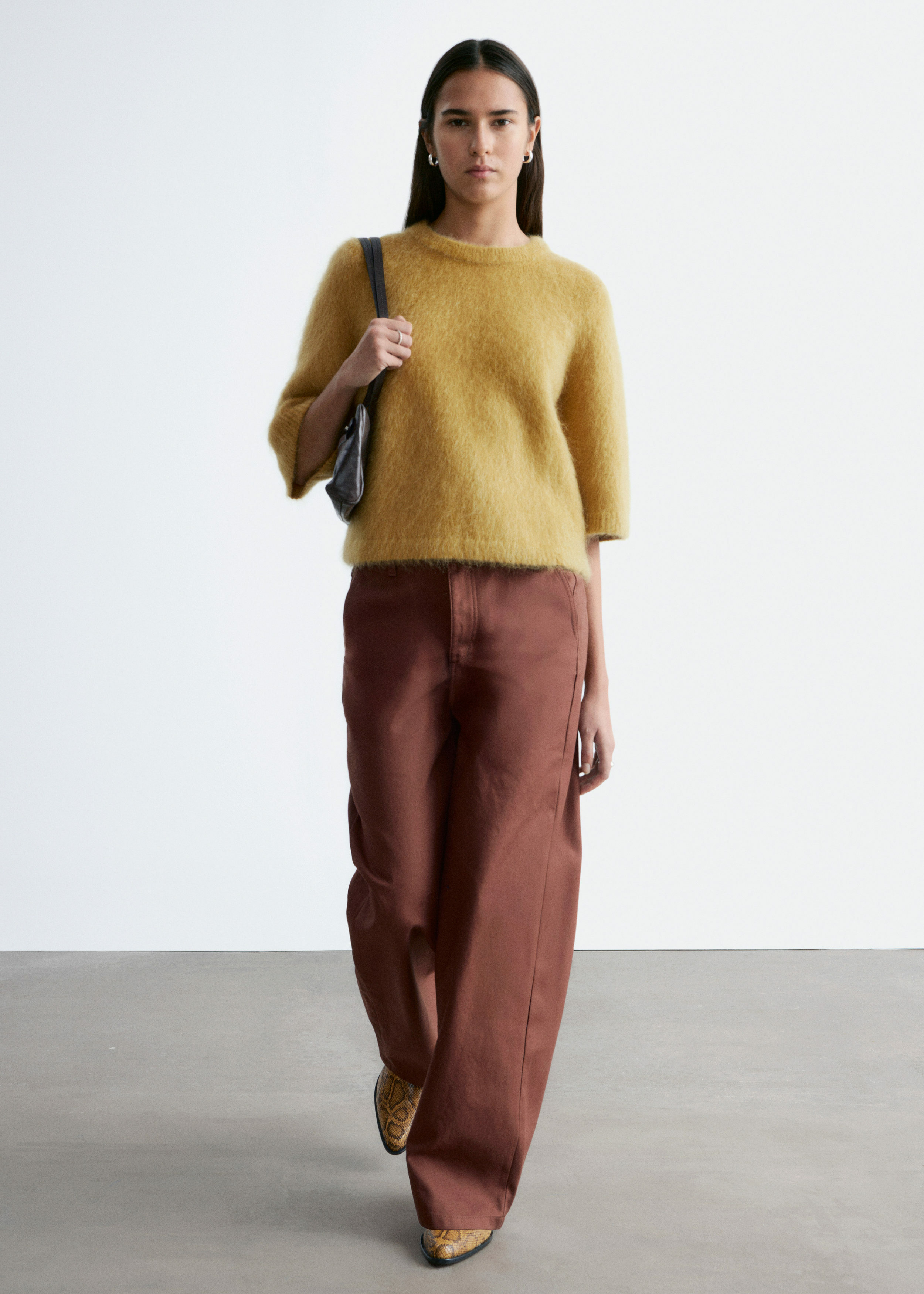 브러시드 모헤어 & 울 혼방 니트 소재의 티셔츠예요. 루즈한 실루엣, 라운드 네크라인, 립 트리밍, 그리고 팔꿈치까지 오는 슬리브가 특징이랍니다.