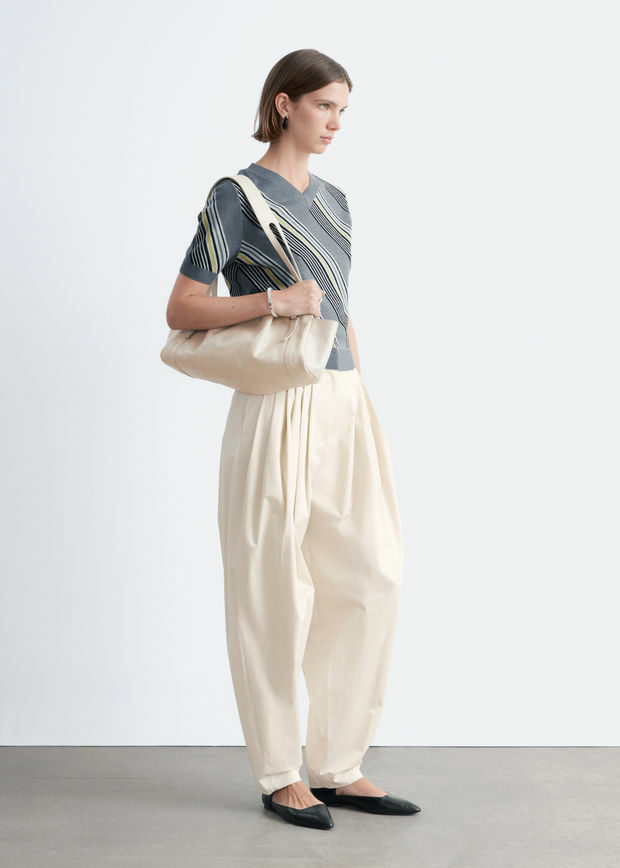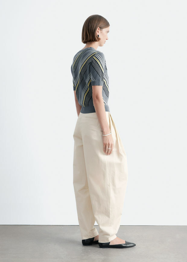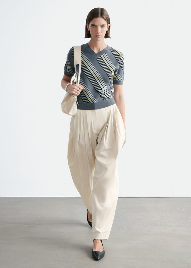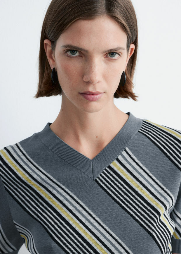 니트웨어를 모던하게 재해석한 쇼트 슬리브 티셔츠예요. 100% 울 소재로 섬세하게 니팅된 아이템이랍니다. 깔끔한 V 네크라인, 바디에 자리한 사선의 그래픽 스트라이프, 그리고 입체감을 더하는 립 트리밍이 특징이에요.