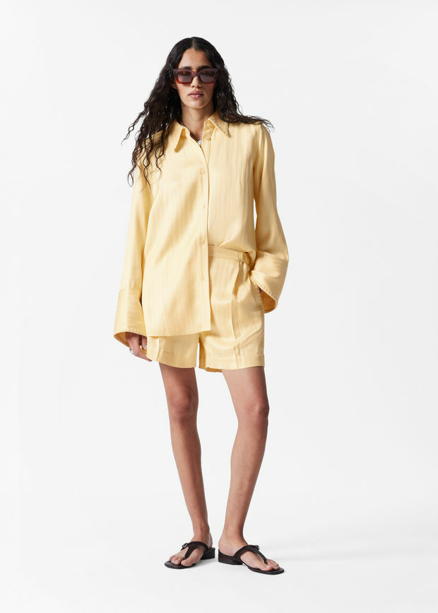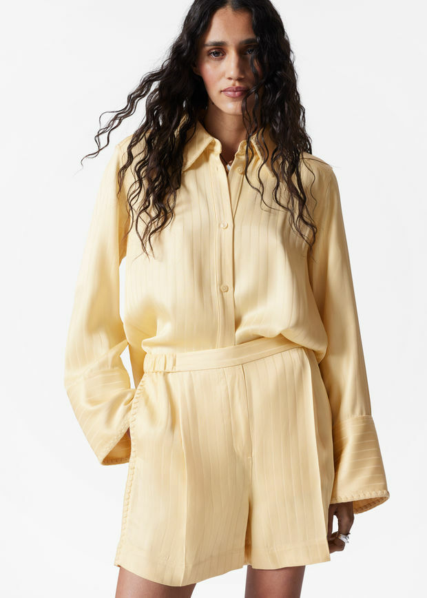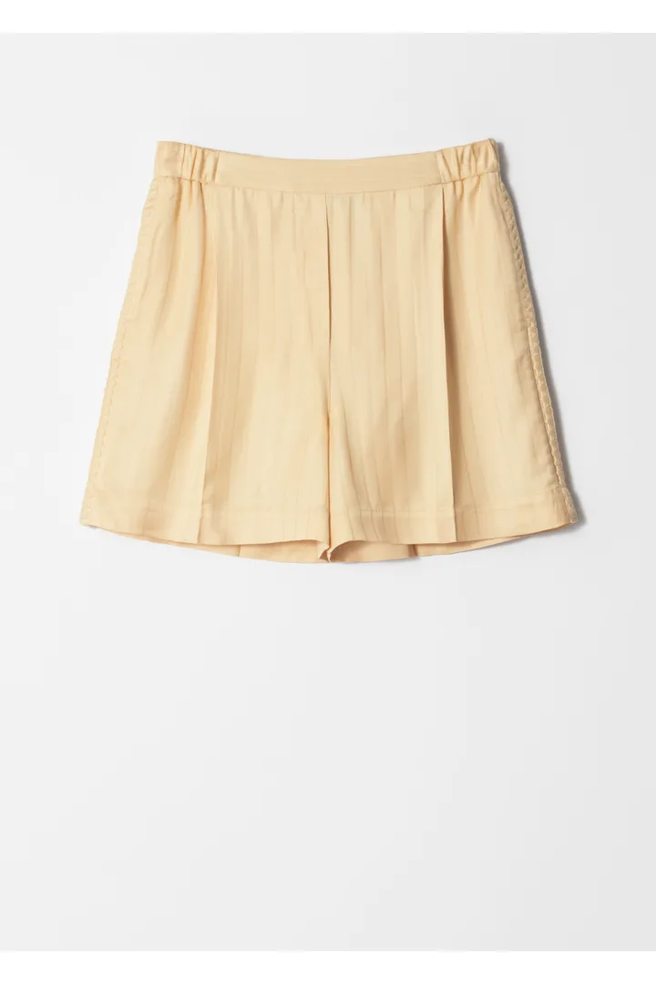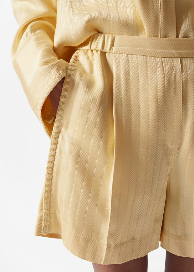 부드럽게 흐르는 스트라이프 마감의 자카드 소재로 탄생한 쇼츠예요. 은은한 주름이 장식된 엘라스틱 허리밴드, 깔끔한 프레스 크리스, 측면의 윕스티치 솔기가 특징이에요. 자카드 셔츠와 함께 매치하면 무심한 듯 멋스러운 셋업 룩이 완성된답니다.