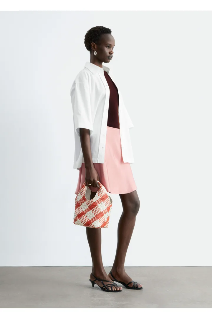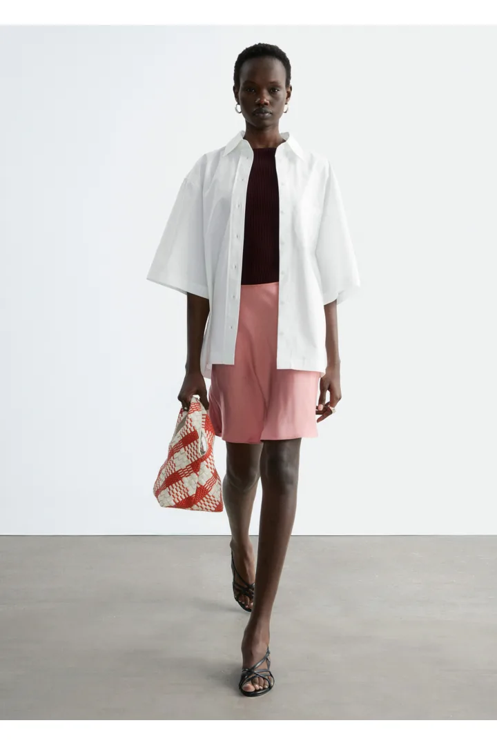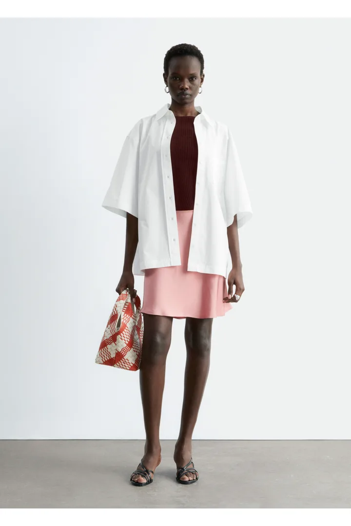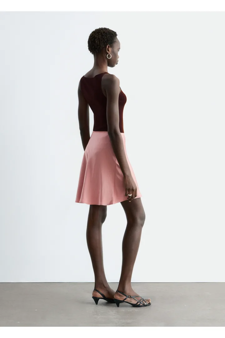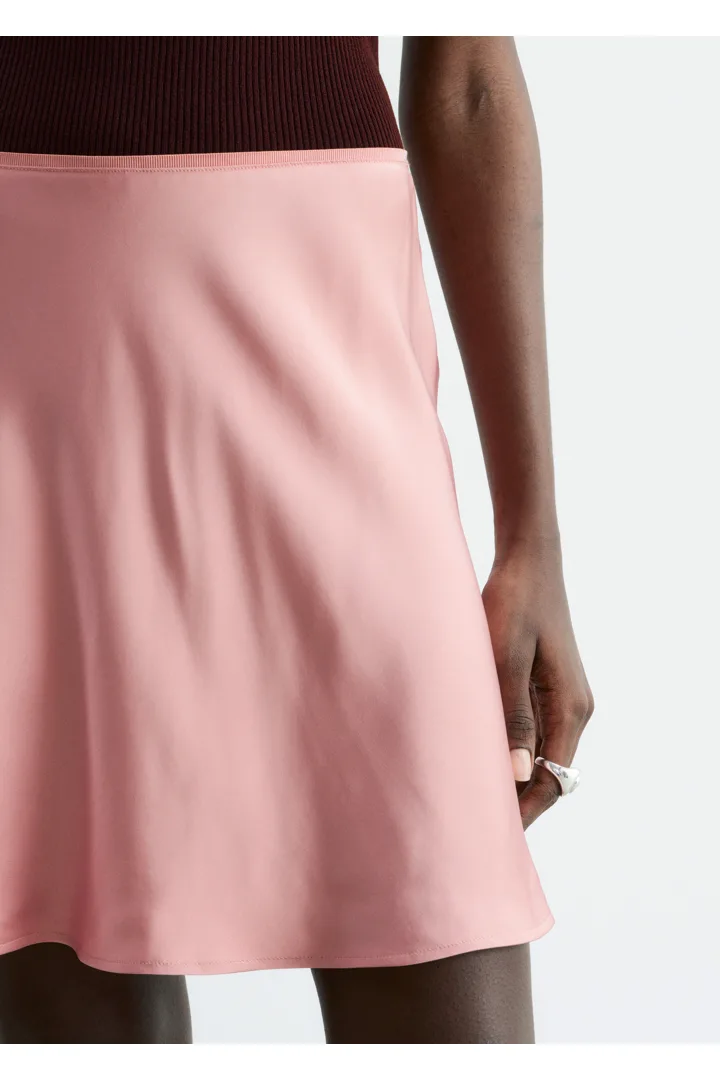 90년대 미니멀리즘을 새롭게 재해석한 스커트에요. 비스코스 소재로 탄생했으며, 유려한 드레이프로 무릎 위까지 떨어지는 기장감이 특징이랍니다. 여유로운 바이어스 실루엣으로 활동감이 편하며, 허리에는 섬세한 엘라스틱 디테일이 자리해 있어요.