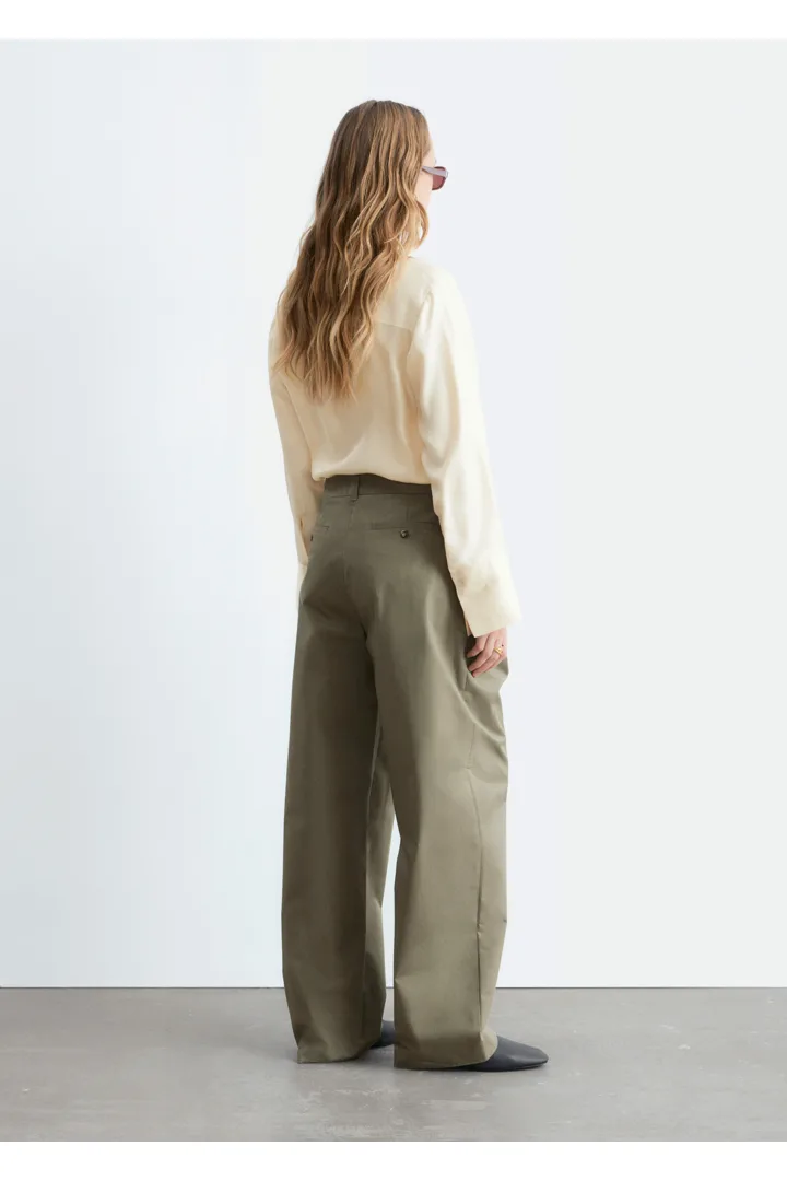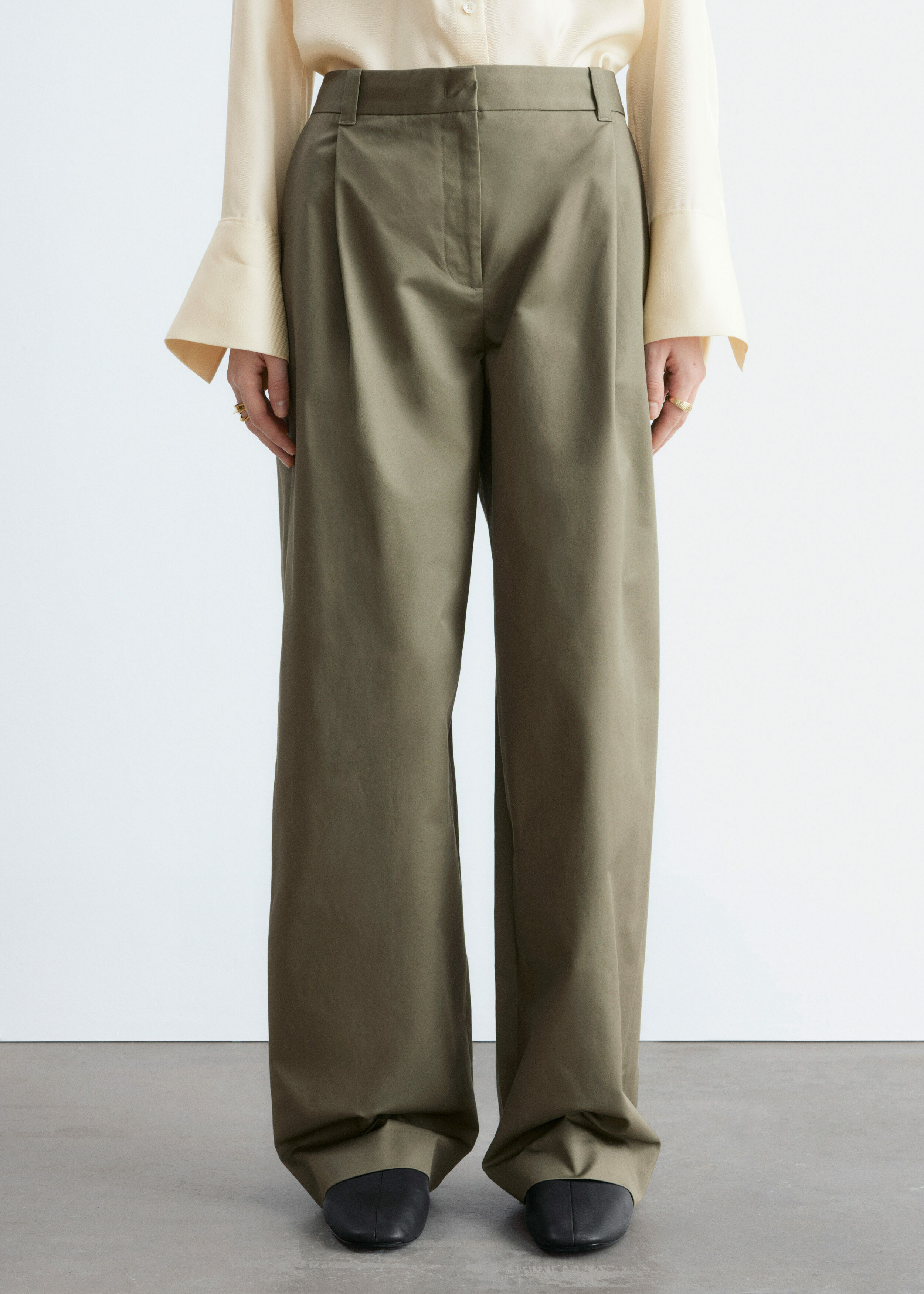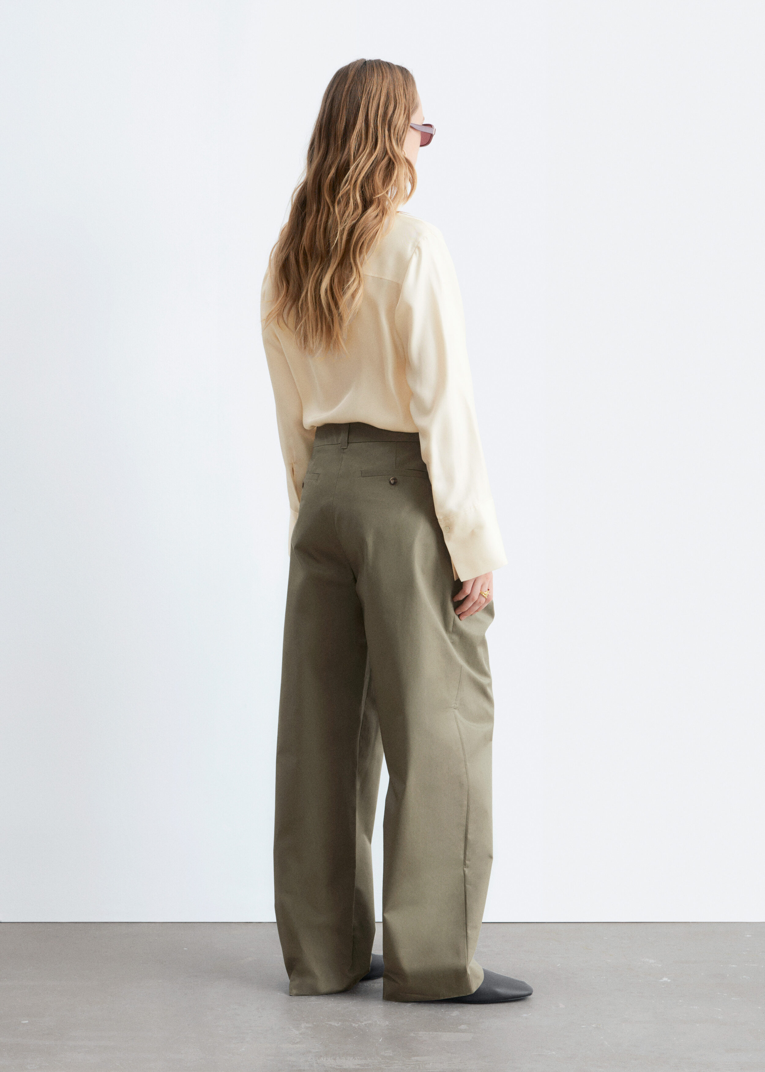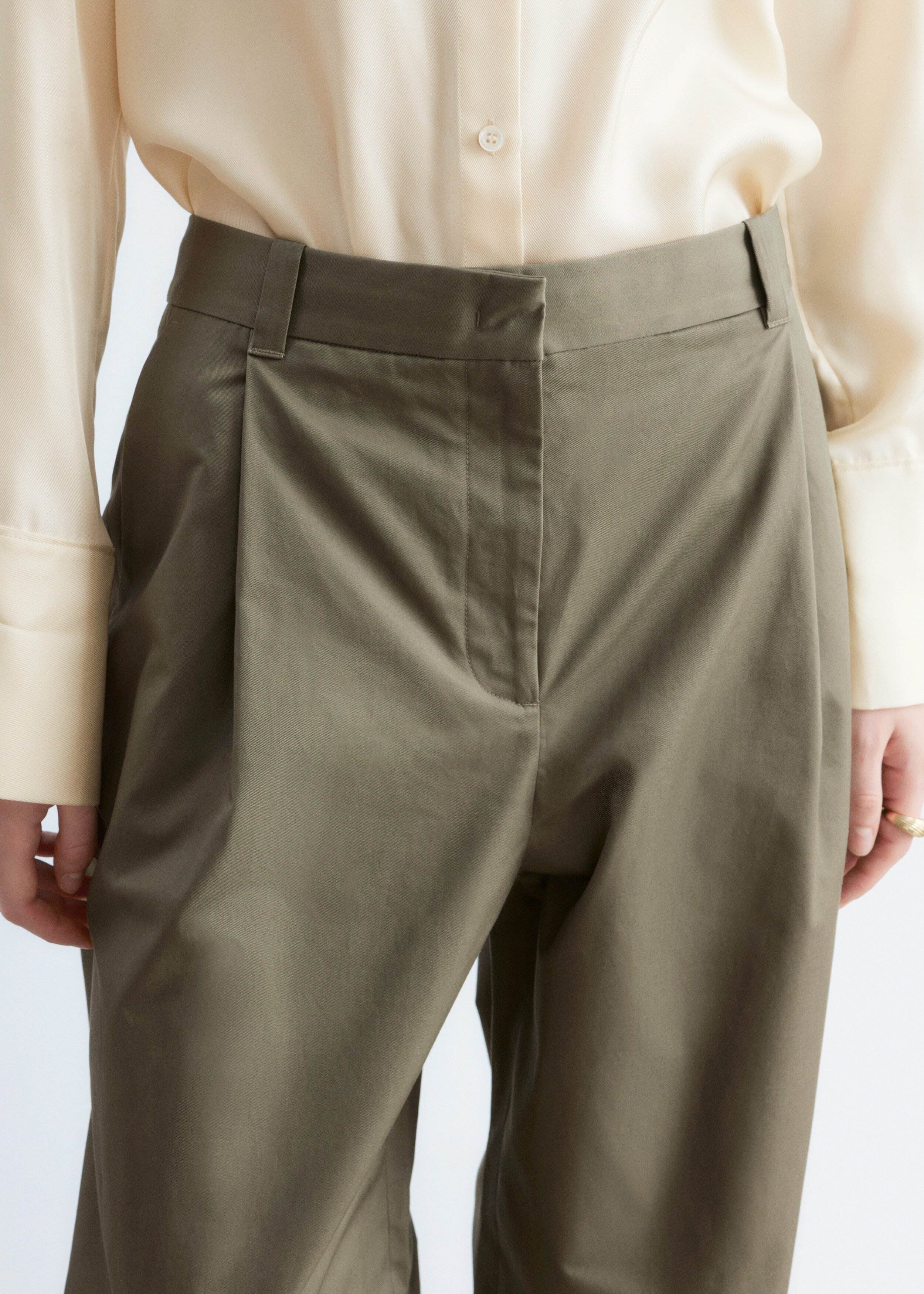 가벼운 코튼 소재의 하이 웨이스트 트라우저예요. 스트레이트 레그와 깔끔한 프레스 플리츠가 특징이며 측면의 솔기 포켓, 뒷면의 웰트 포켓, 앞면의 지퍼와 후크 앤 바 클로저가 자리해 있어요. 산뜻한 티셔츠 또는 테일러드 블라우스와 함께 세련된 룩을 연출해 보세요.