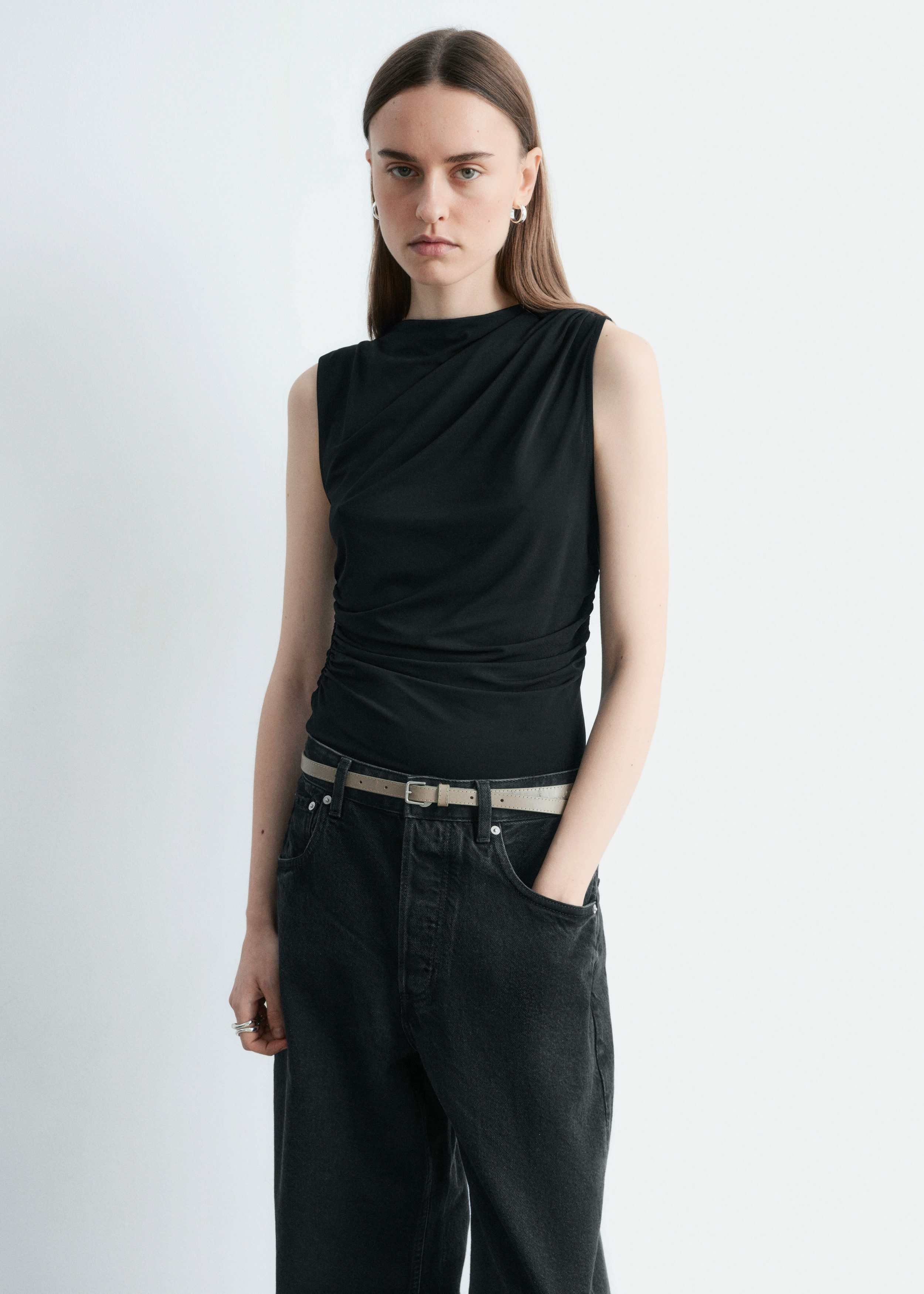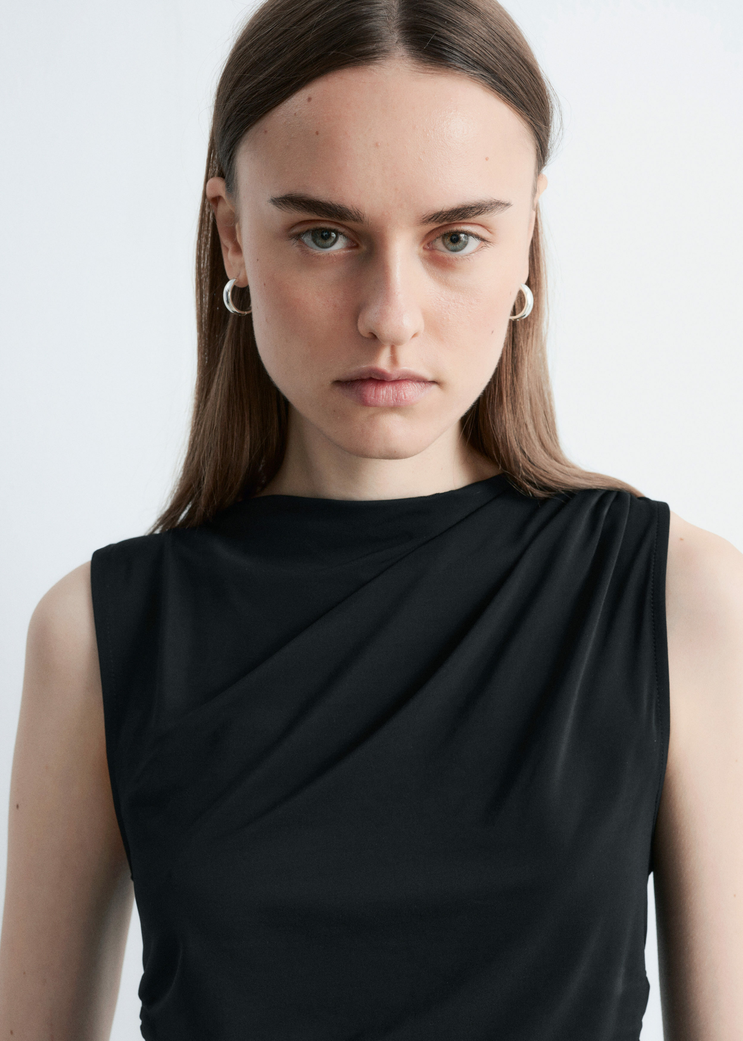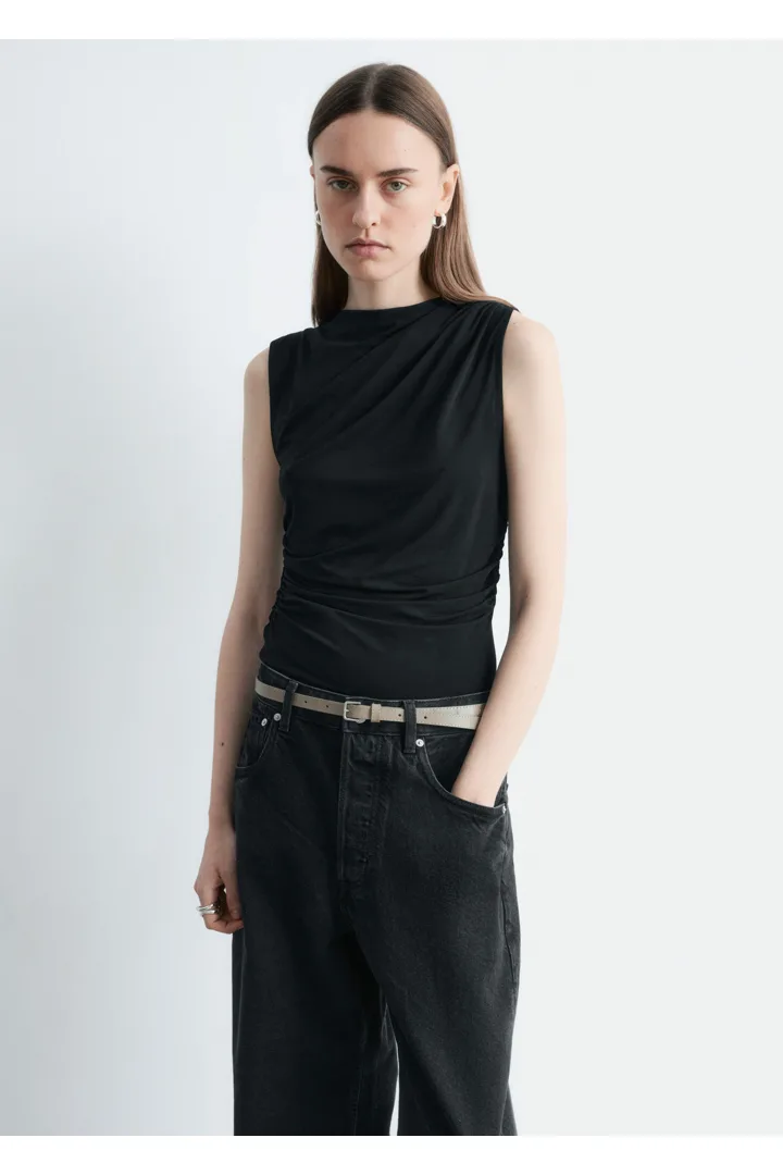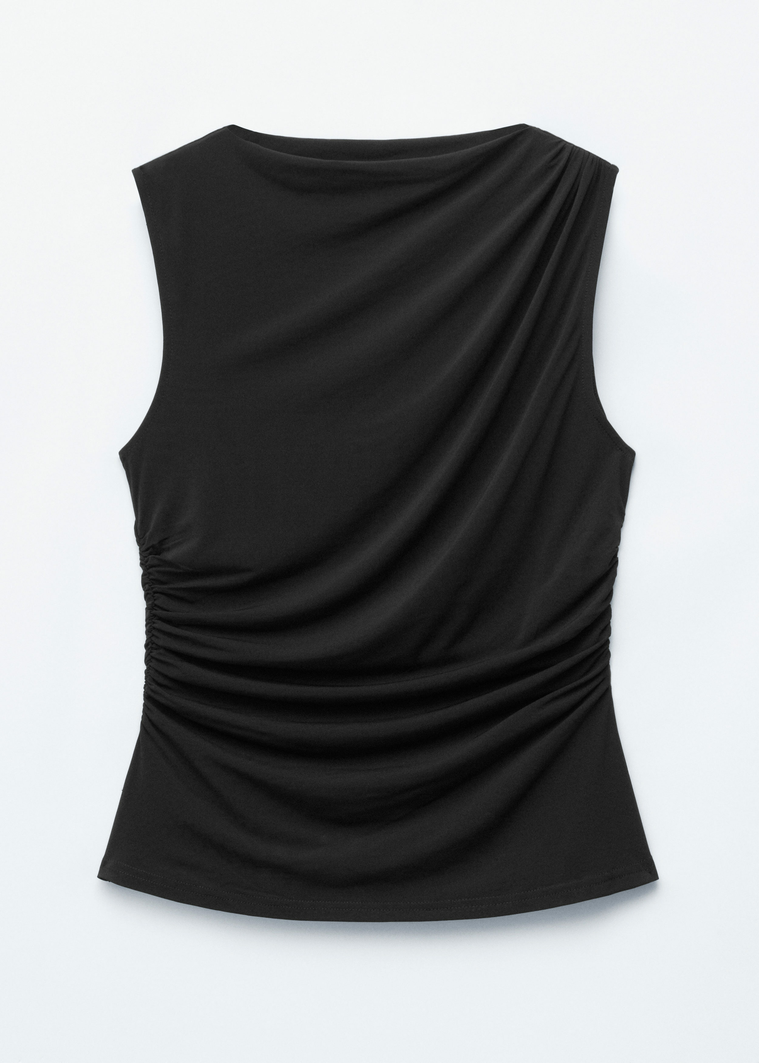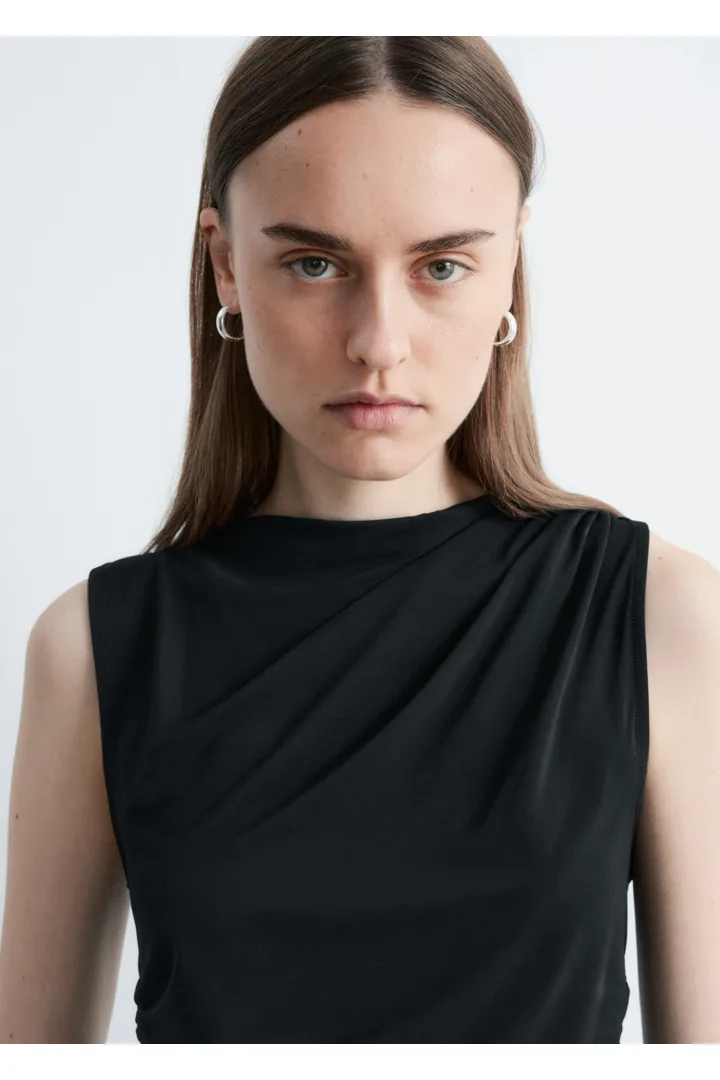 개더링 주름이 잡힌 솔기로 전면 드레이핑 룩을 연출하는 슬리브리스 탑이에요. 유려하게 흐르는 저지 소재로 탄생하여 드레이프가 더욱 멋스럽답니다. 보트 네크라인, 그리고 둥근 헴라인이 특징이에요.
