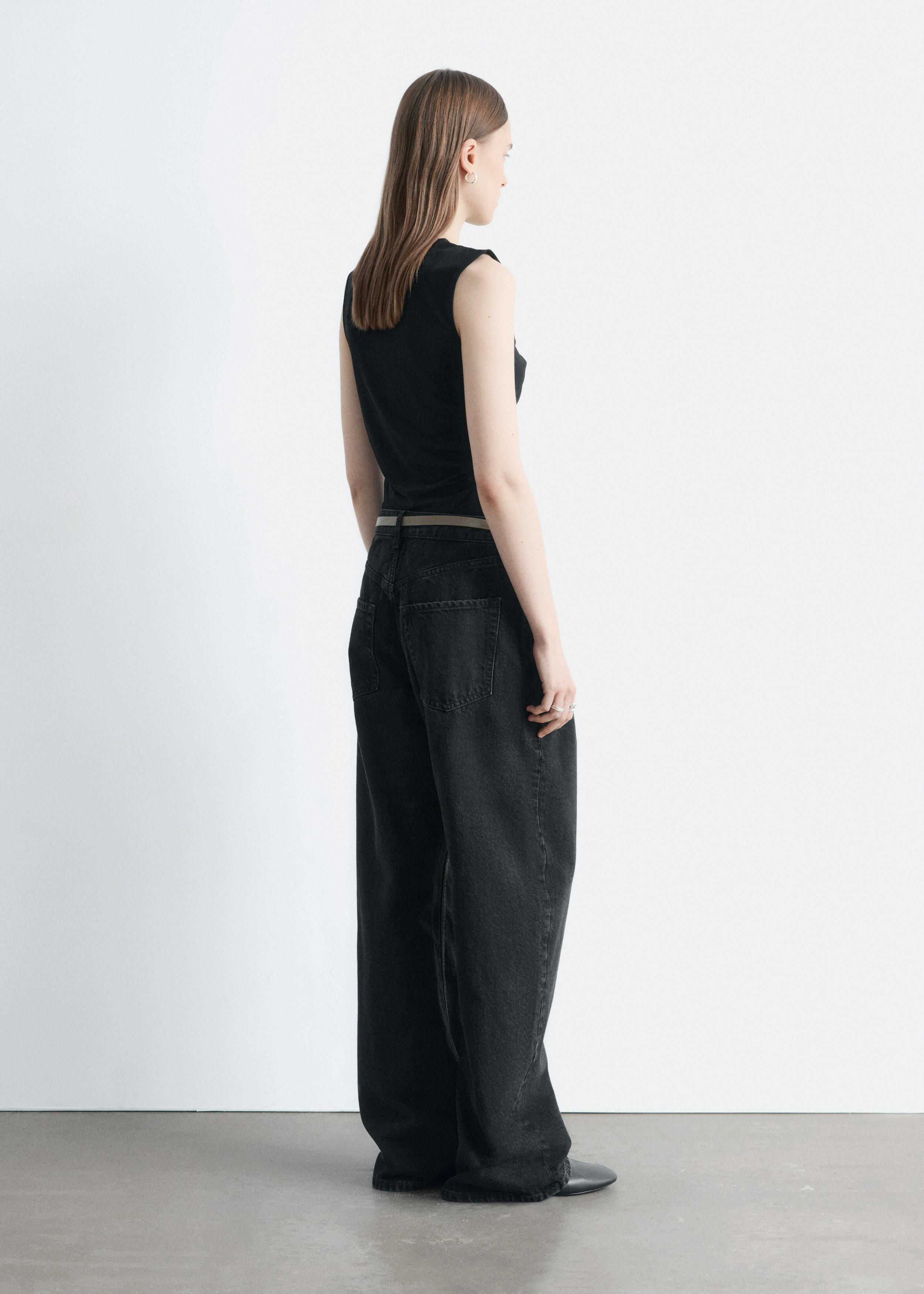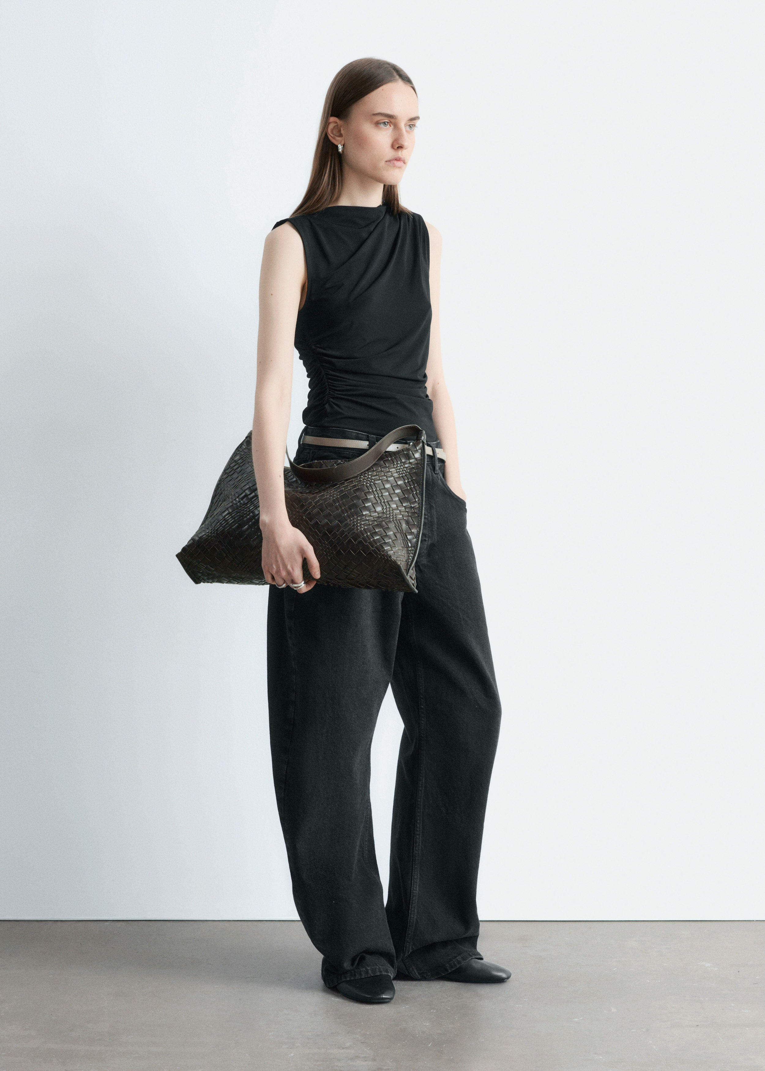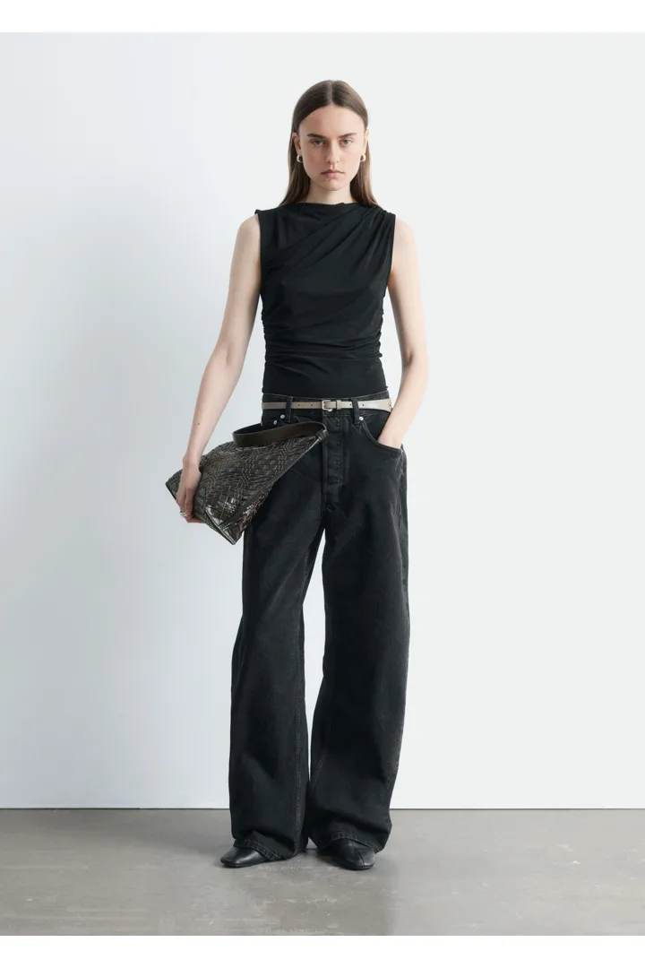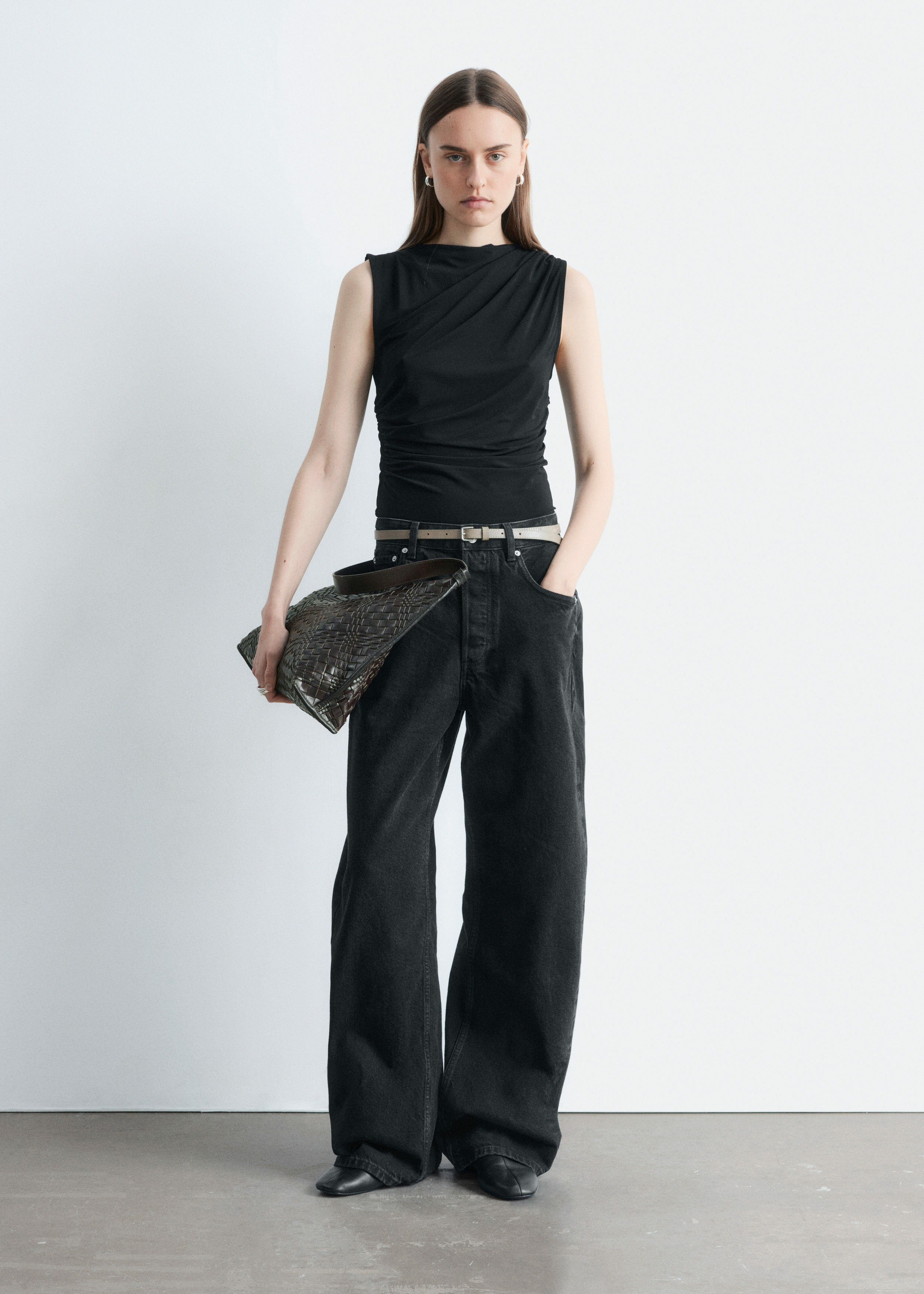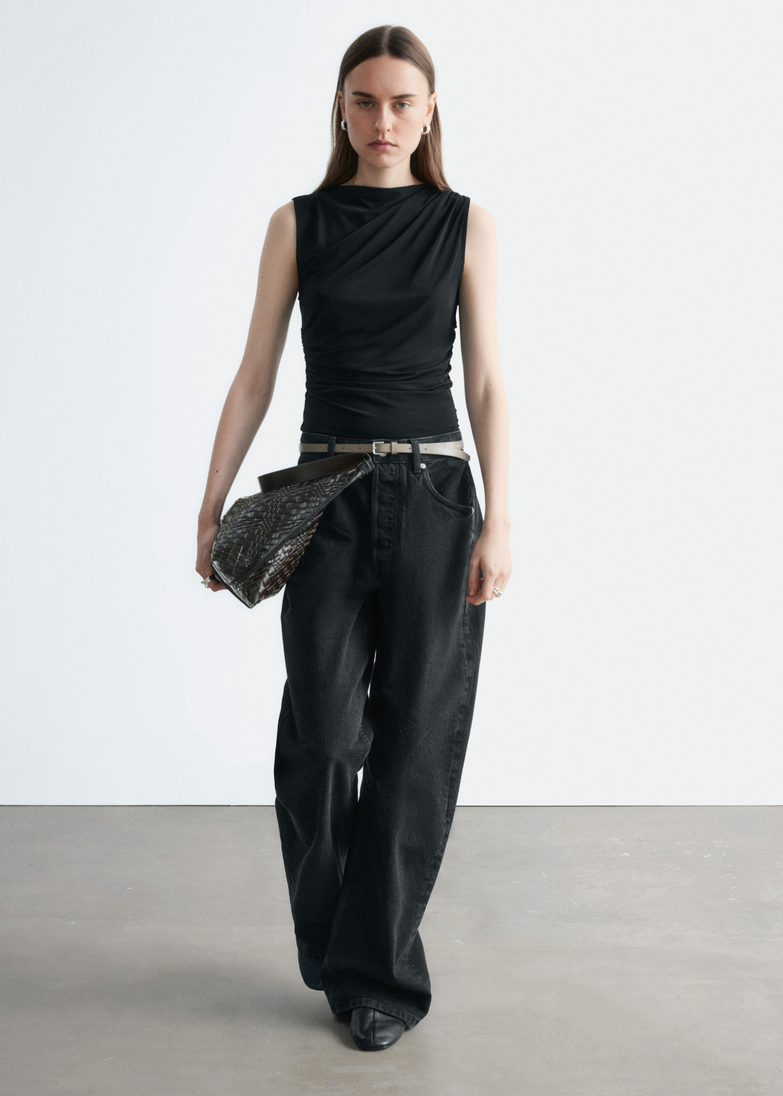 개더링 주름이 잡힌 솔기로 전면 드레이핑 룩을 연출하는 슬리브리스 탑이에요. 유려하게 흐르는 저지 소재로 탄생하여 드레이프가 더욱 멋스럽답니다. 보트 네크라인, 그리고 둥근 헴라인이 특징이에요.
