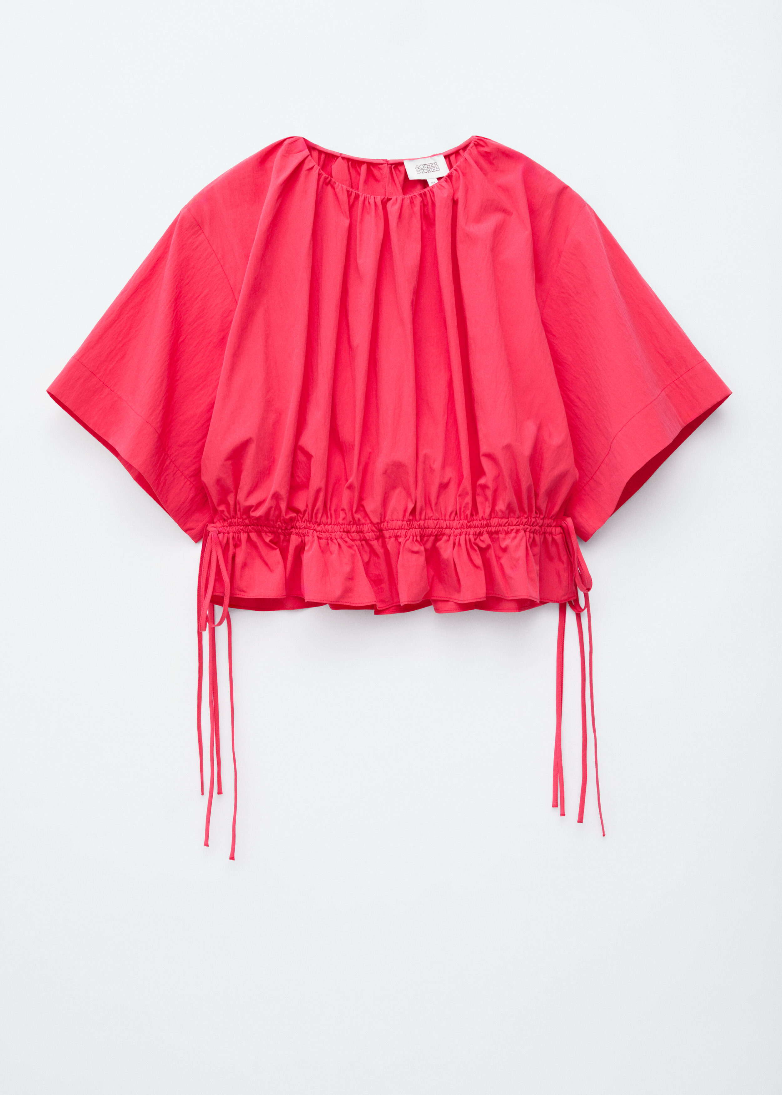 가볍고 편안한 감각을 선사하는 코튼 혼방 쇼트 슬리브 탑이에요. 네크라인의 셔링, 그리고 뒷면 중앙의 키홀 및 버튼이 특징이랍니다. 동일 소재의 타이로 조절 가능한 드로스트링이 허리에 자리해 있어 핏 조절이 용이해요.
