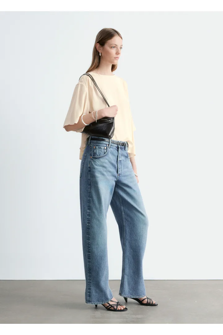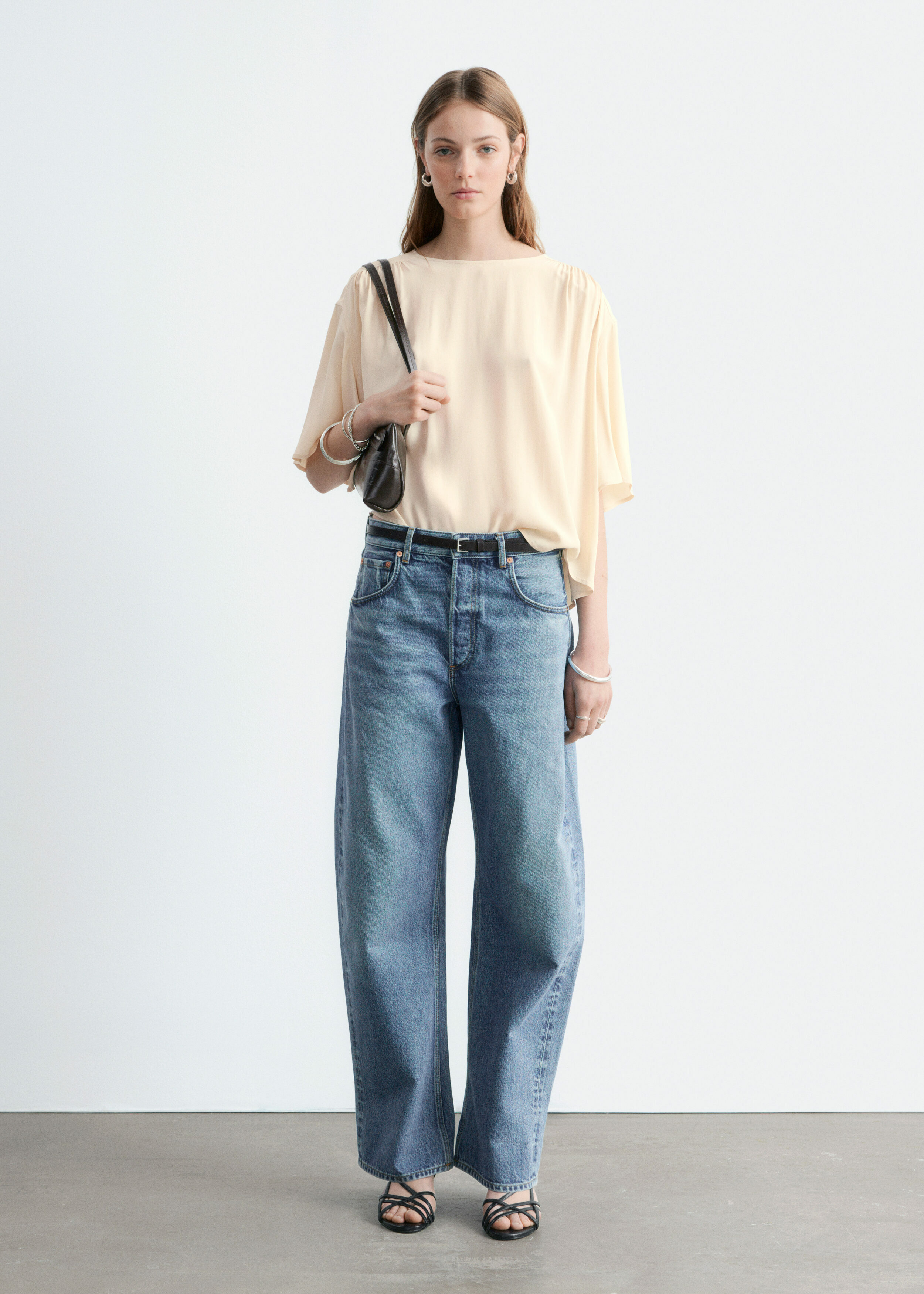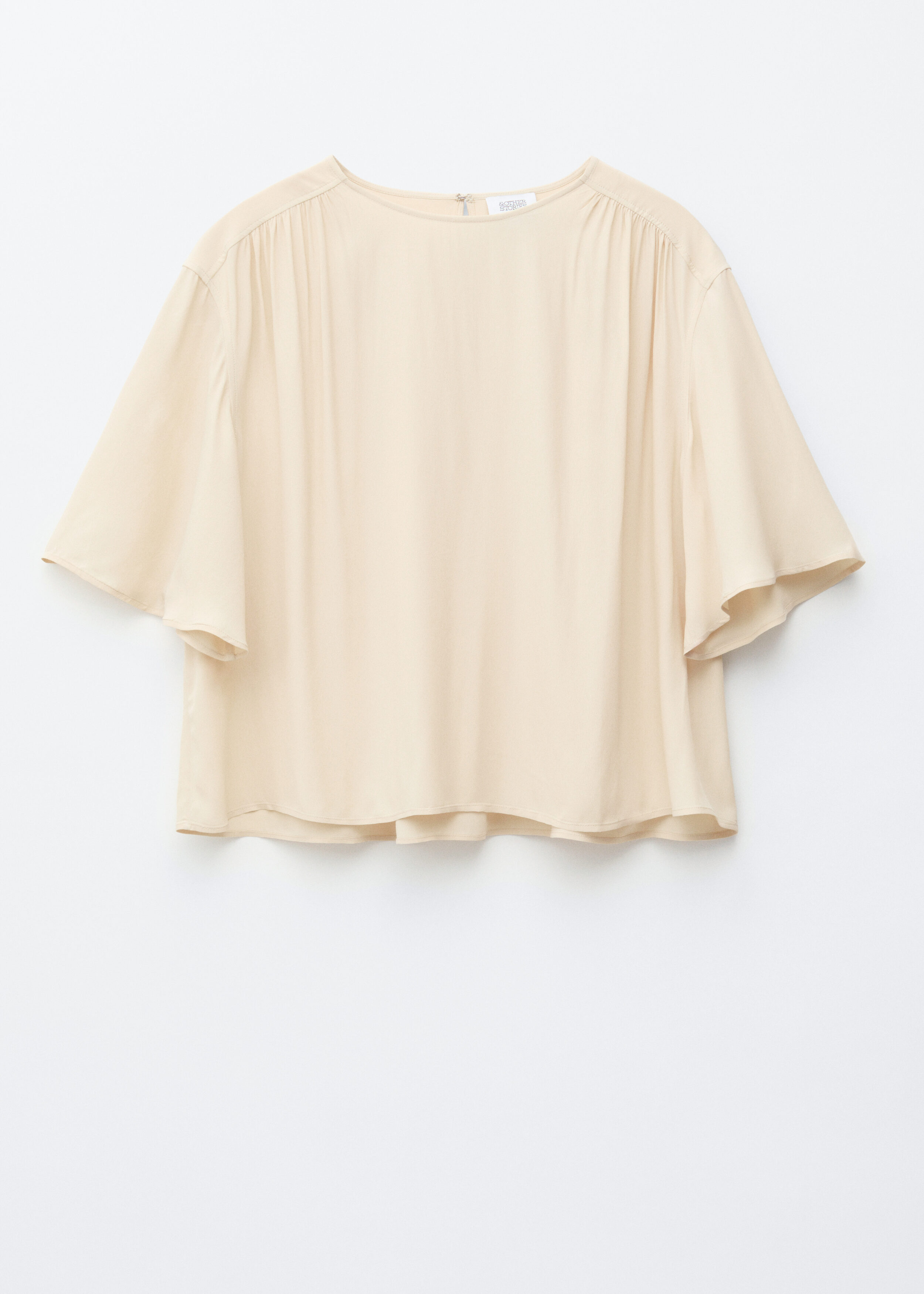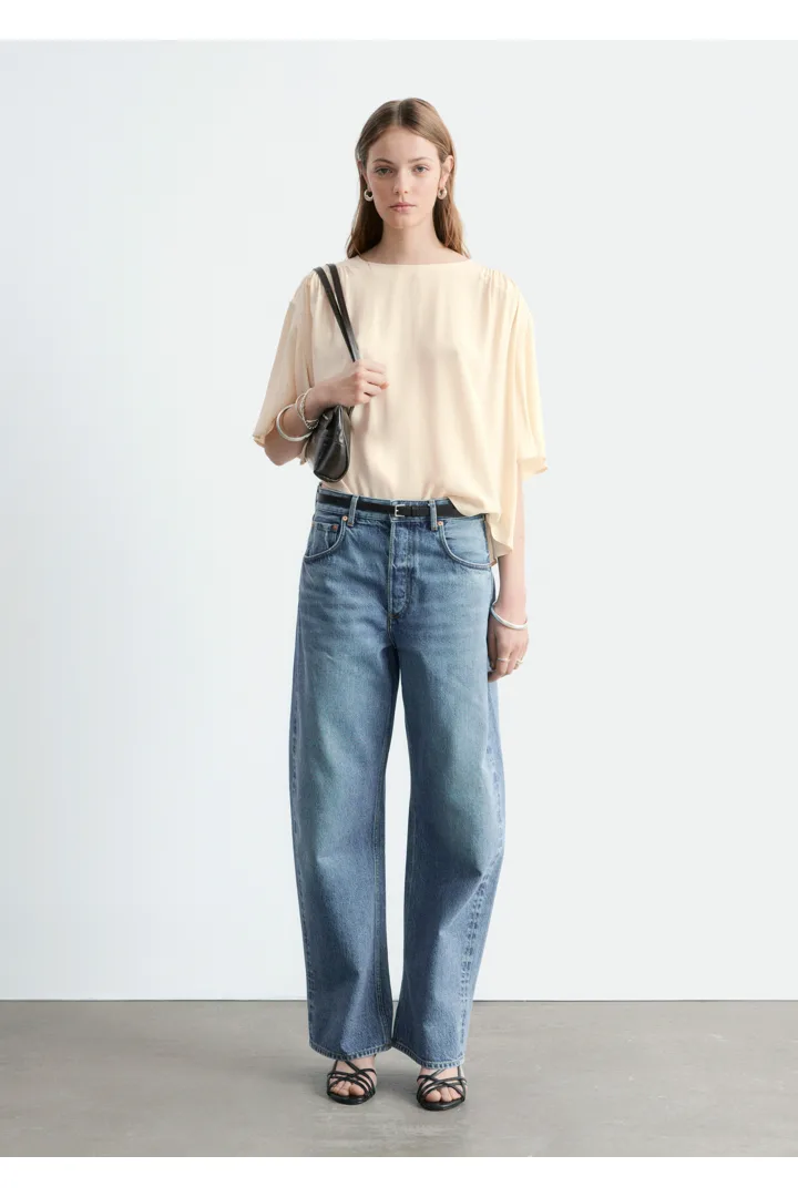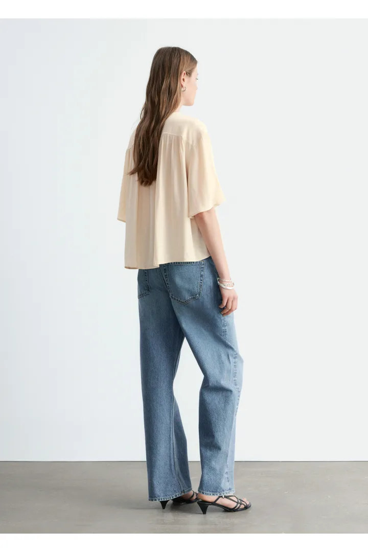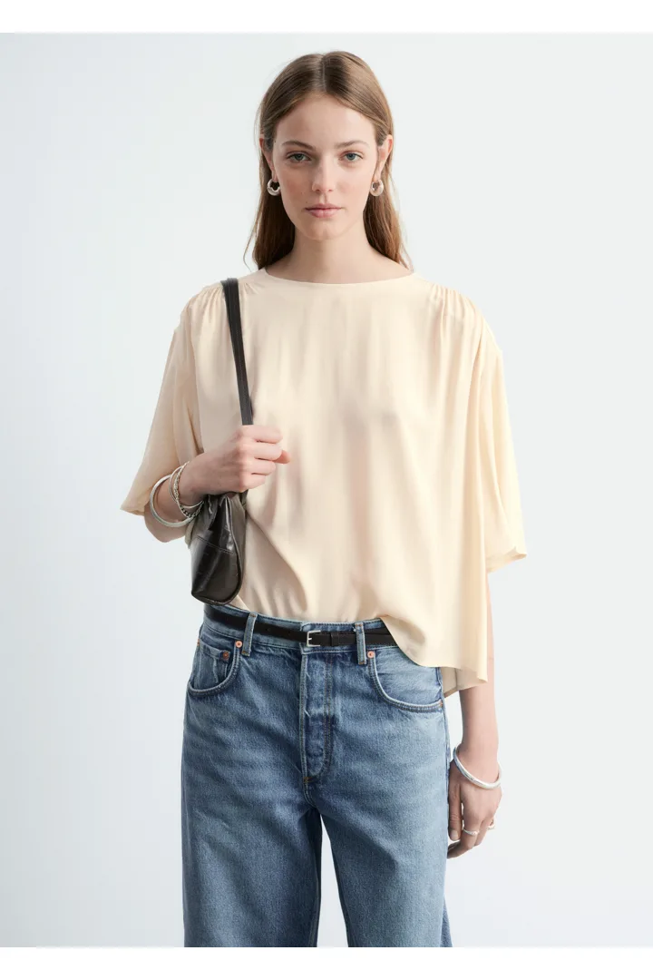 유려한 크레이프 소재로 탄생한 블라우스예요. 라운드 넥, 쇼트 슬리브, 오버사이즈 실루엣, 그리고 부드럽고 매끄러운 드레이프를 연출하는 은은한 셔링이 특징이랍니다. 데님 또는 테일러드 하의와 함께 스타일링해 보세요.