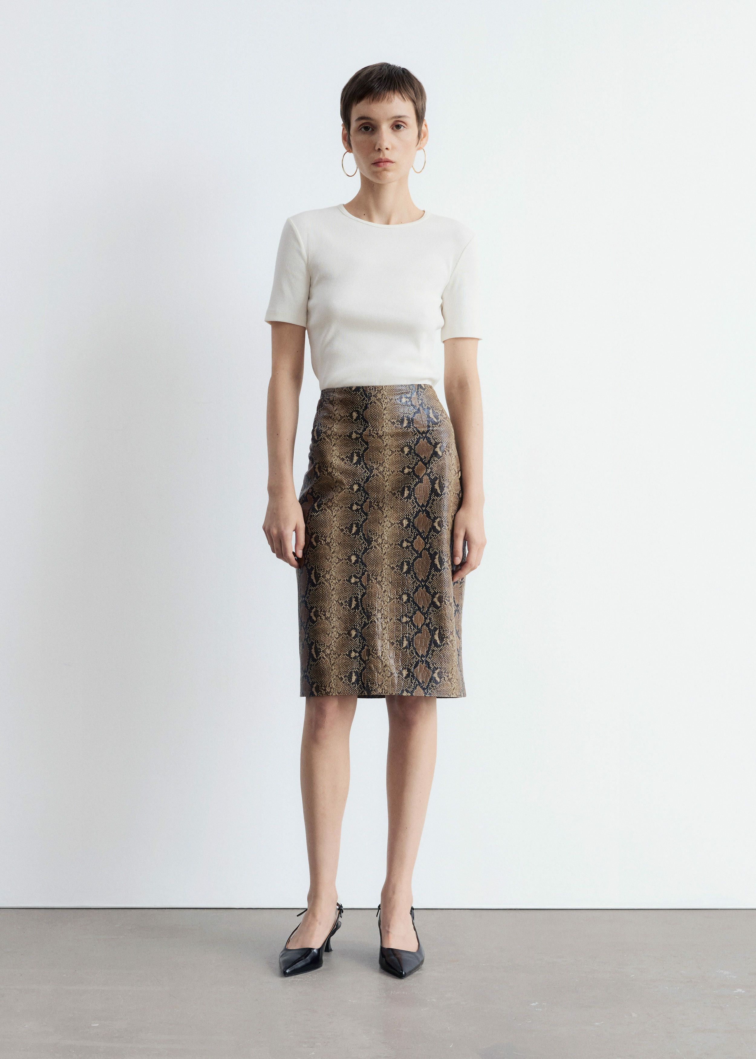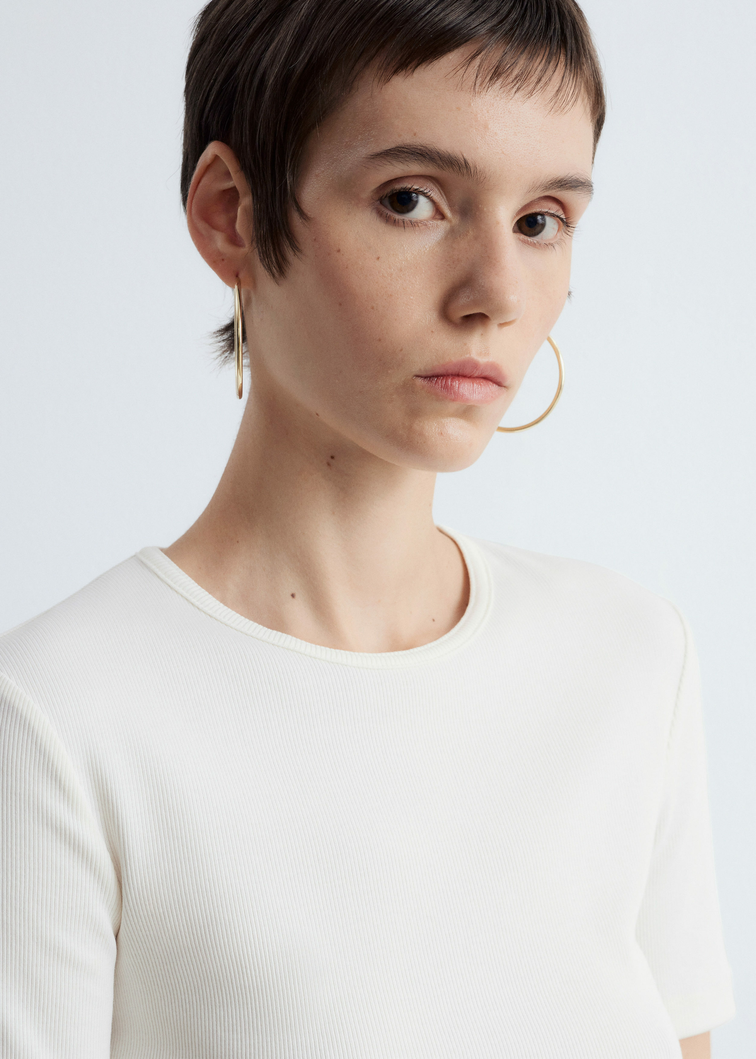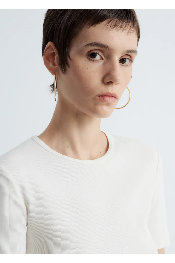 부드럽고 신축성 좋은 코튼 혼방 소재의 립 티셔츠예요. 슬림한 실루엣, 라운드 넥, 쇼트 슬리브가 특징이에요. 데님 진 또는 미니 스커트와 매치해 보세요.
