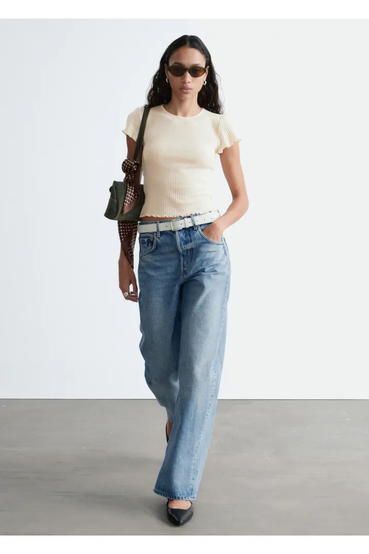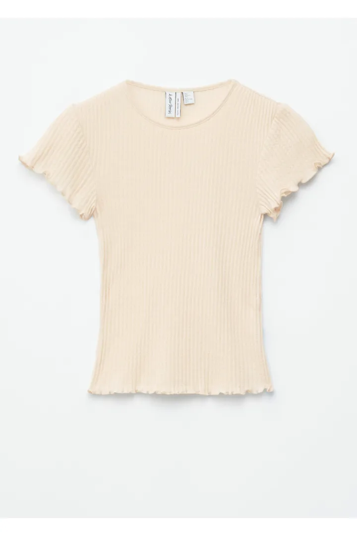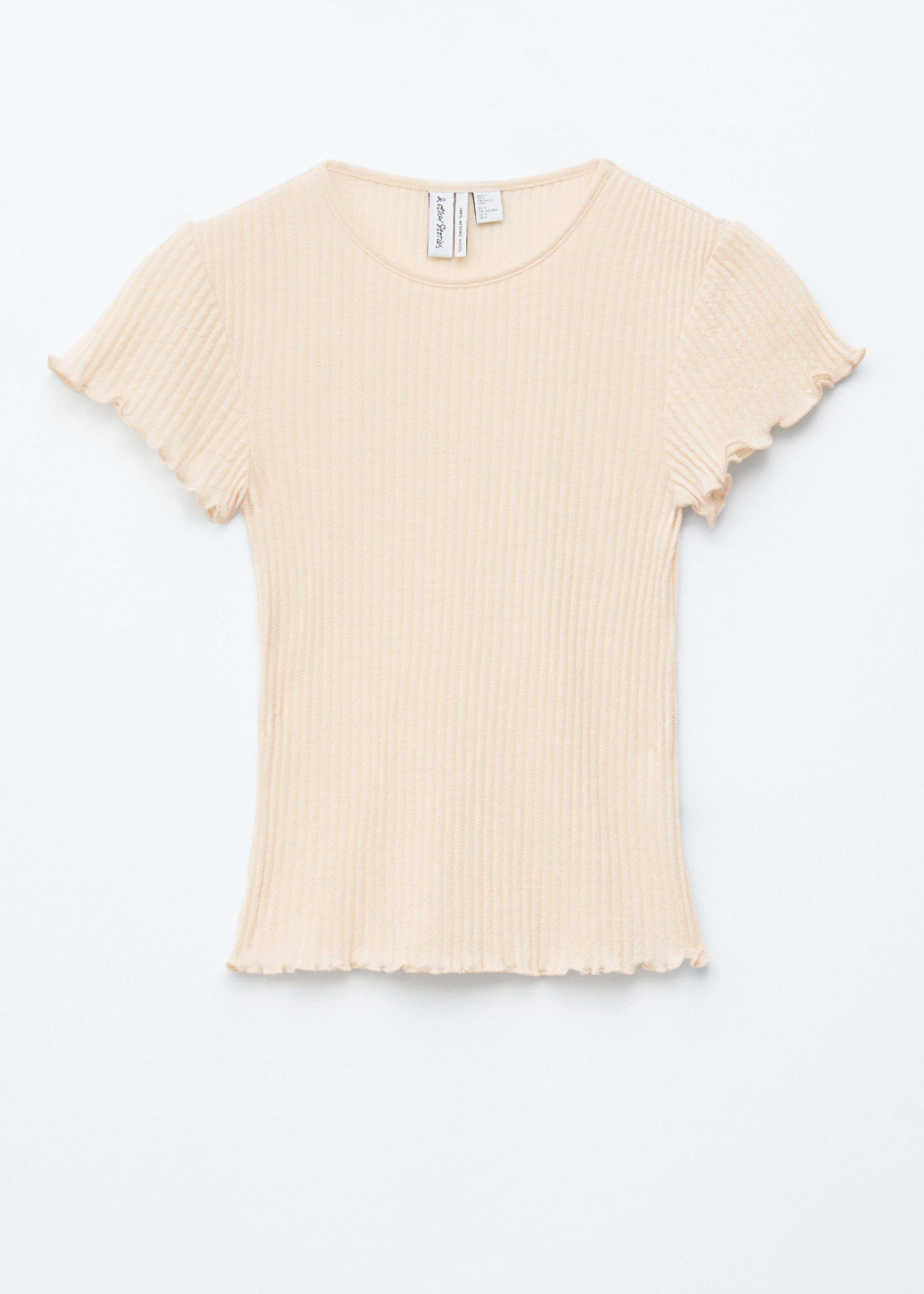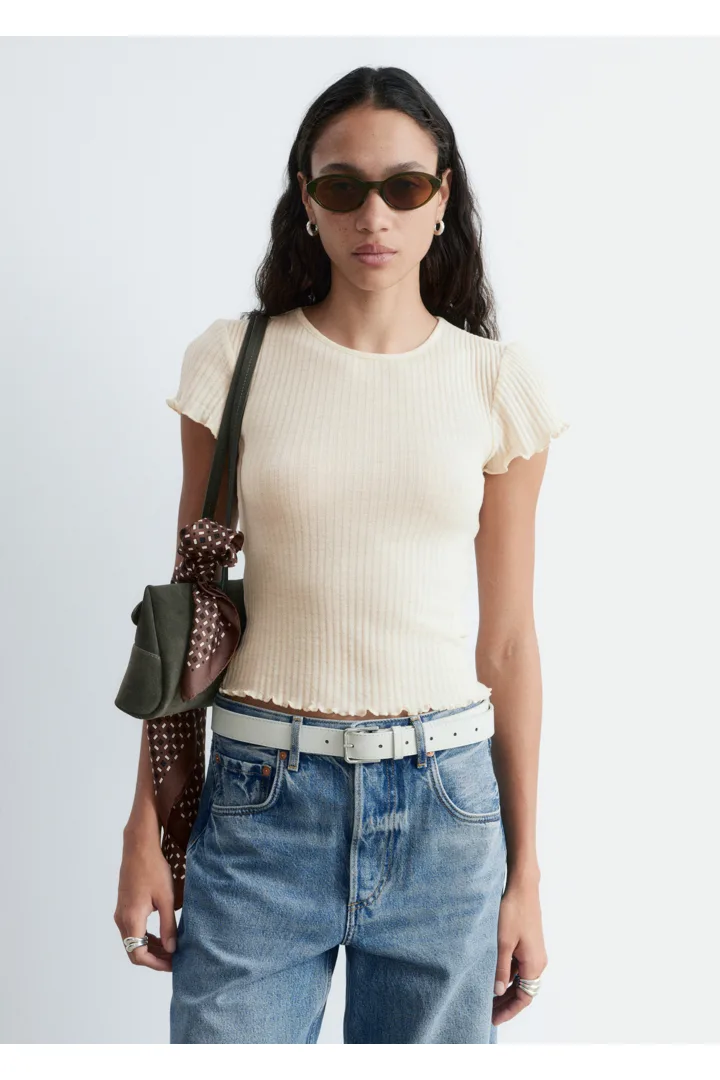 립 텍스처의 얇은 저지 울로 탄생한 티셔츠예요. 핏 되는 실루엣과 섬세한 캡 슬리브, 전면 스캘럽 트리밍이 매력적이랍니다.