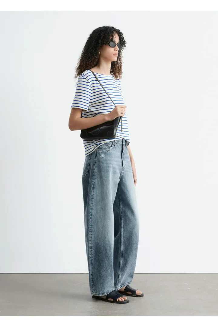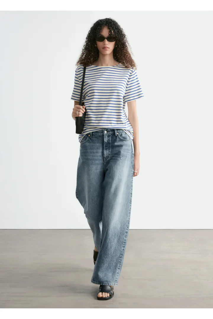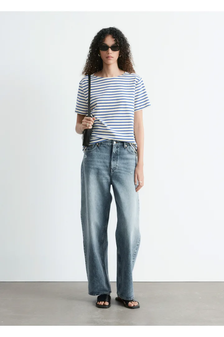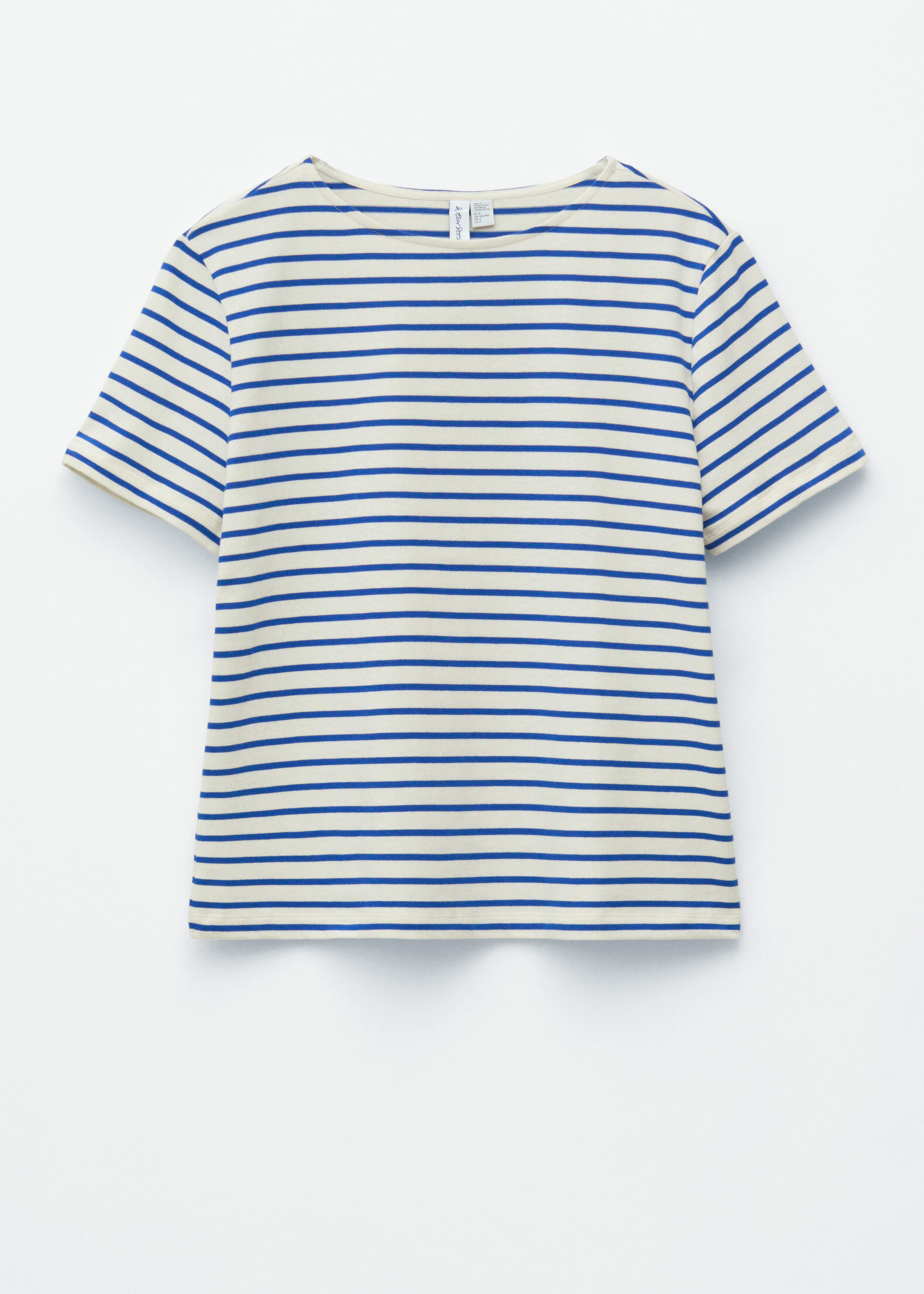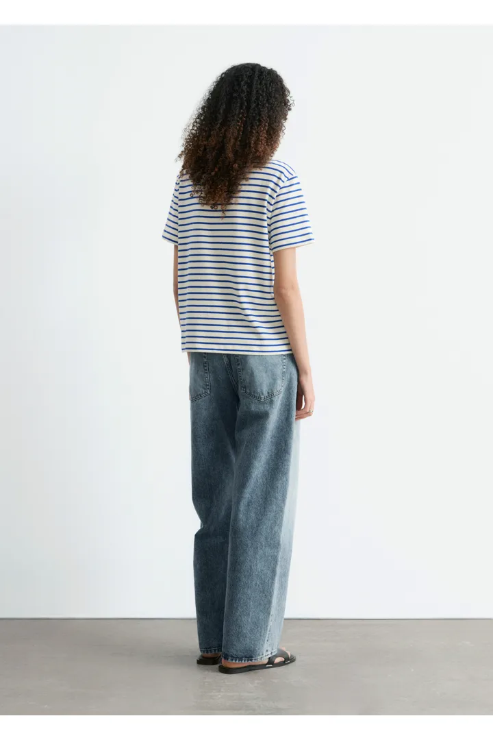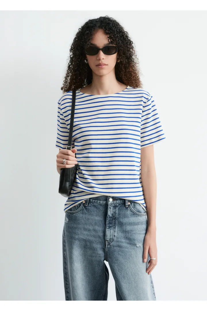 스트라이프 티셔츠예요. 쇼트 슬리브, 레귤러 핏 바디, 라운드 네크라인이 자리해 있답니다.