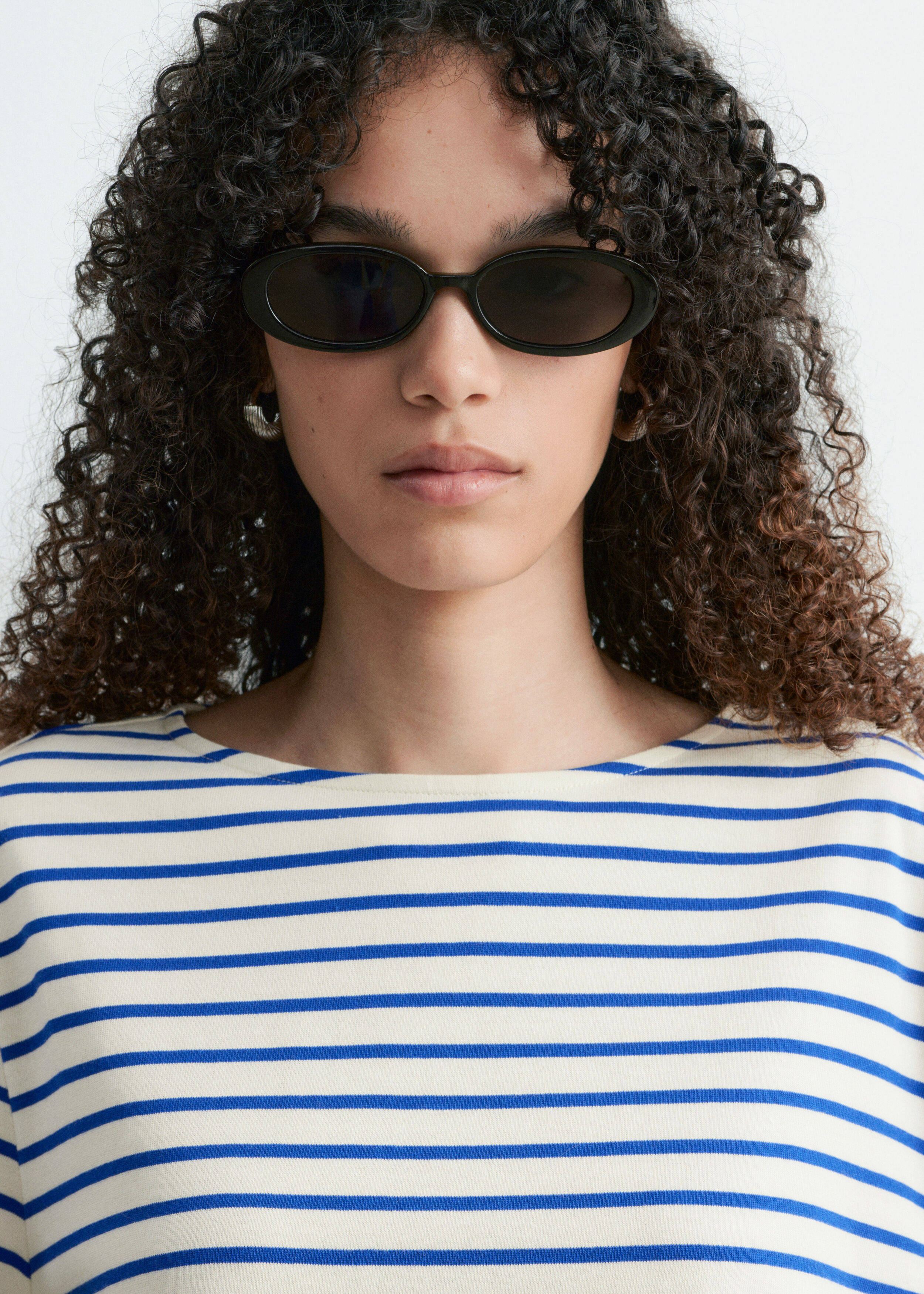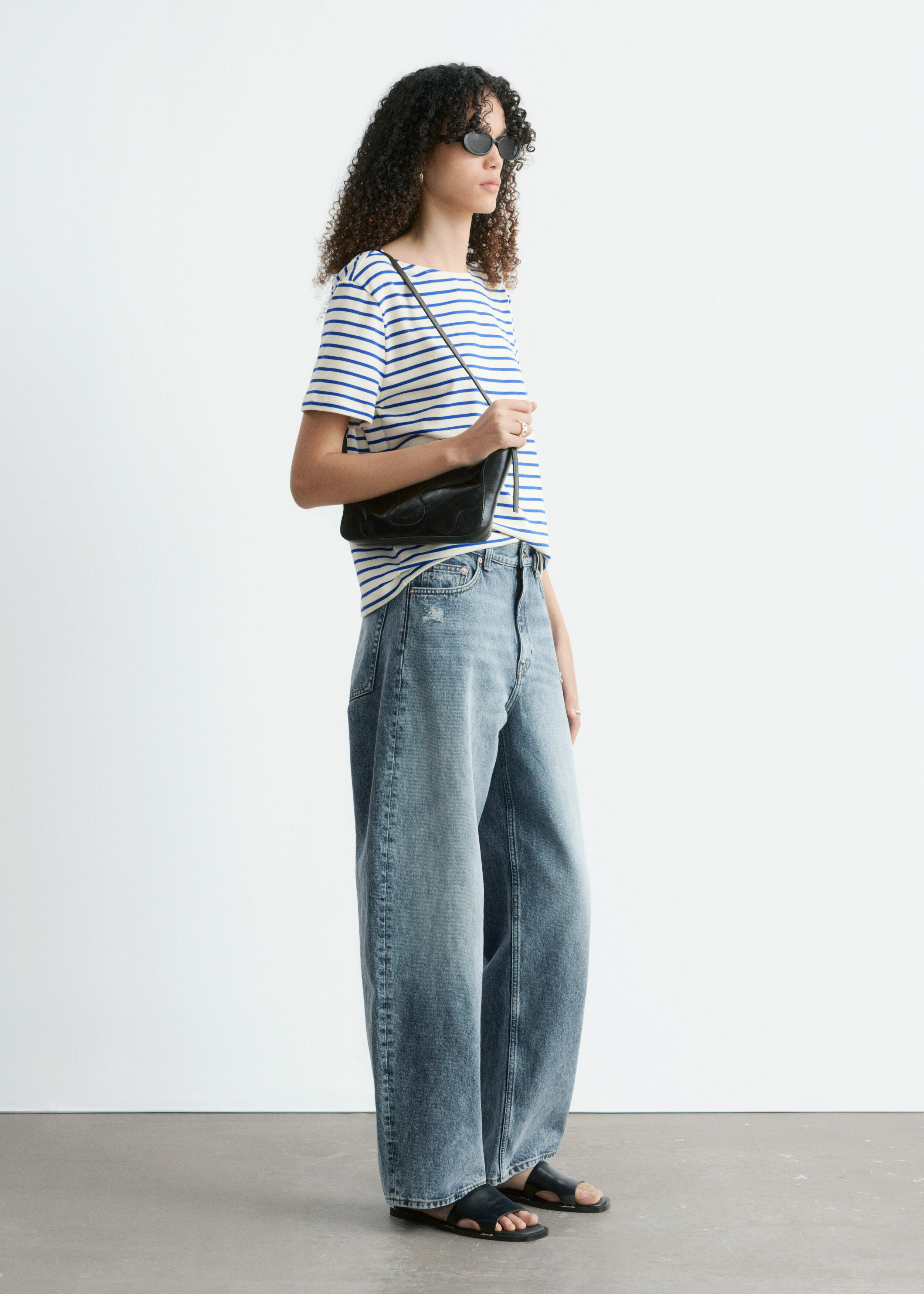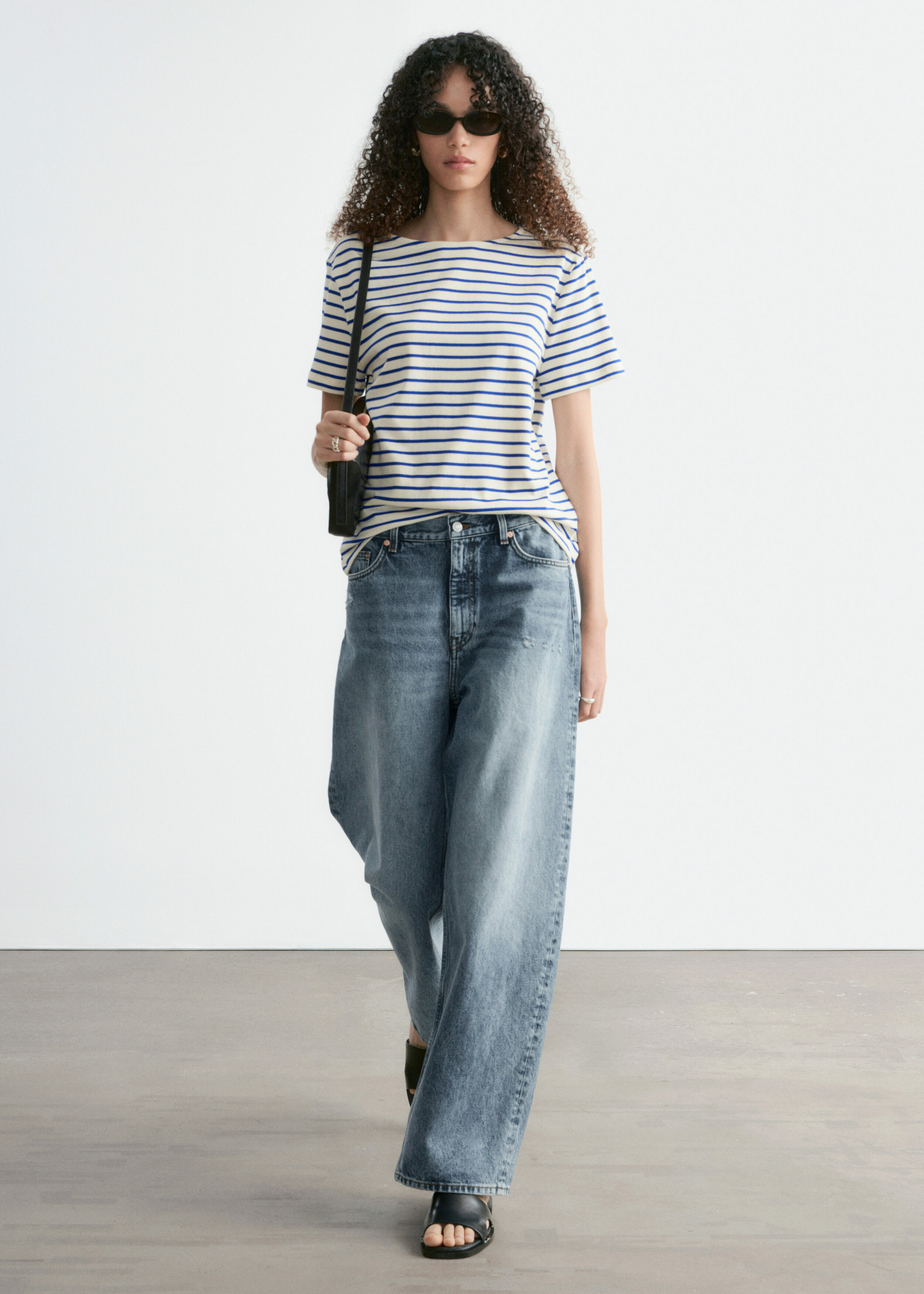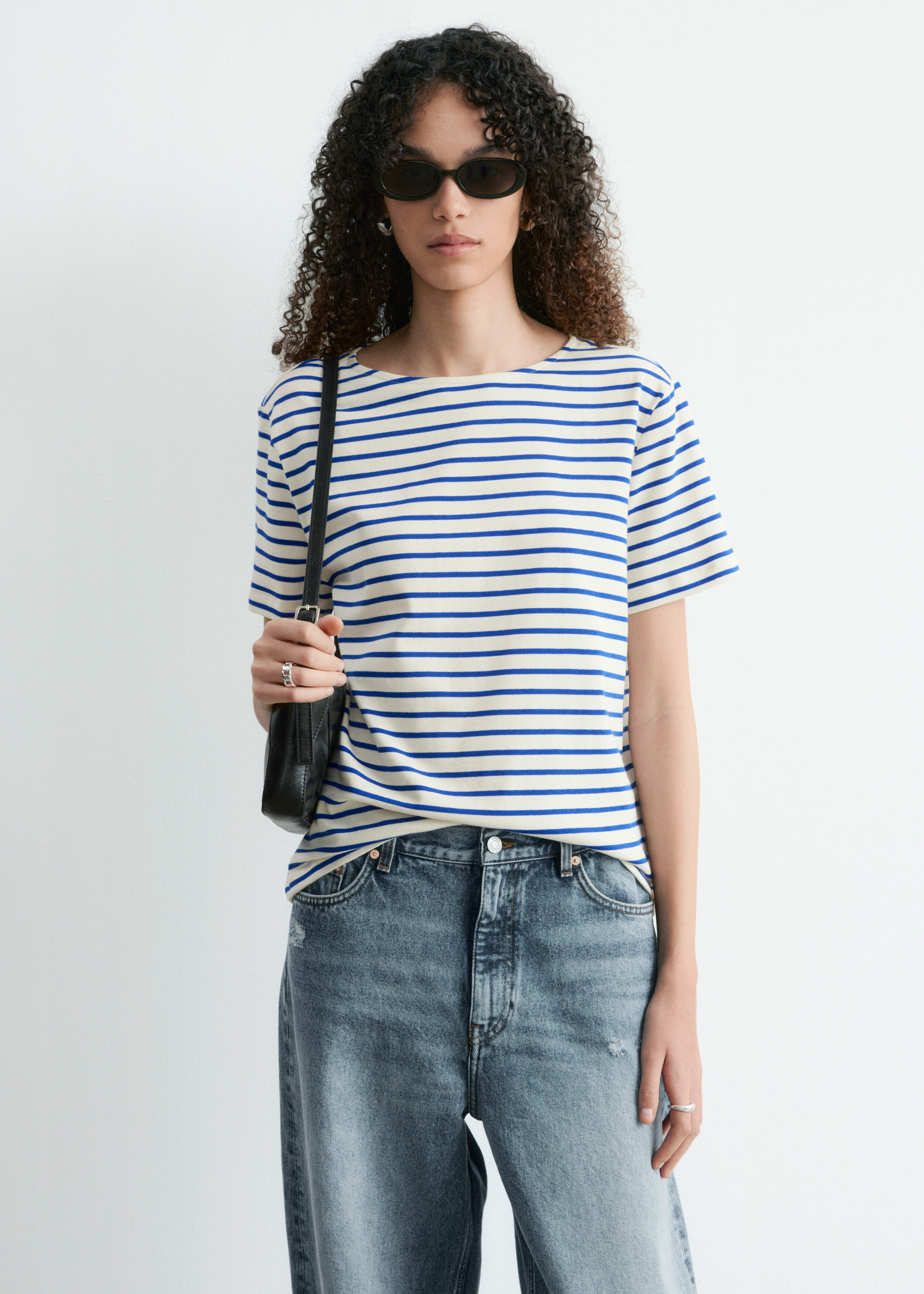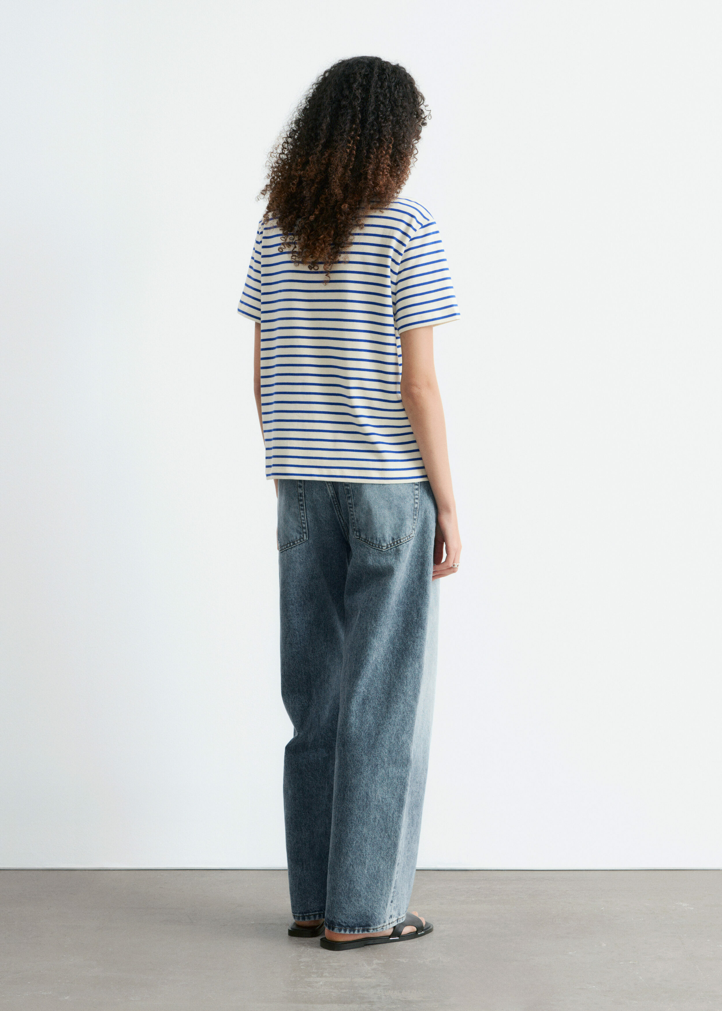 스트라이프 티셔츠예요. 쇼트 슬리브, 레귤러 핏 바디, 라운드 네크라인이 자리해 있답니다.