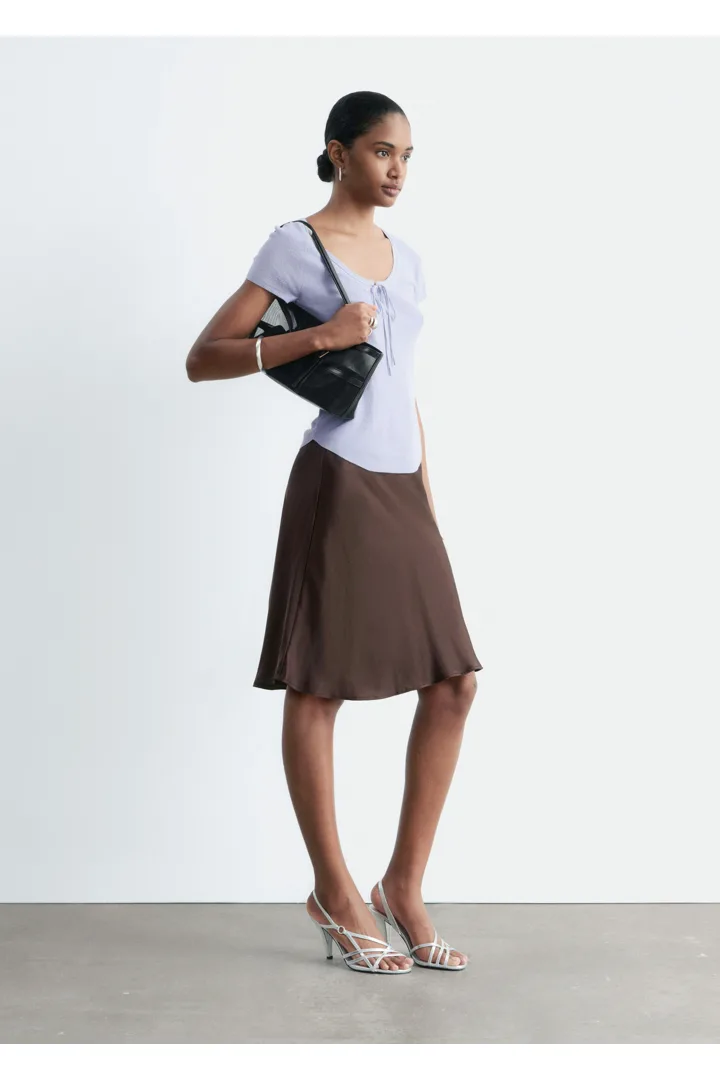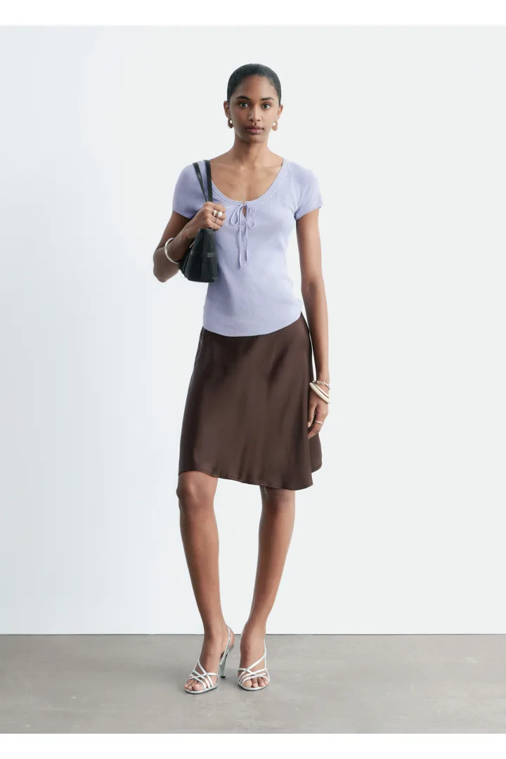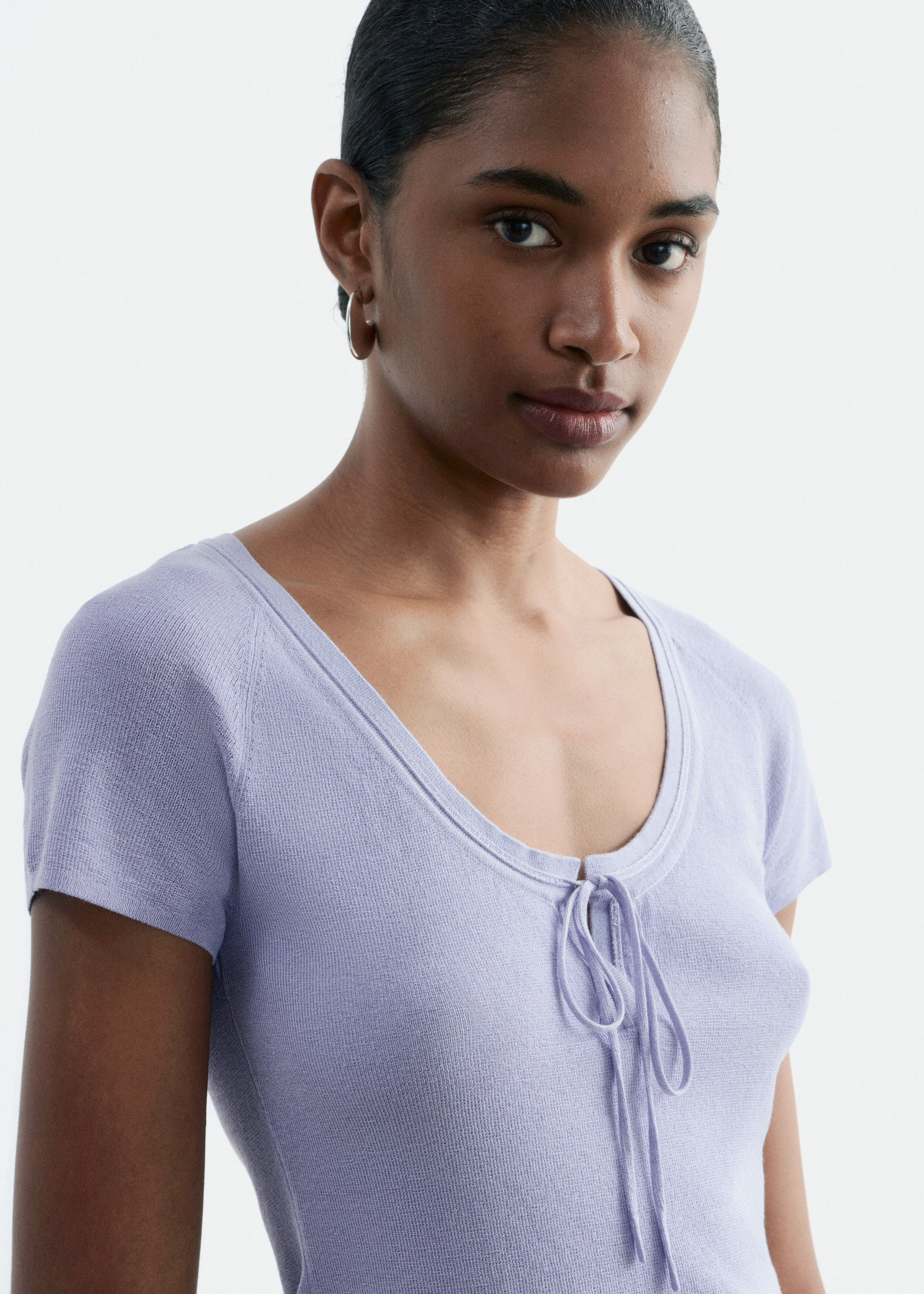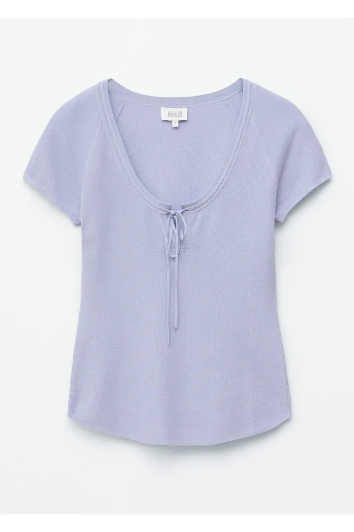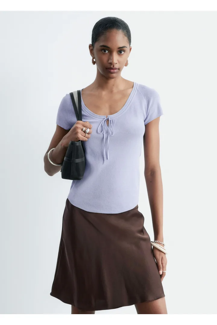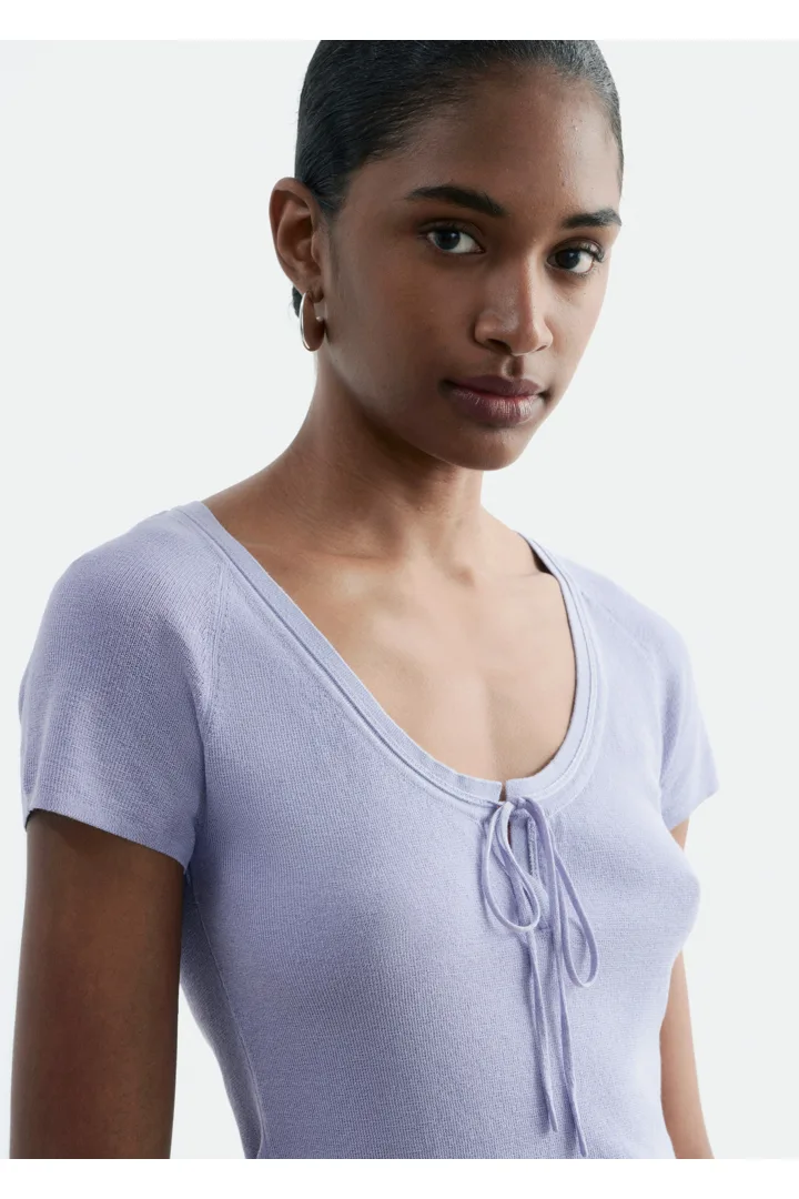 부드럽고 유연한 감각의 비스코스 혼방 니트로 탄생한 탑이에요. 앞면 중앙의 키홀 디테일과 타이가 특징이에요. 레글란 쇼트 슬리브, 립 트리밍, 곡선형 밑단이 자리해 있답니다.