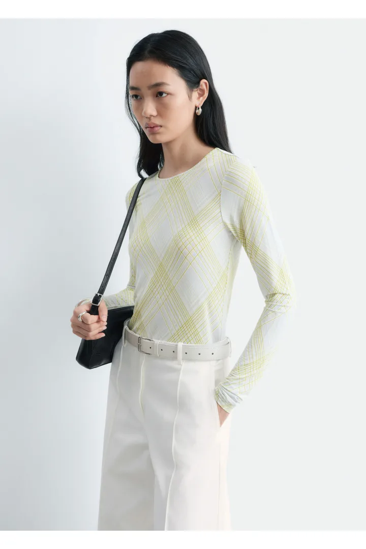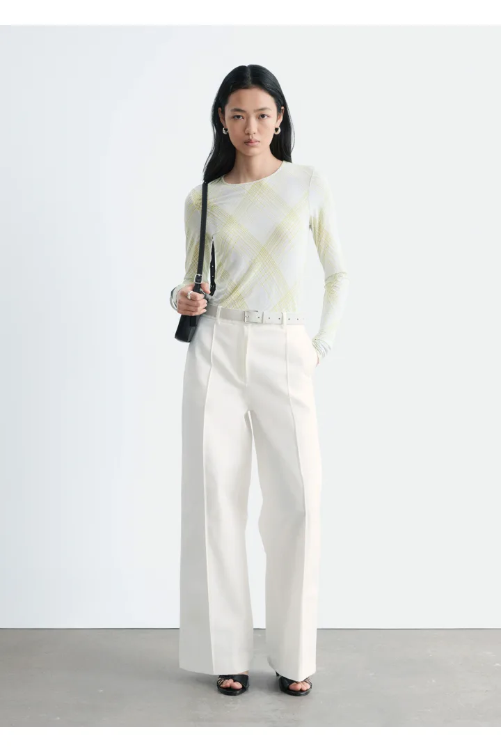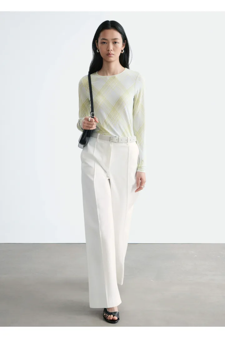 부드러운 저지 소재의 롱 슬리브 탑이에요. 스트레이트 실루엣과 라운드 네크라인이 특징이며, 테일러드 피스 또는 클래식 데님과 매치해 보세요.