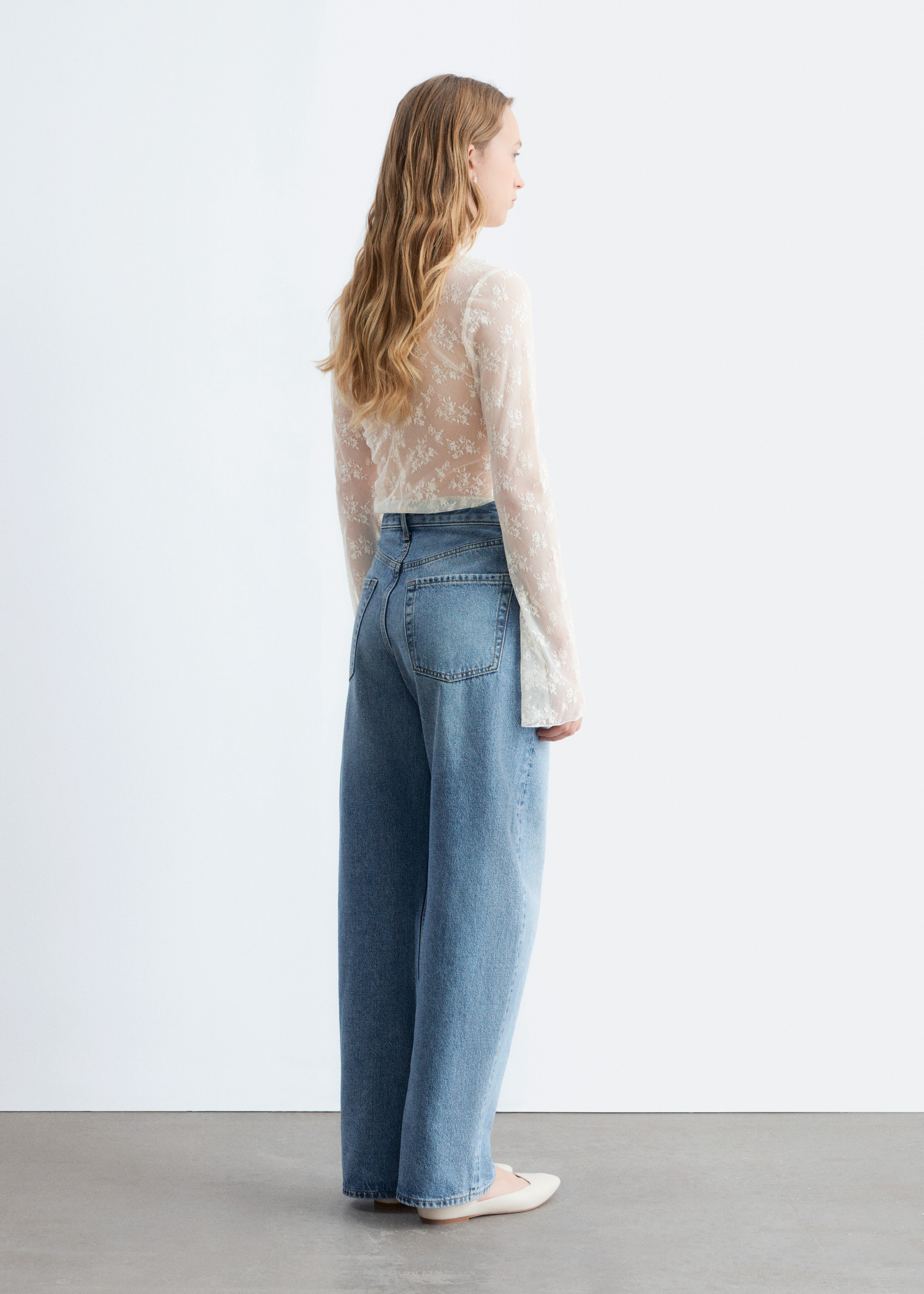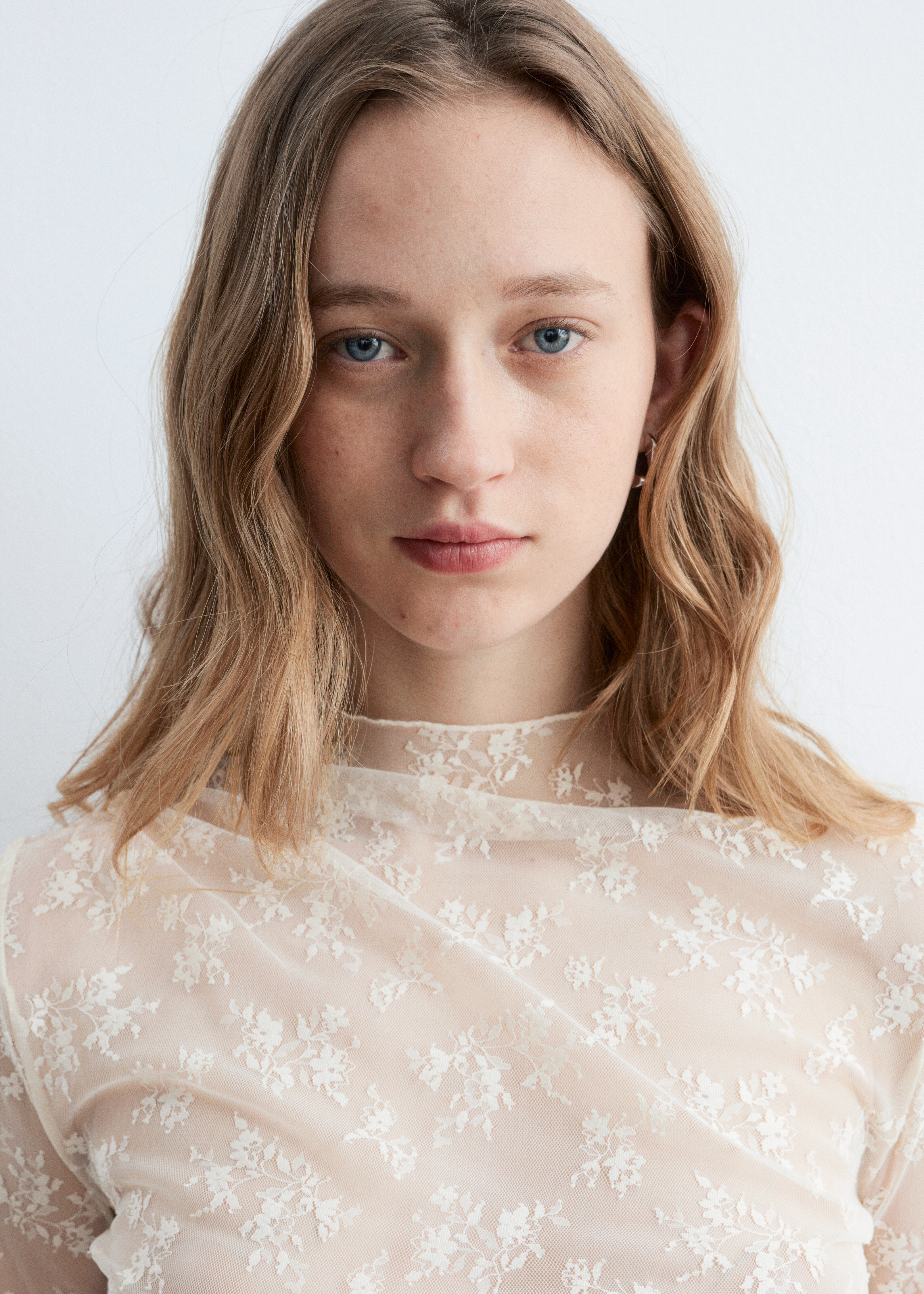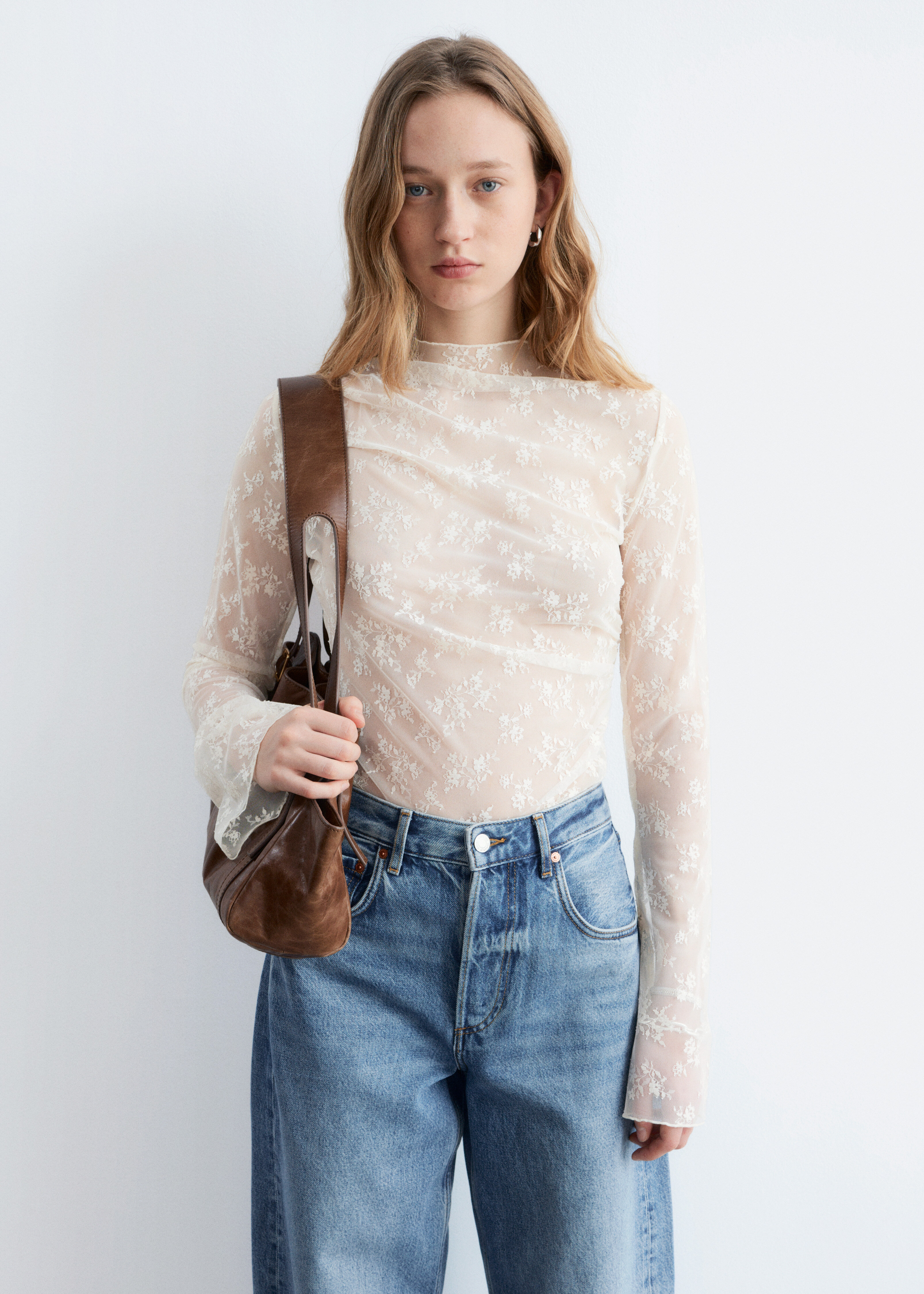 시어 마감의 섬세한 레이스로 탄생한 탑이에요. 플로럴 패턴 장식, 슬림한 실루엣, 모크 넥, 롱 플루트 슬리브, 그리고 숄더와 허리라인의 개더링 주름이 특징이에요.