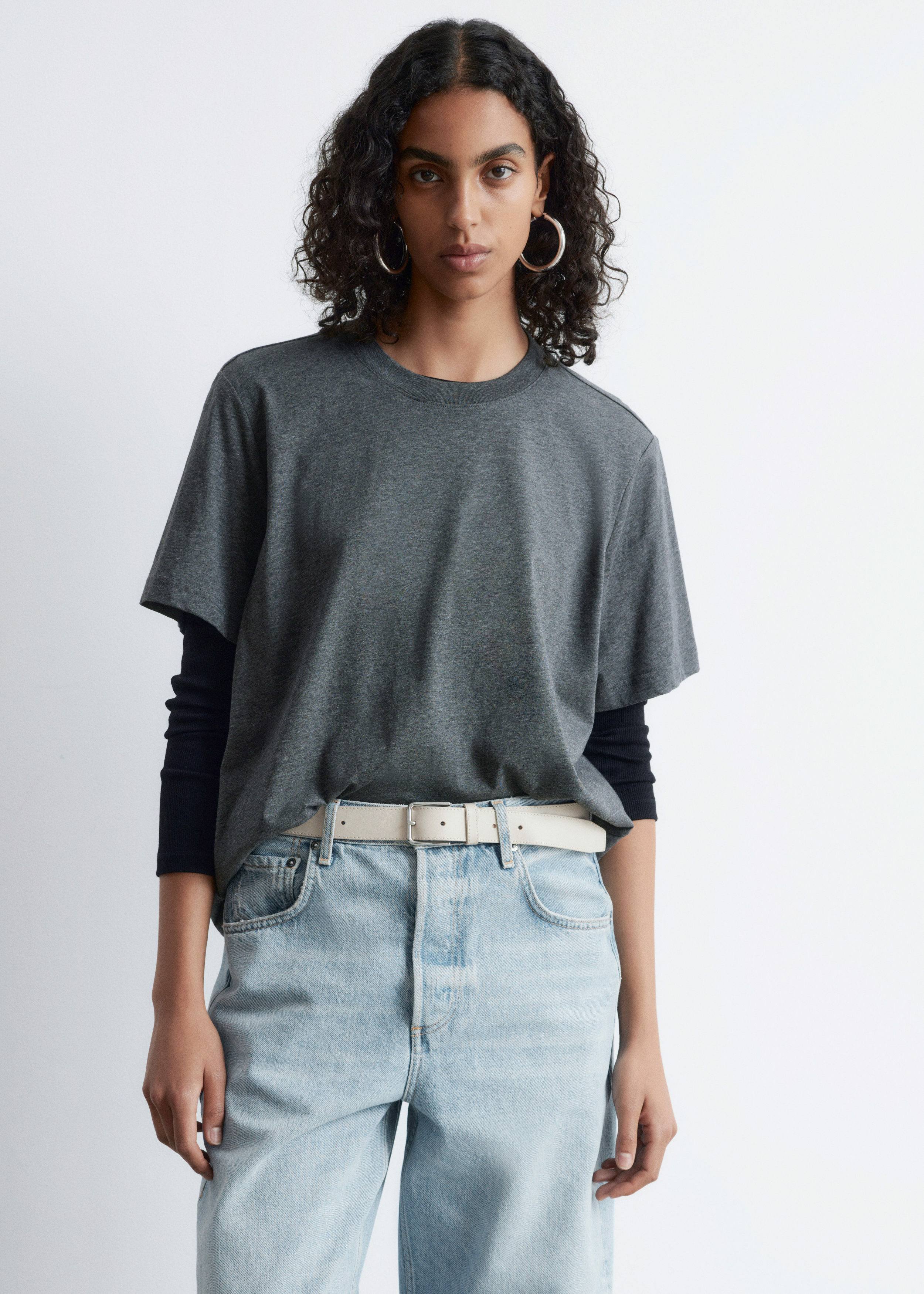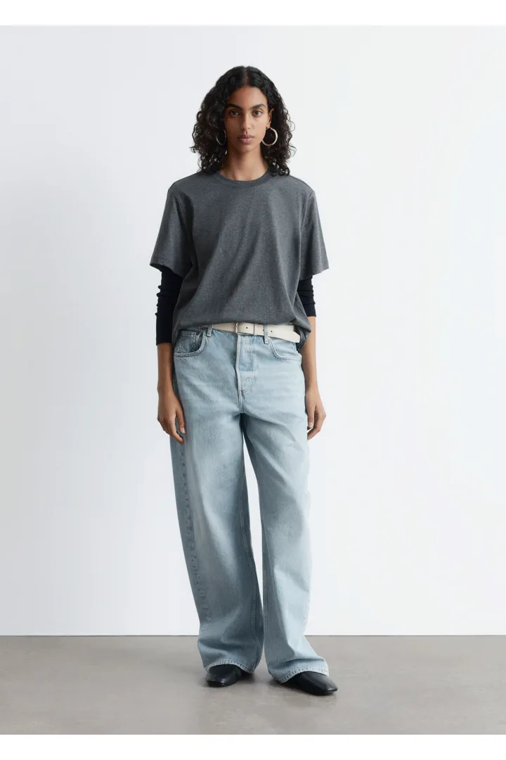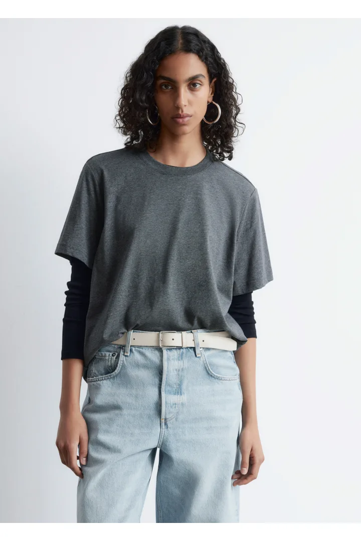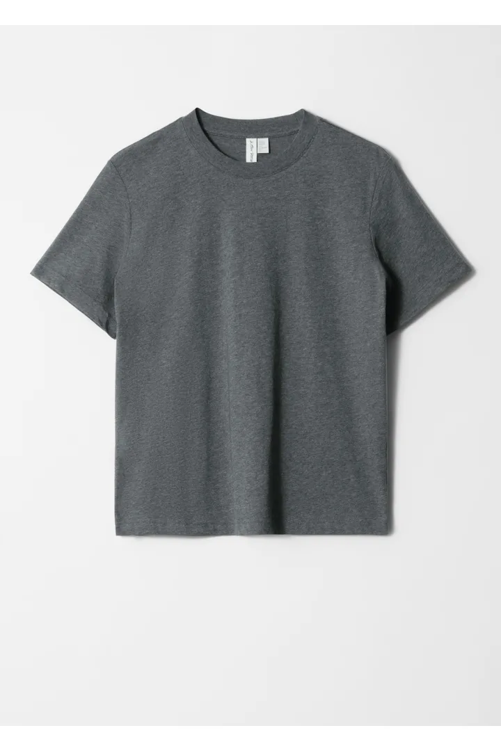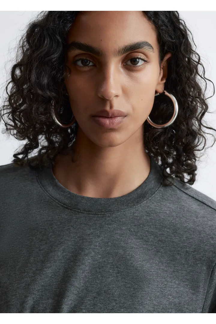 쇼트 슬리브의 크루넥 티셔츠예요. 여유로운 실루엣이 특징이랍니다.