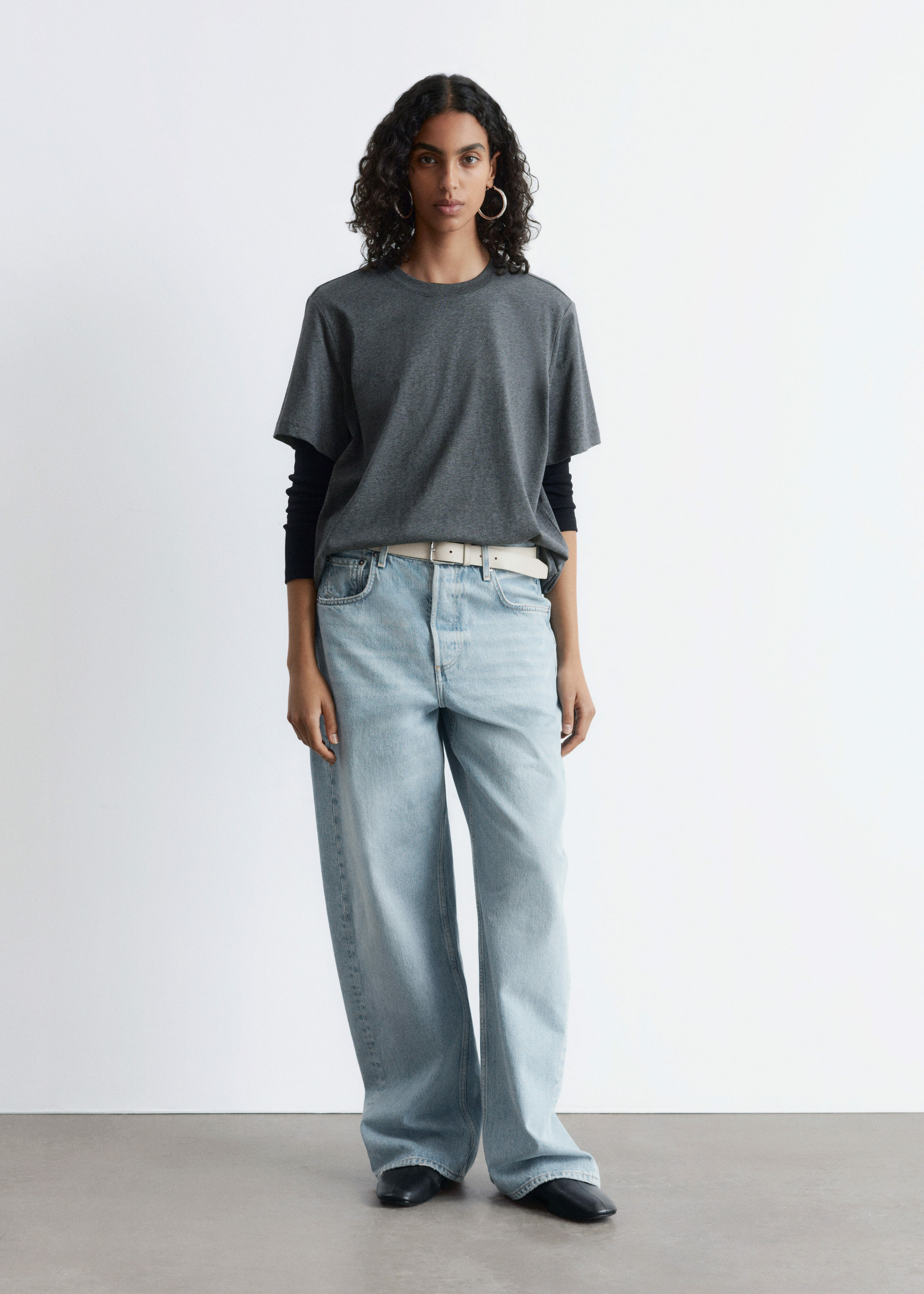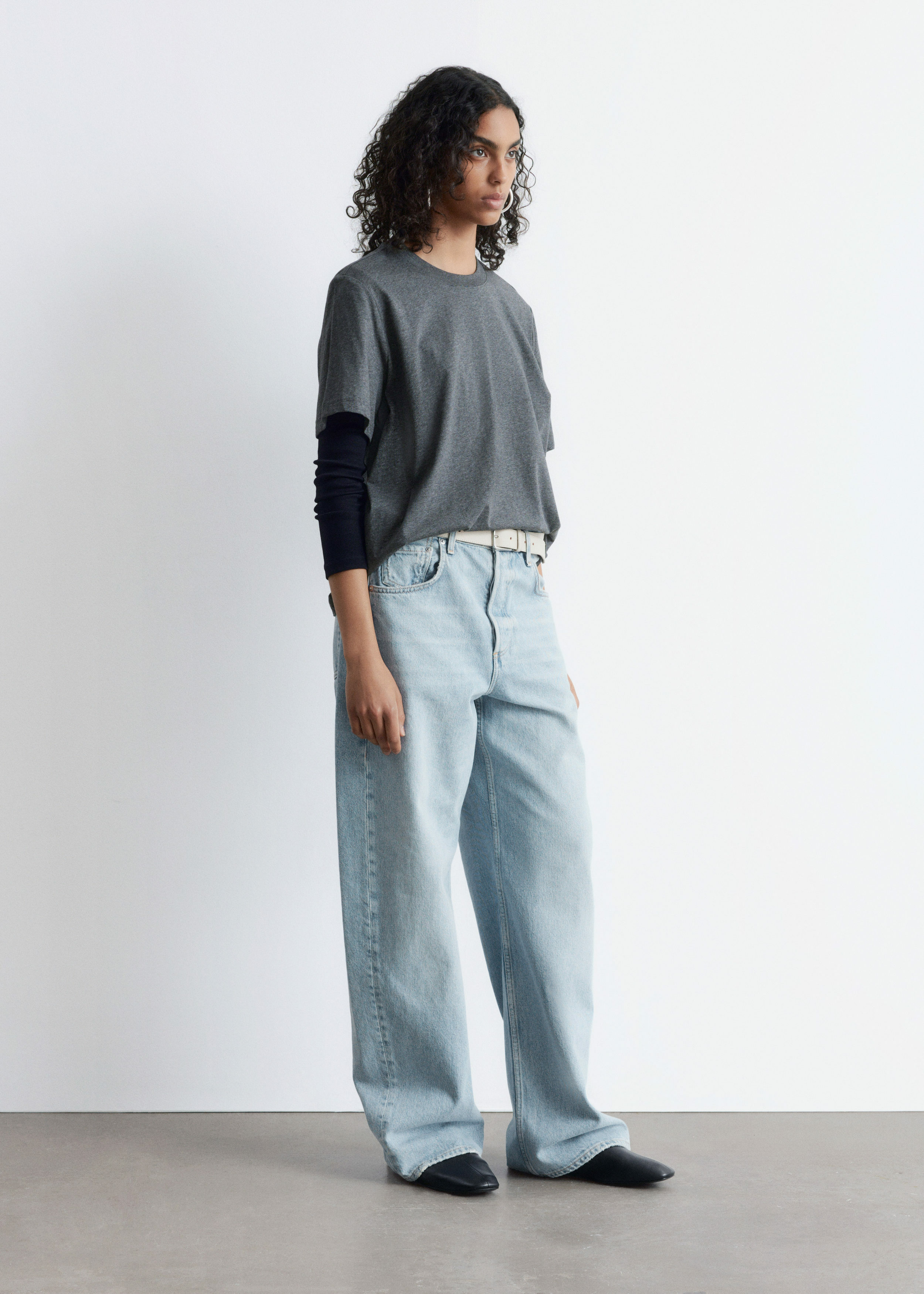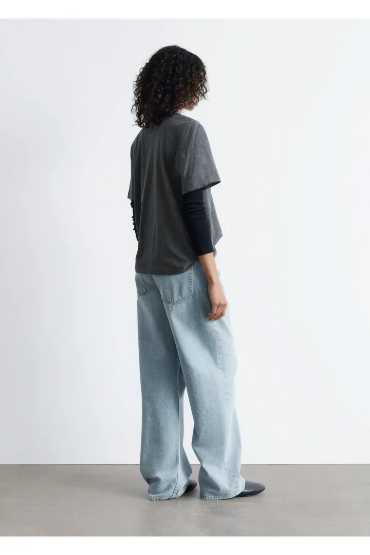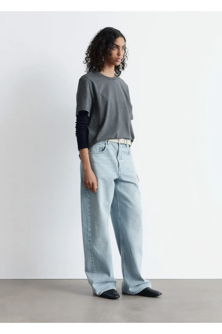 쇼트 슬리브의 크루넥 티셔츠예요. 여유로운 실루엣이 특징이랍니다.