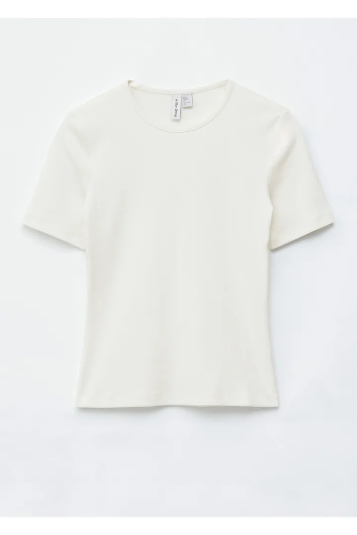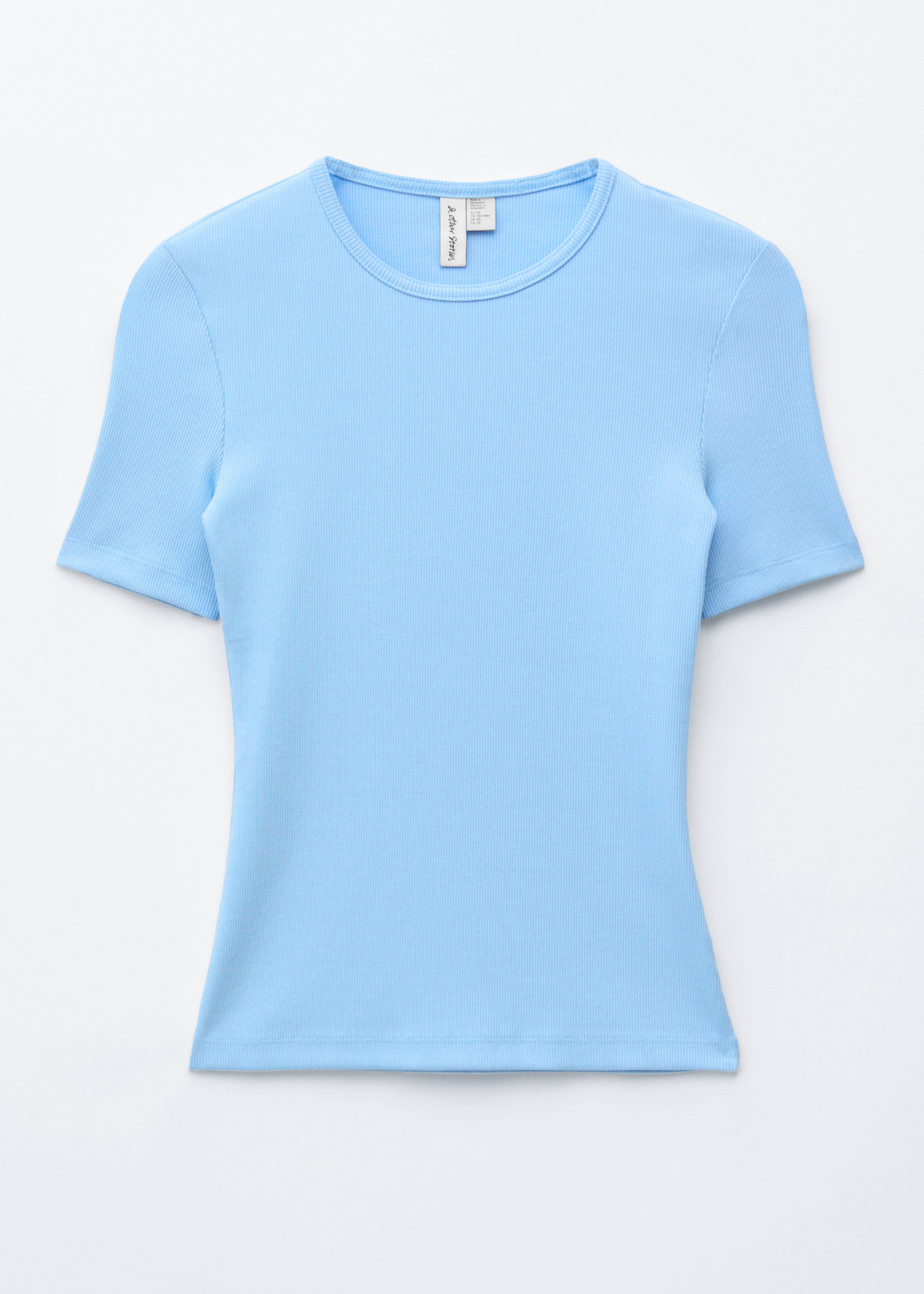 부드럽고 신축성 좋은 코튼 혼방 소재의 립 티셔츠예요. 슬림한 실루엣, 라운드 넥, 쇼트 슬리브가 특징이에요. 데님 진 또는 미니 스커트와 매치해 보세요.