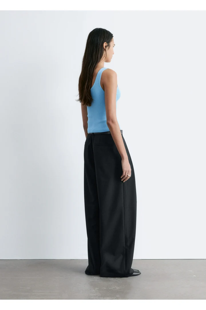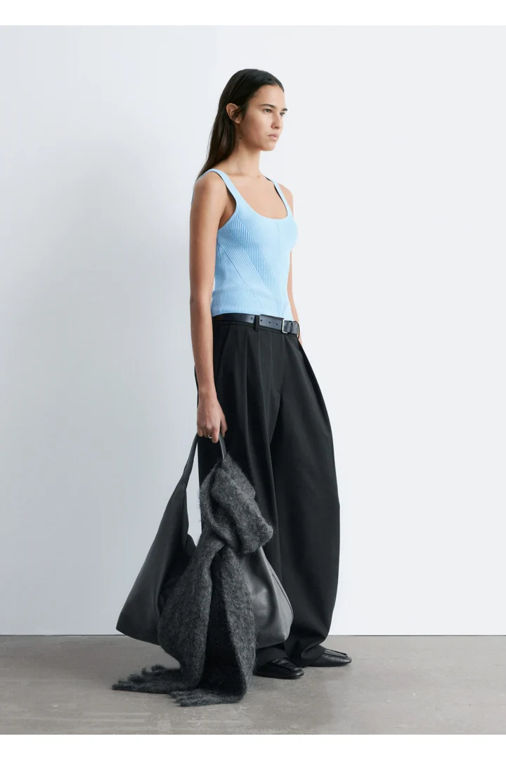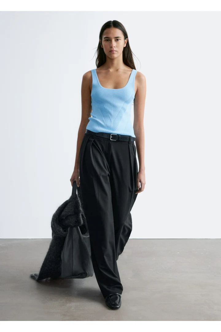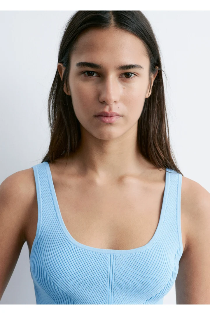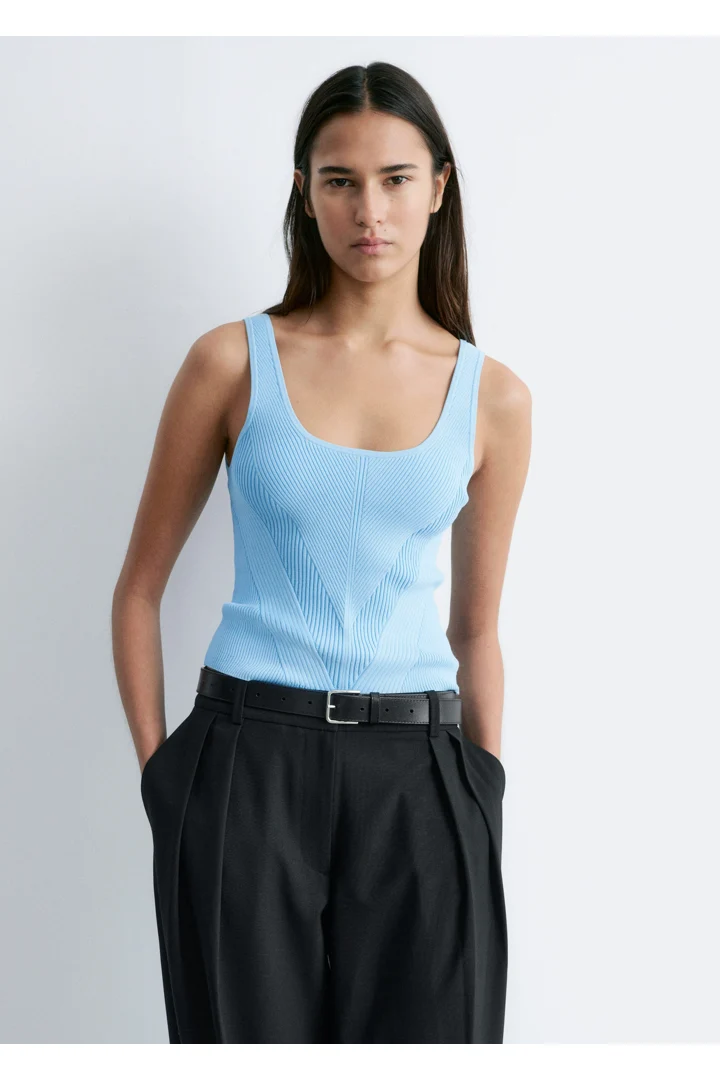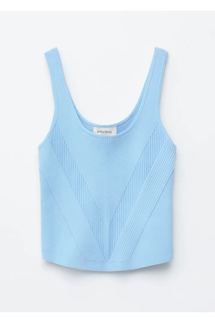 핏 되는 실루엣이 돋보이는 니트 탱크 탑이에요. 깊게 파인 네크라인, 뒷면의 로우 컷, 그리고 쉐입에 맞게 니팅된 디자인이 시선을 사로잡아요.