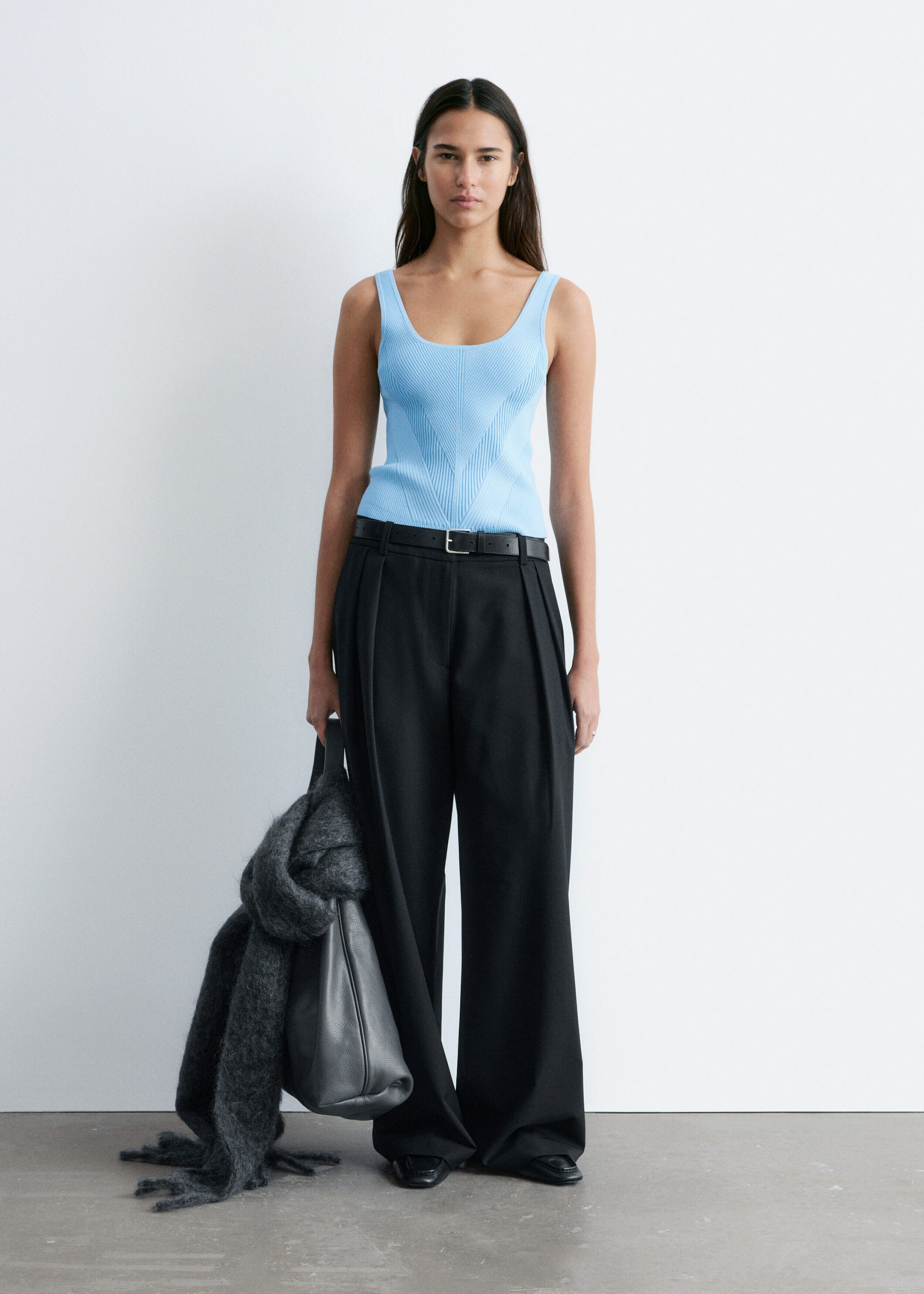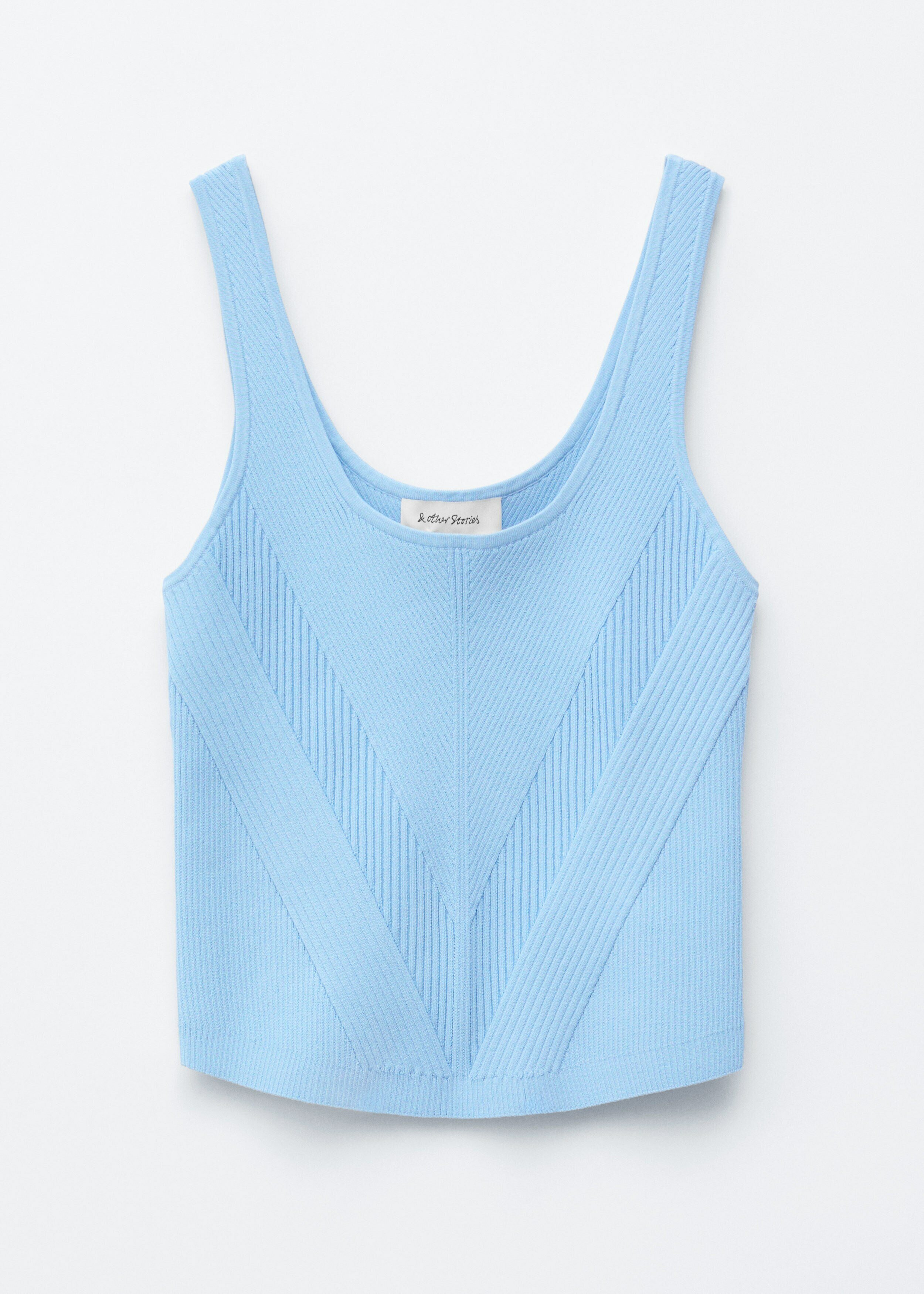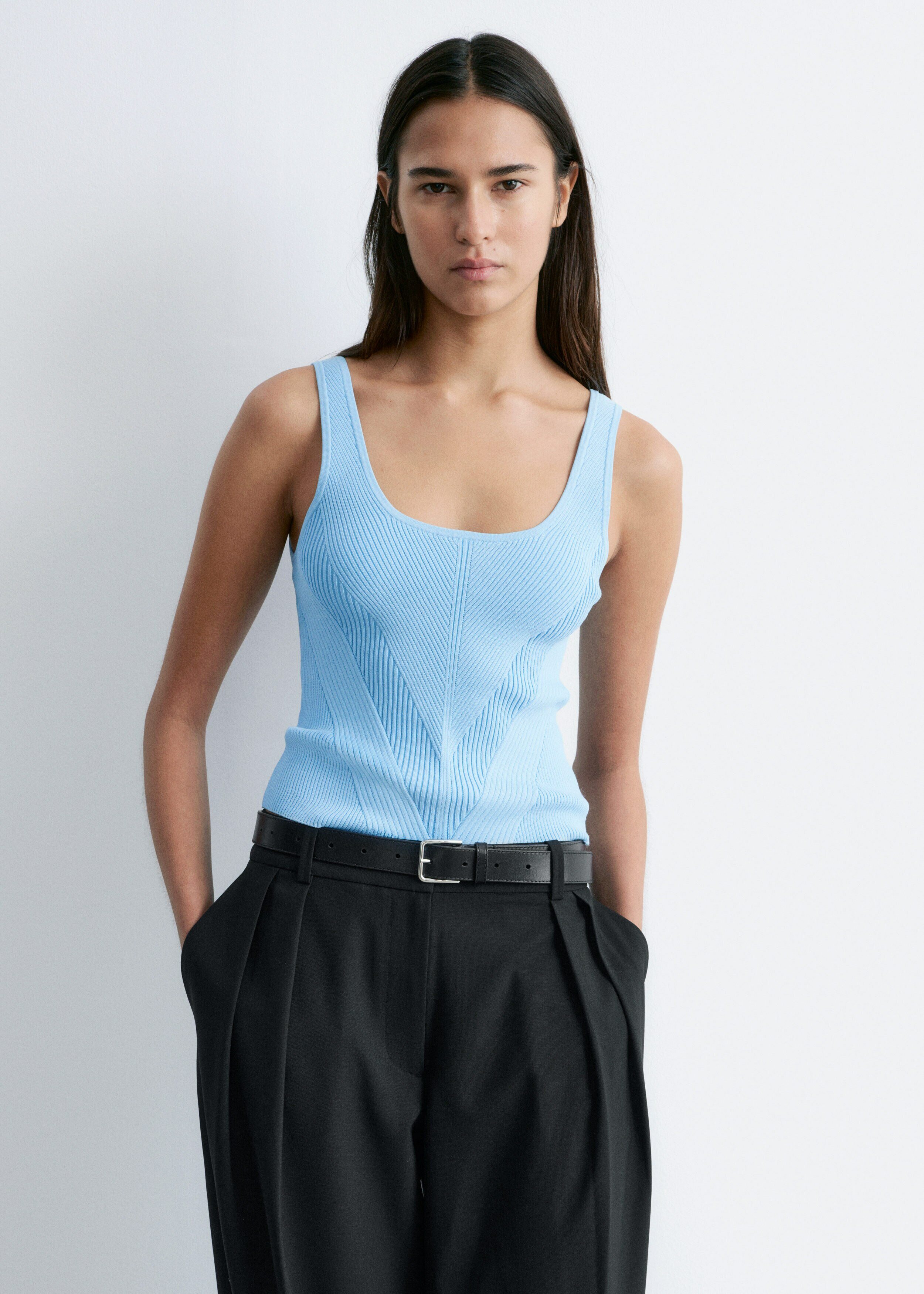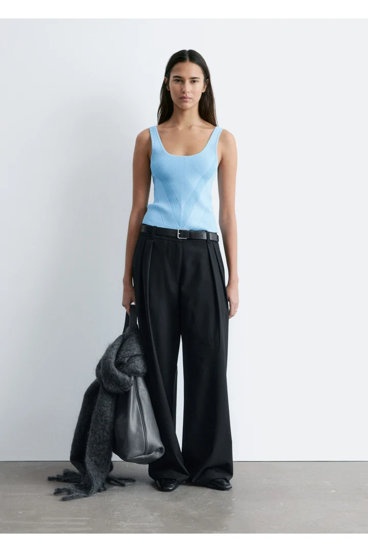 핏 되는 실루엣이 돋보이는 니트 탱크 탑이에요. 깊게 파인 네크라인, 뒷면의 로우 컷, 그리고 쉐입에 맞게 니팅된 디자인이 시선을 사로잡아요.