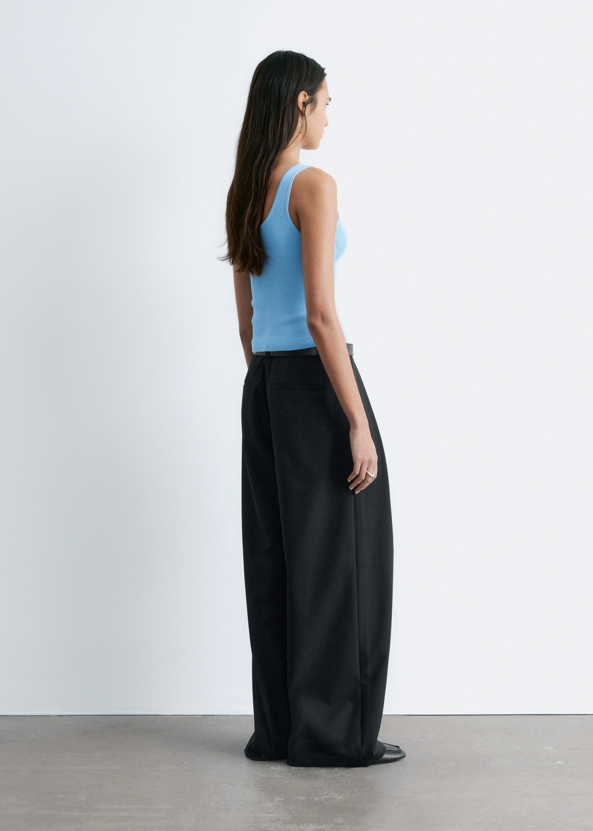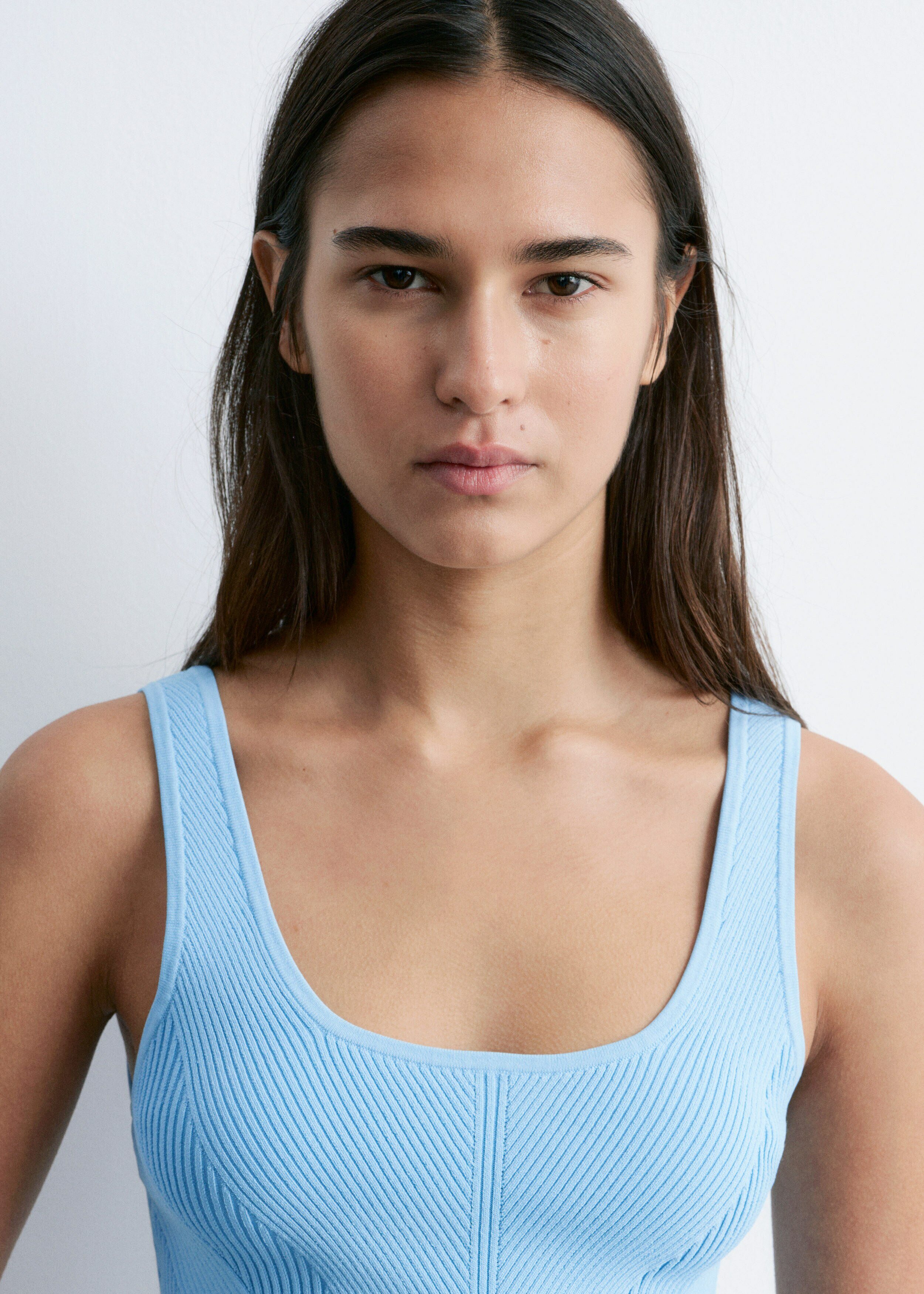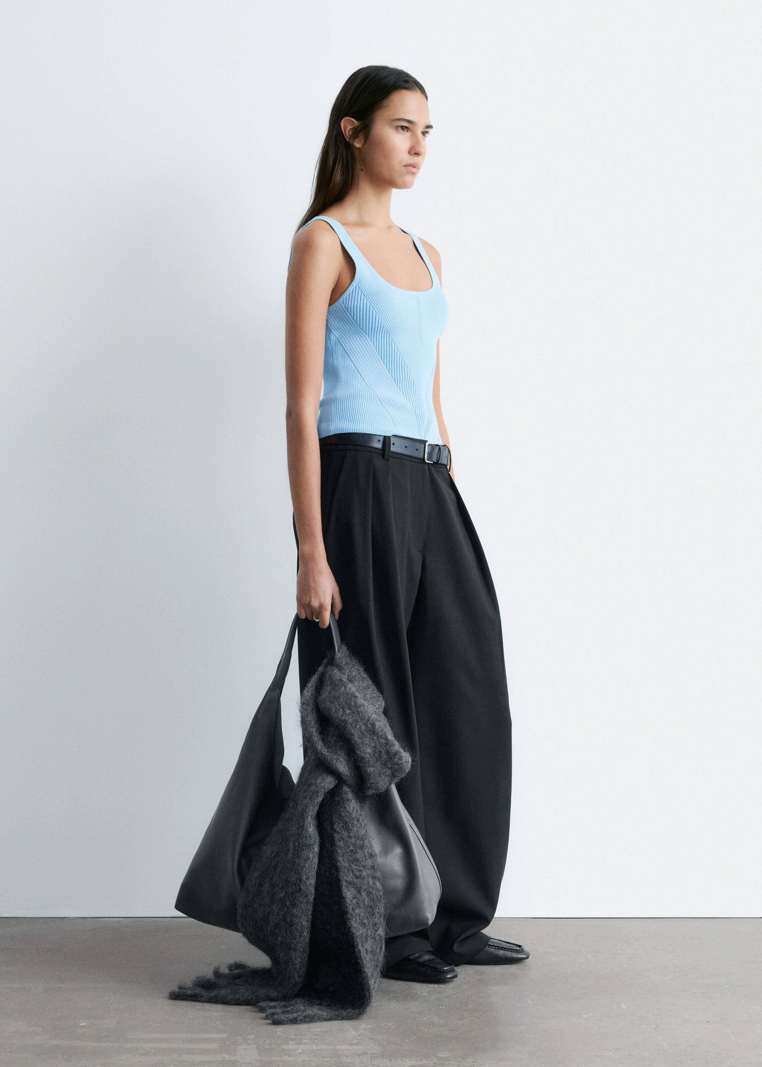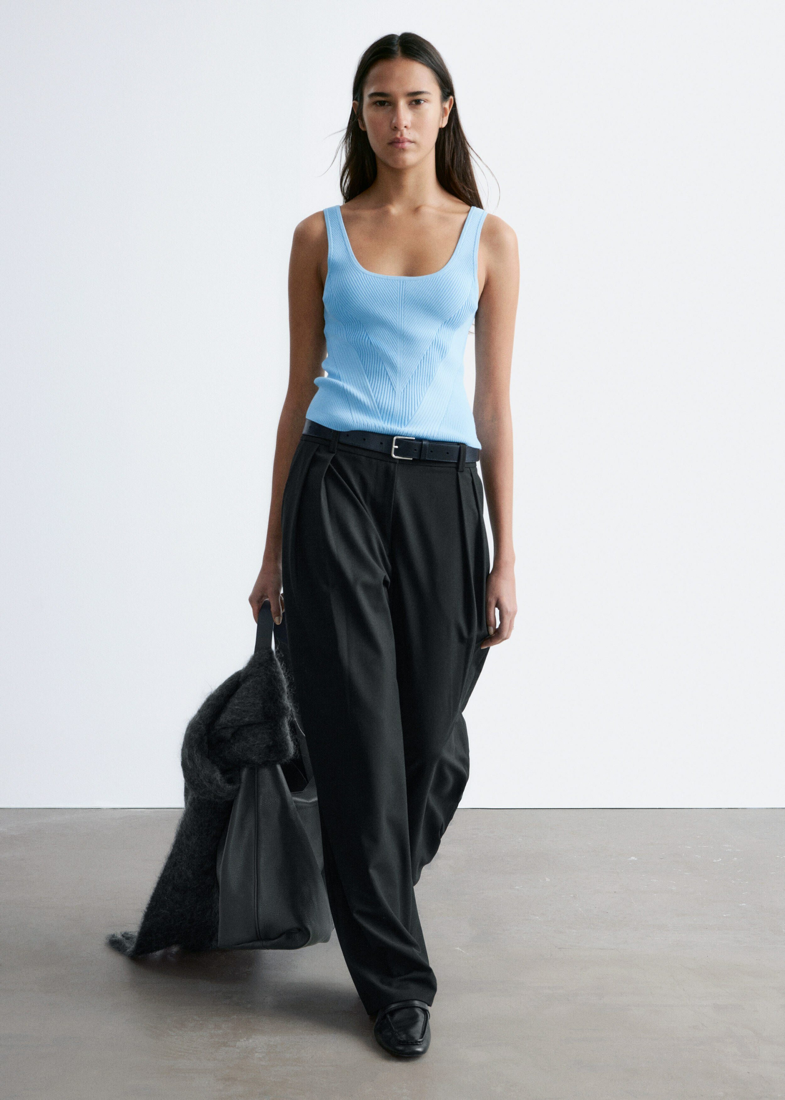 핏 되는 실루엣이 돋보이는 니트 탱크 탑이에요. 깊게 파인 네크라인, 뒷면의 로우 컷, 그리고 쉐입에 맞게 니팅된 디자인이 시선을 사로잡아요.