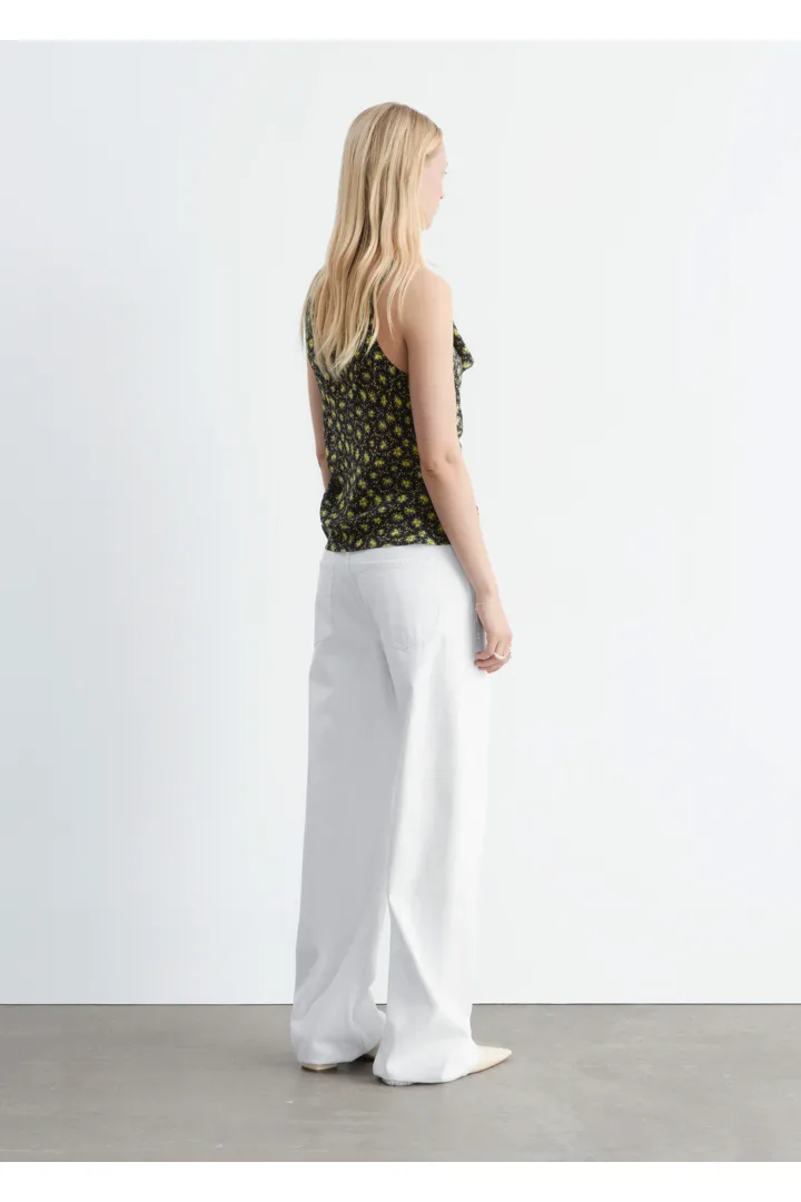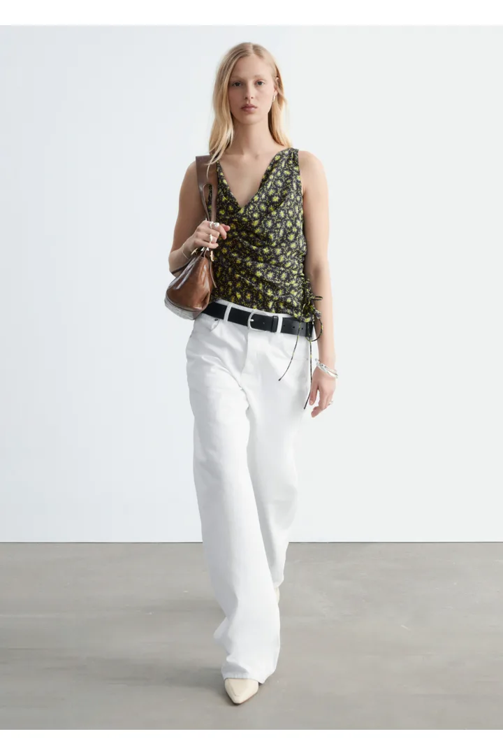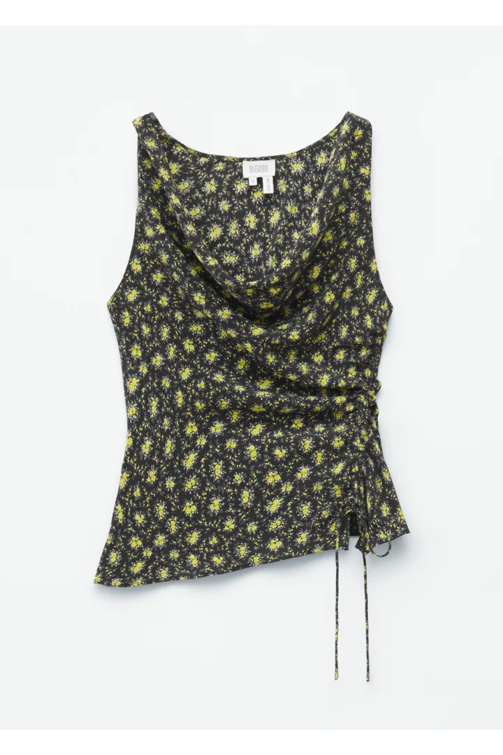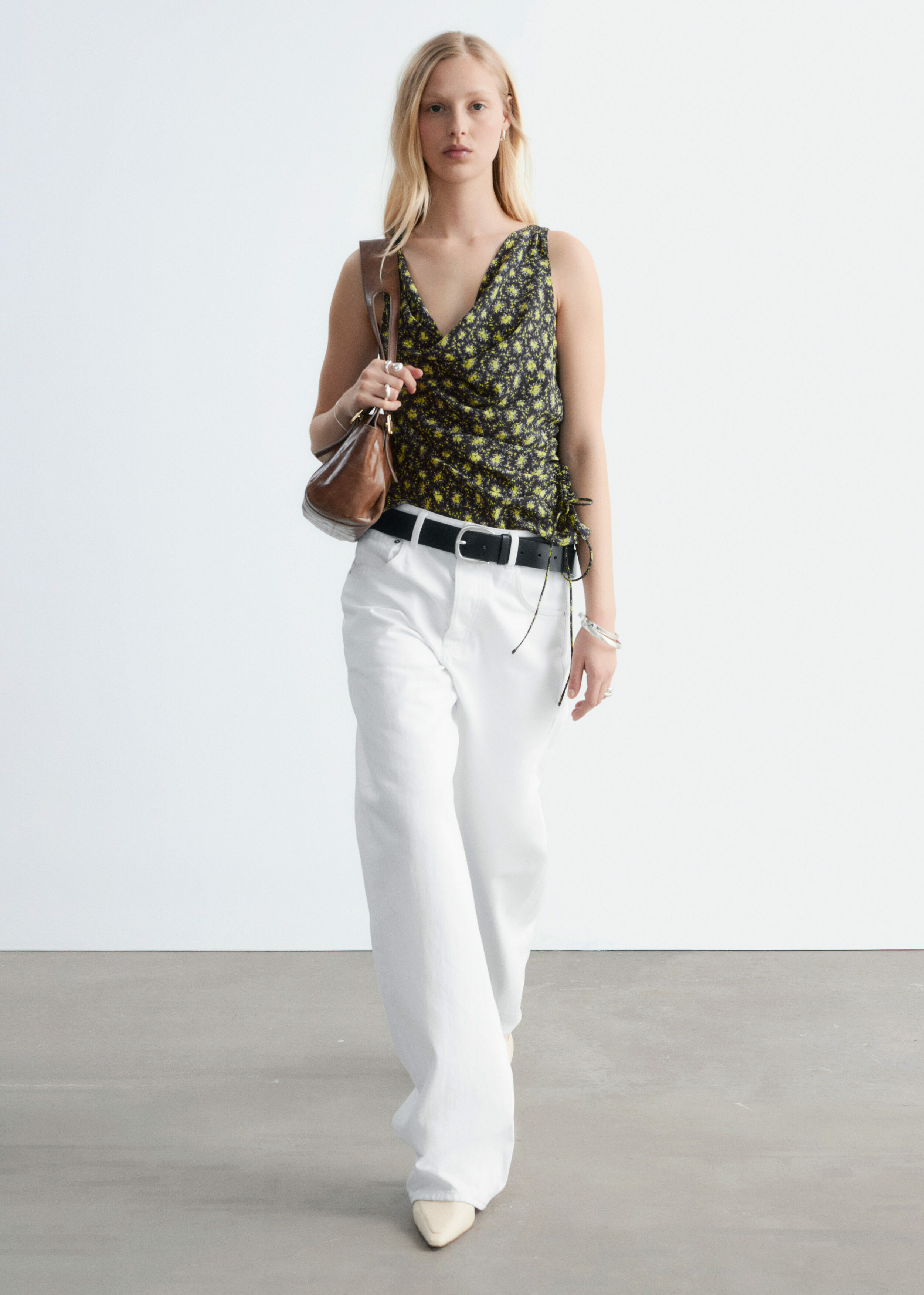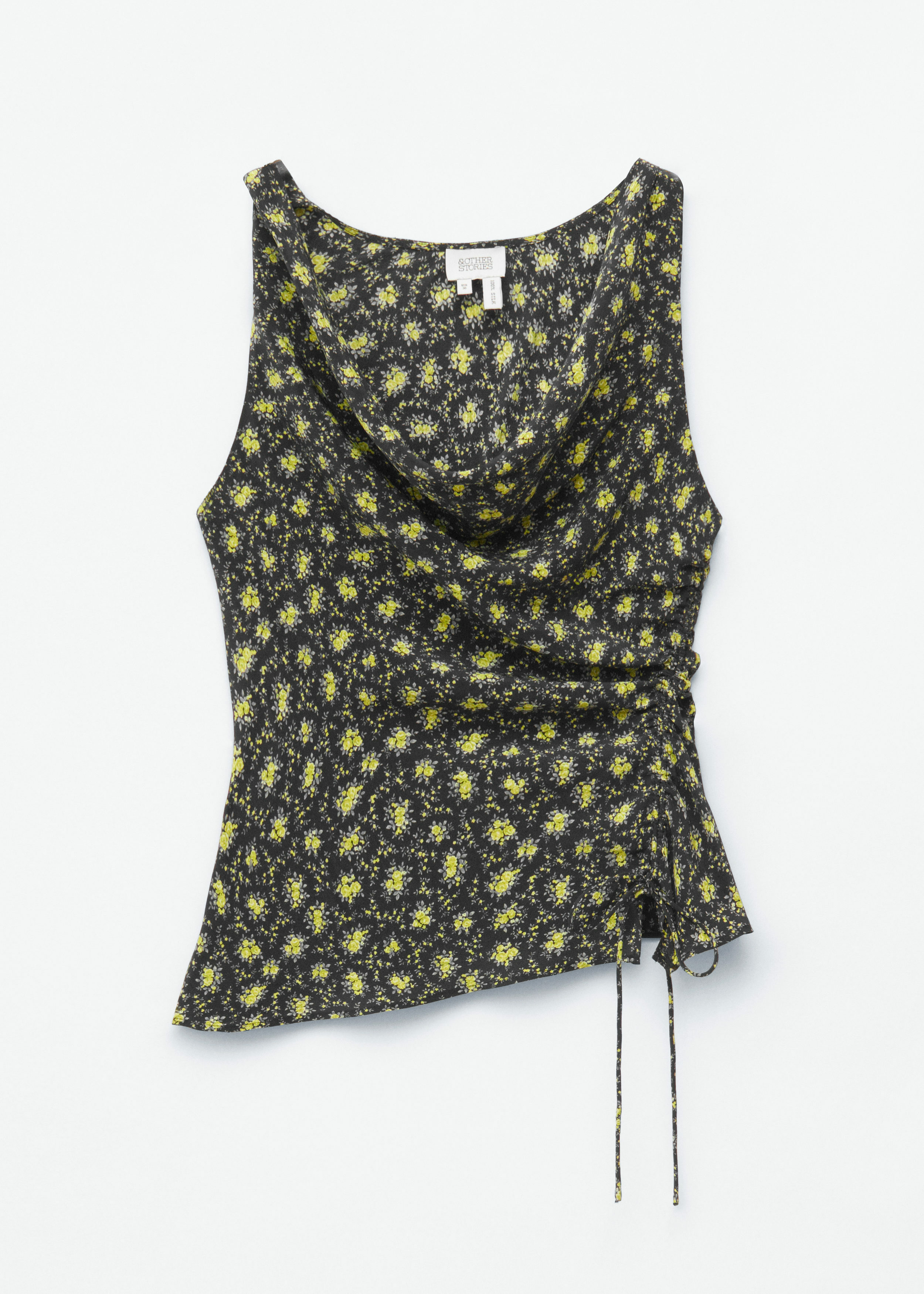 100% 멀베리 실크 소재로 탄생한 슬리브리스 탑이에요. 부드러운 카울 네크라인, 트위스트 룩의 싱글 숄더 스트랩, 그리고 원하는 드레이프 스타일로 연출할 수 있는 측면부 드로스트링이 자리해 있어요.