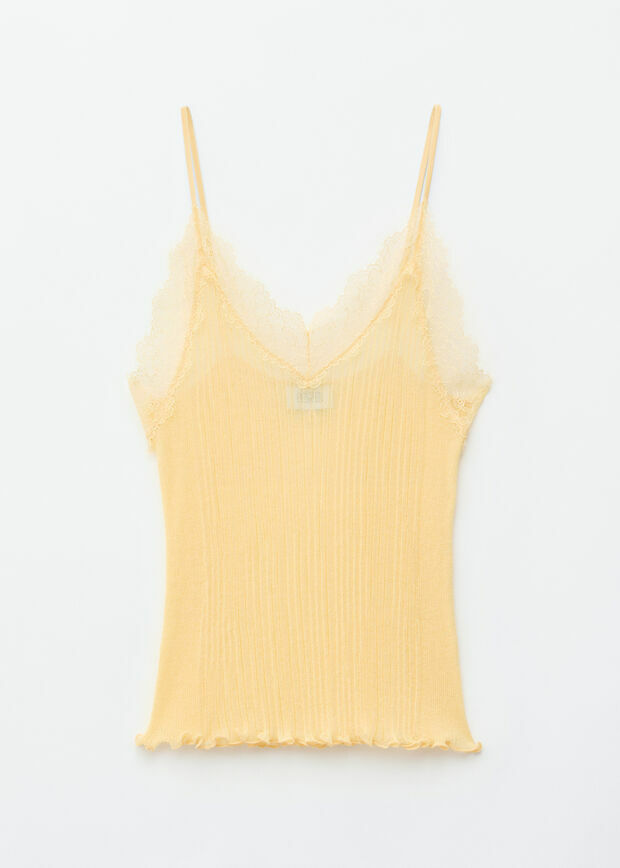90년대 미니멀리즘에서 영감을 받은 캐미솔이에요. 부드럽고 신축성 좋은 저지 소재의 립 니트로 탄생했답니다. 네크라인의 레이스, 어깨의 얇은 스트랩, 밑단의 스캘럽 장식이 은은한 디테일을 더해주어요. 데님 또는 심플한 미니 스커트와 함께 연출해 보세요.