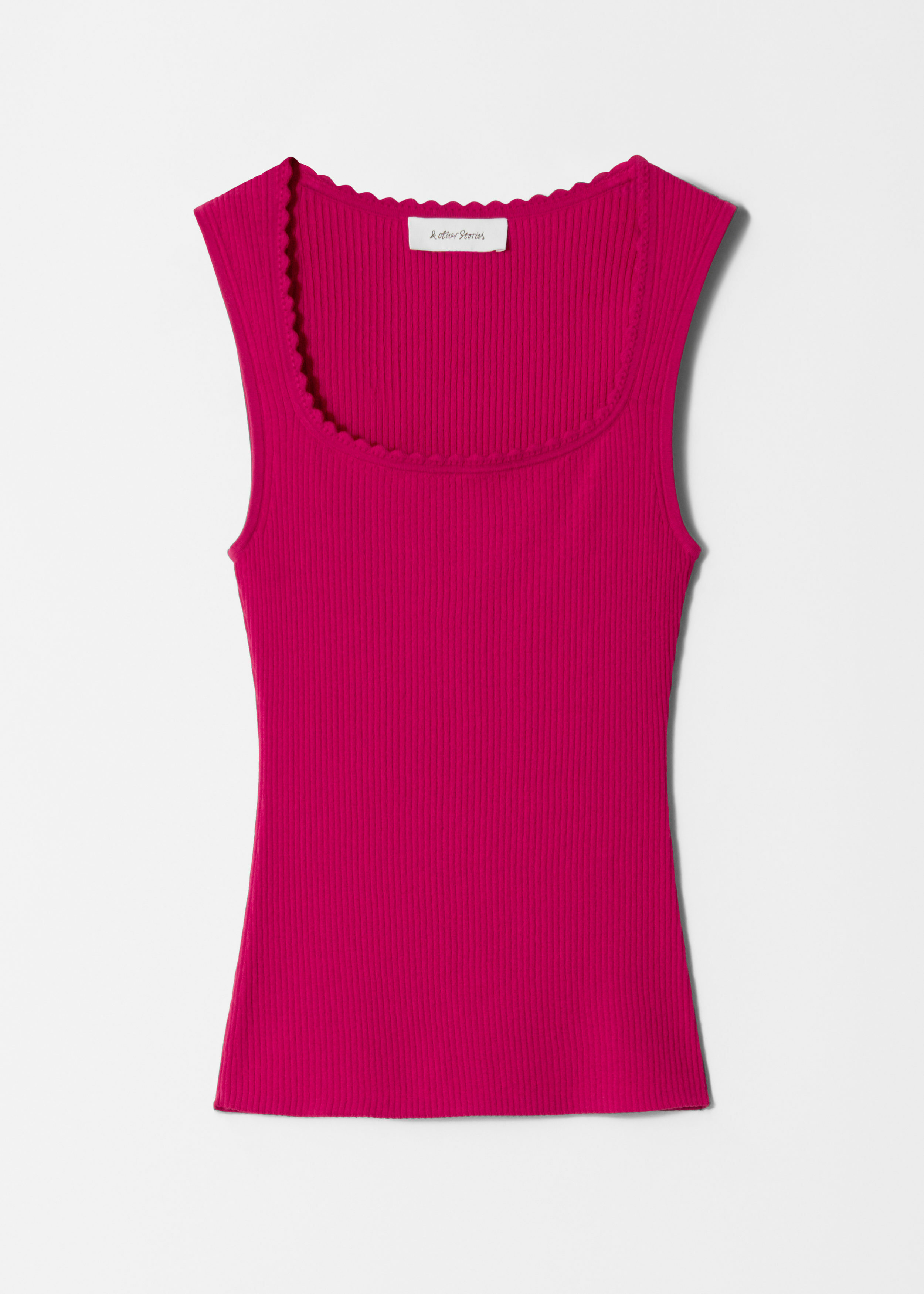 립 니트 마감으로 탄생한 탱크 탑이에요. 핏 되는 실루엣, 그리고 스캘럽 테두리로 포인트를 준 스퀘어 네크라인이 특징이에요.