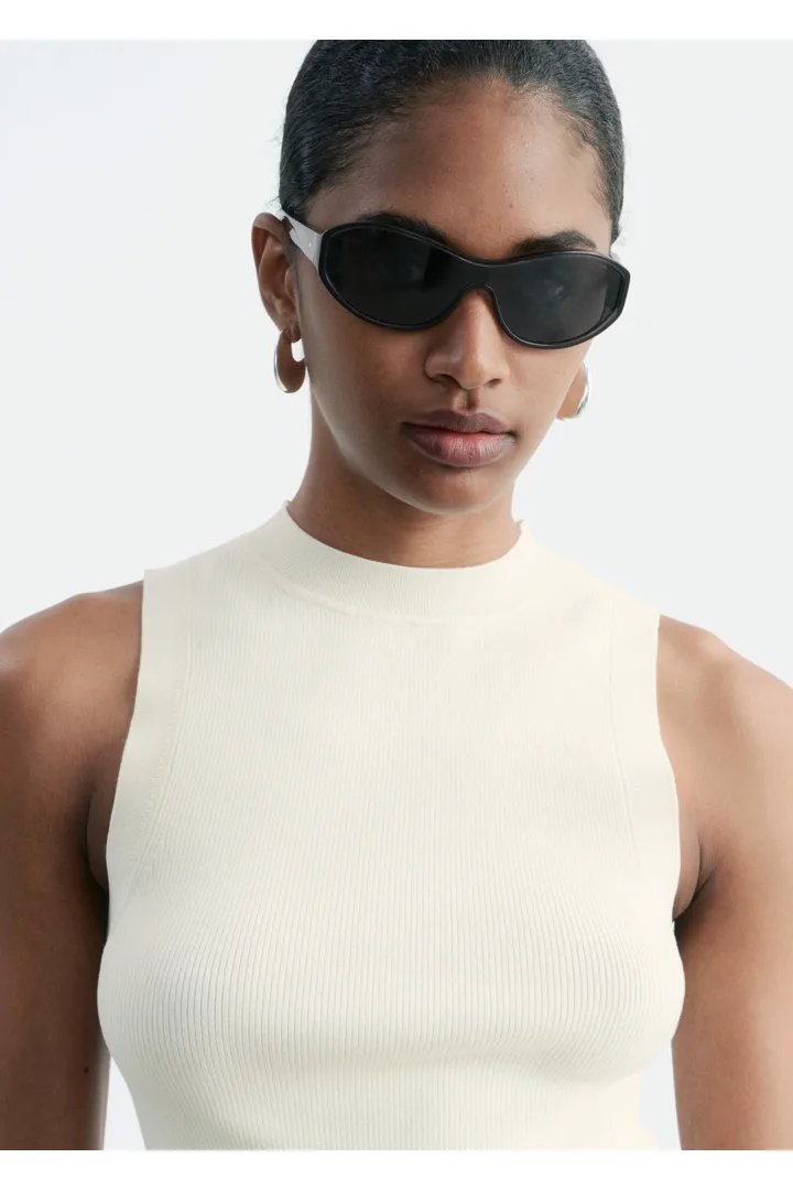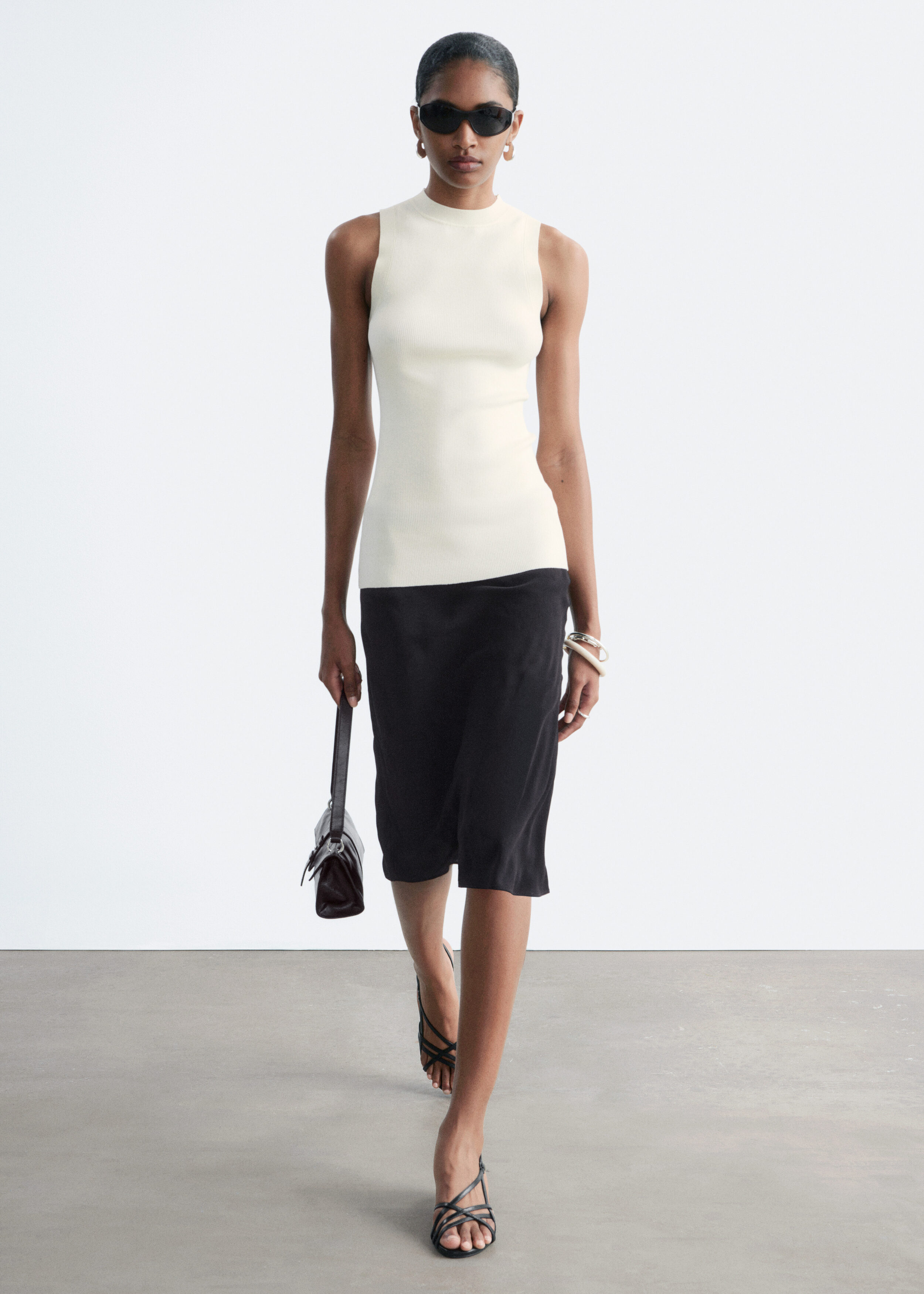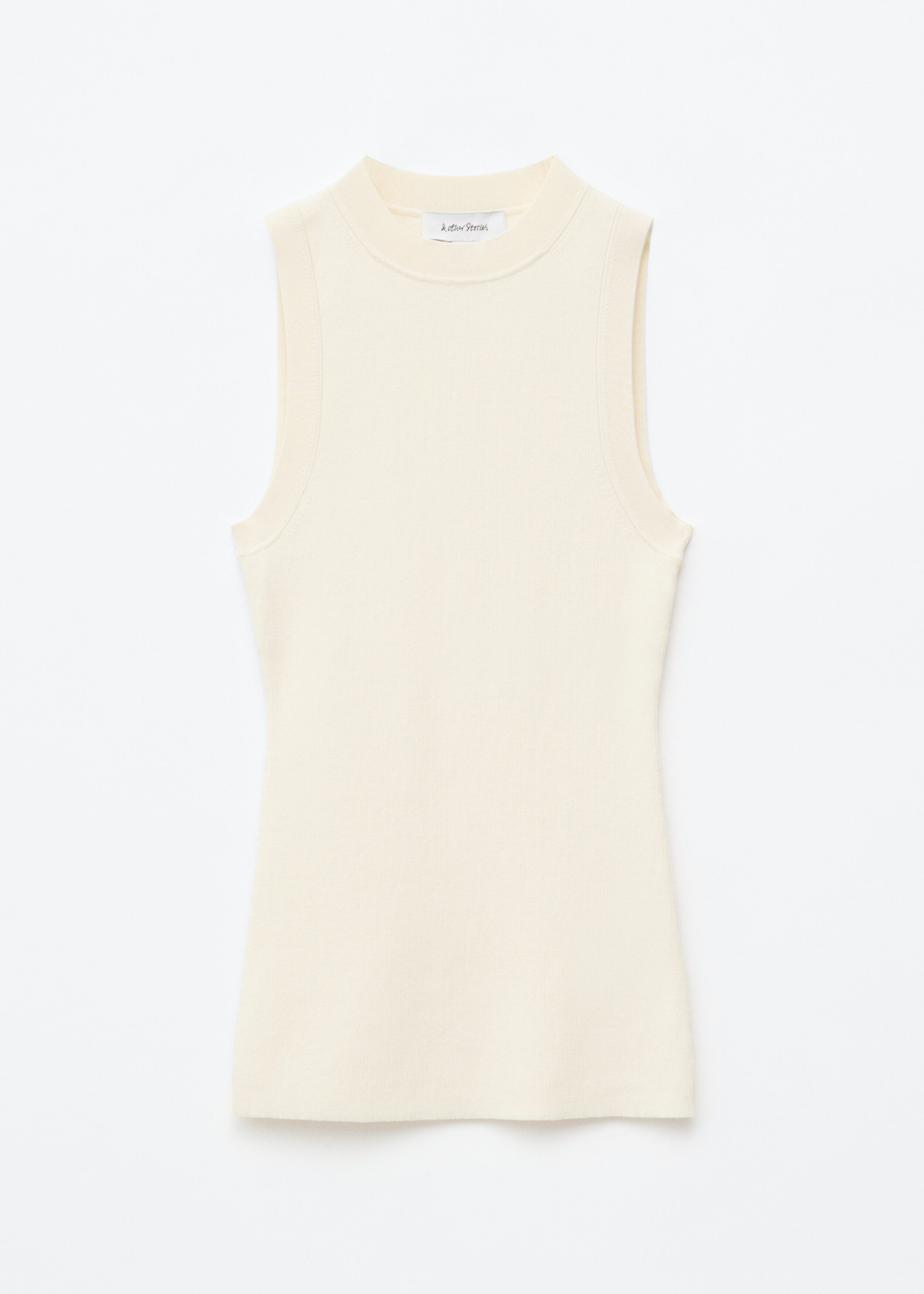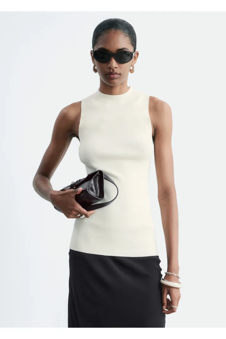 립 비스코스 혼방 니트로 탄생한 슬림 탱크 탑이에요. 부드럽고 유연한 감각이 특징이랍니다. 하이 네크라인과 드롭 암홀, 그리고 대비적인 립 트리밍이 시선을 사로잡아요. 테일러드 피스나 데님 팬츠와도 잘 어울린답니다.