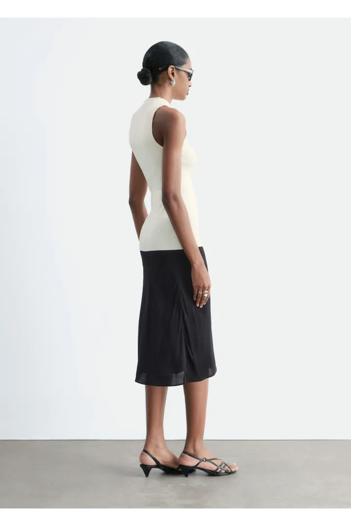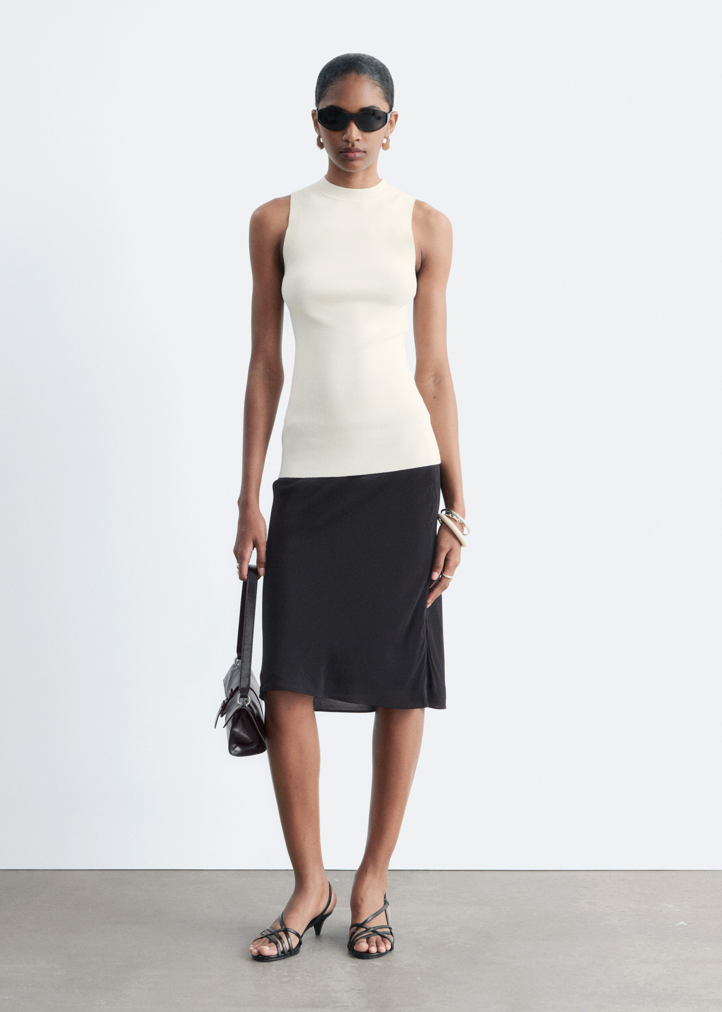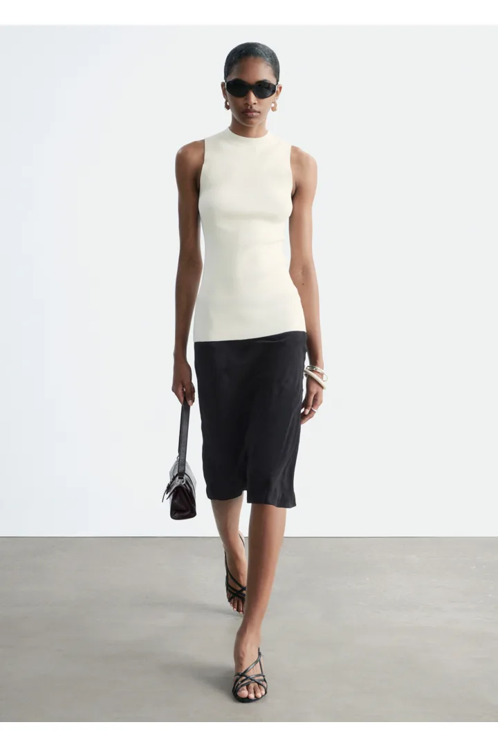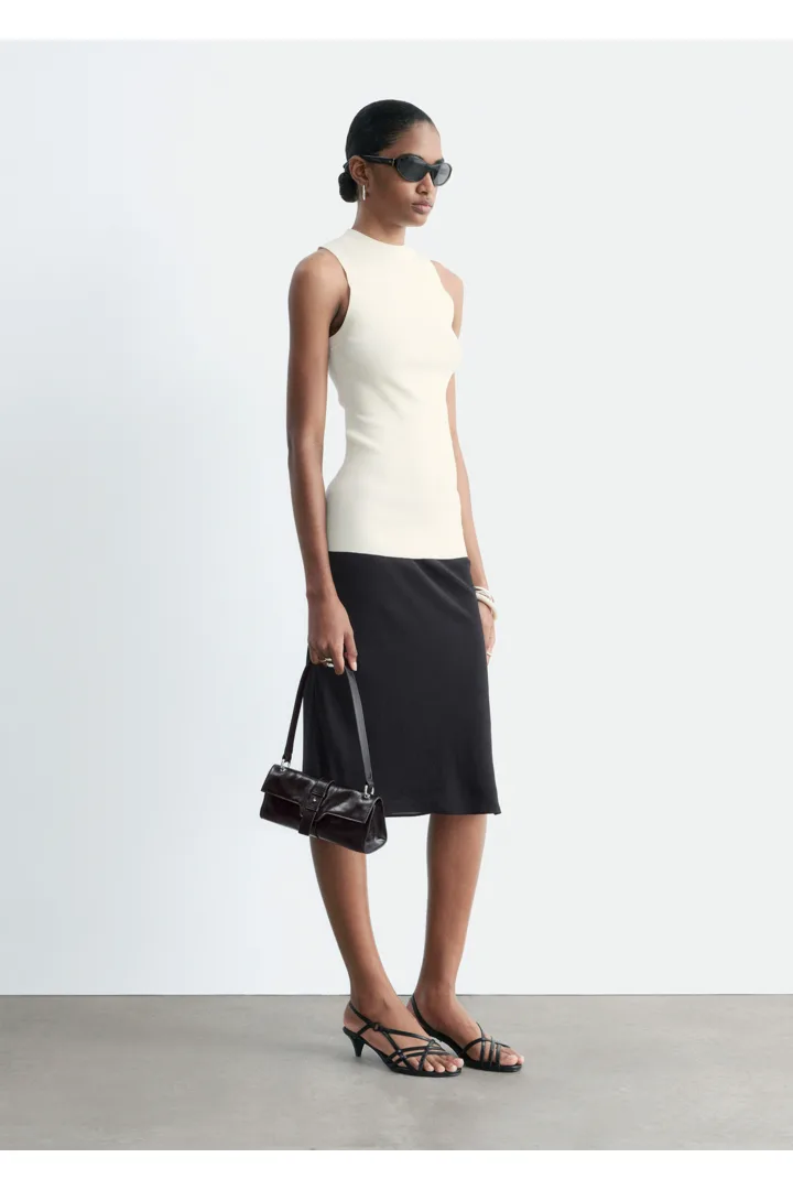 립 비스코스 혼방 니트로 탄생한 슬림 탱크 탑이에요. 부드럽고 유연한 감각이 특징이랍니다. 하이 네크라인과 드롭 암홀, 그리고 대비적인 립 트리밍이 시선을 사로잡아요. 테일러드 피스나 데님 팬츠와도 잘 어울린답니다.