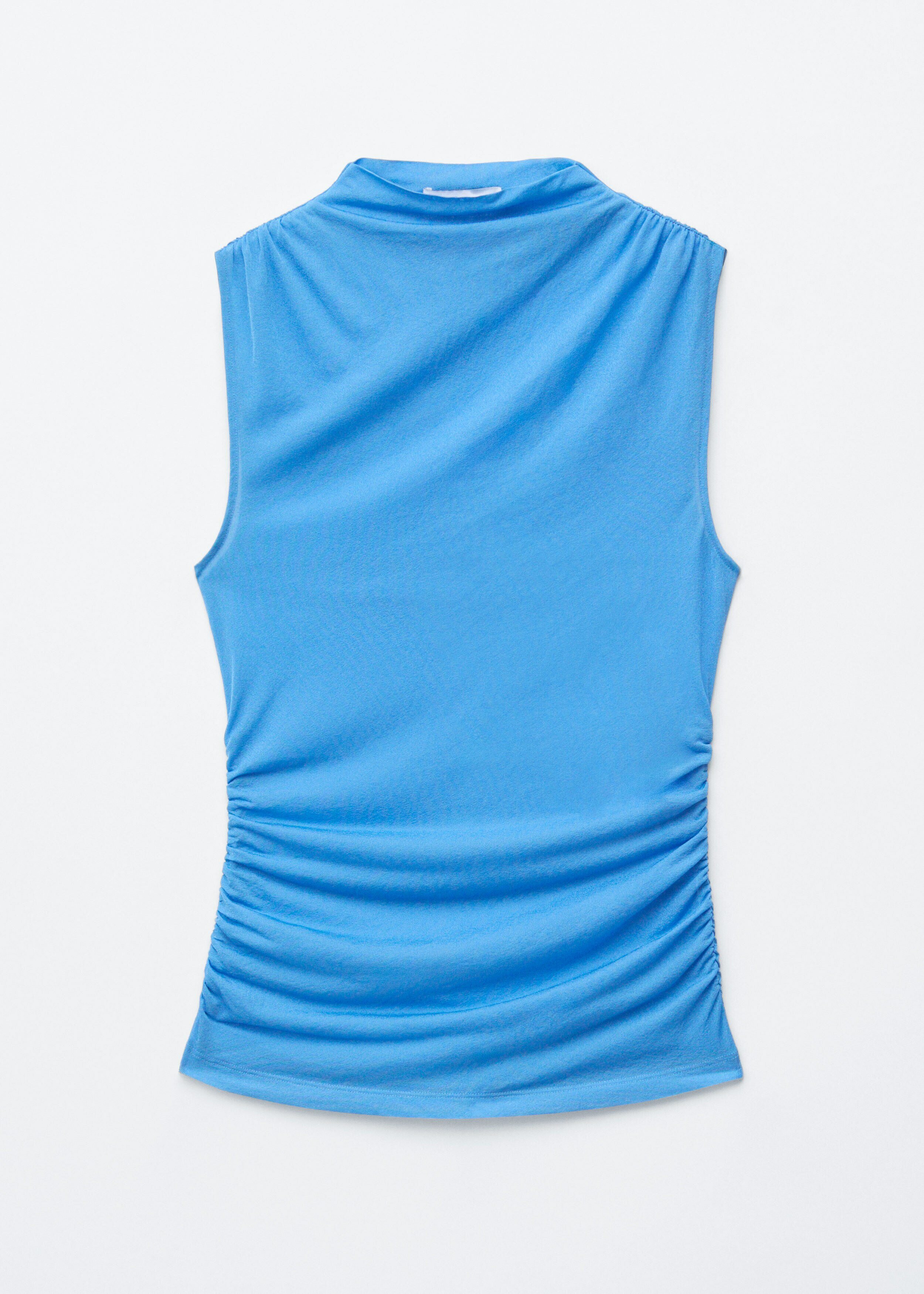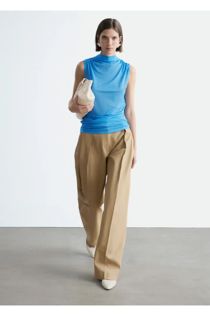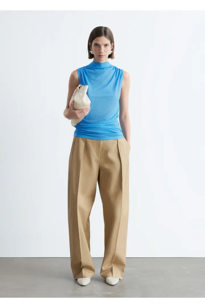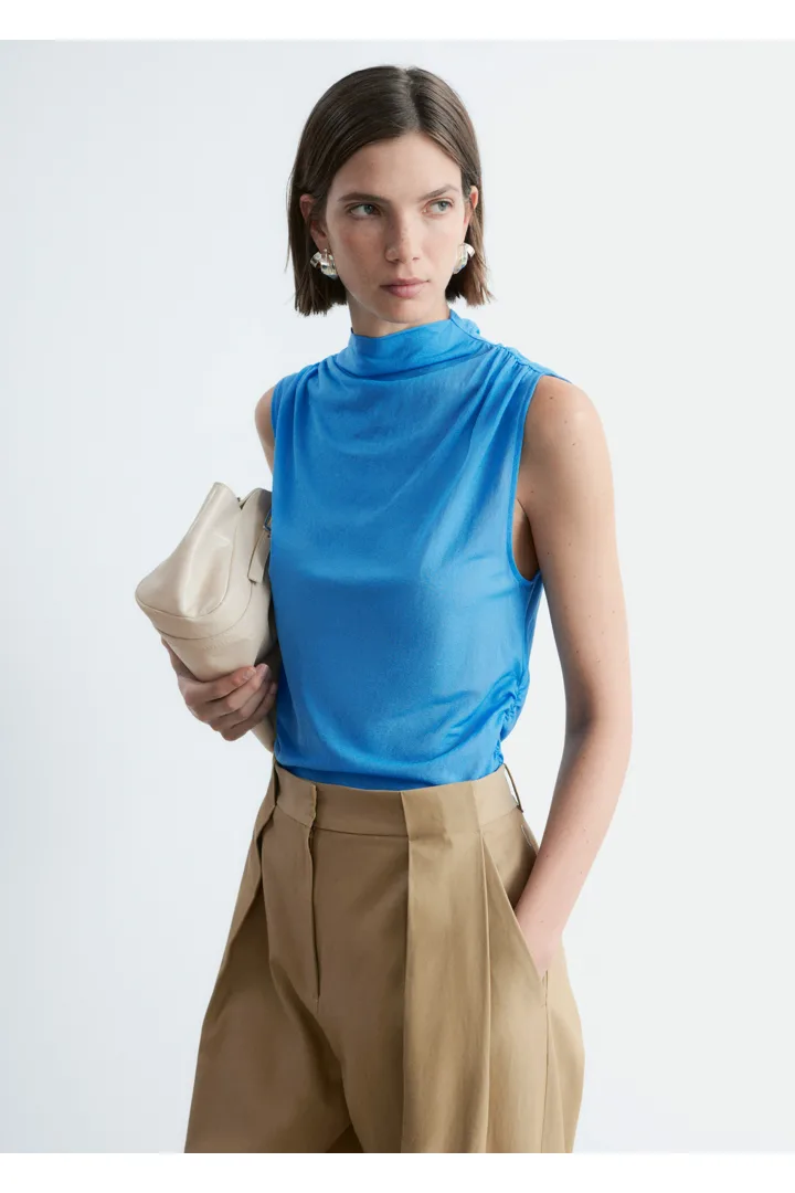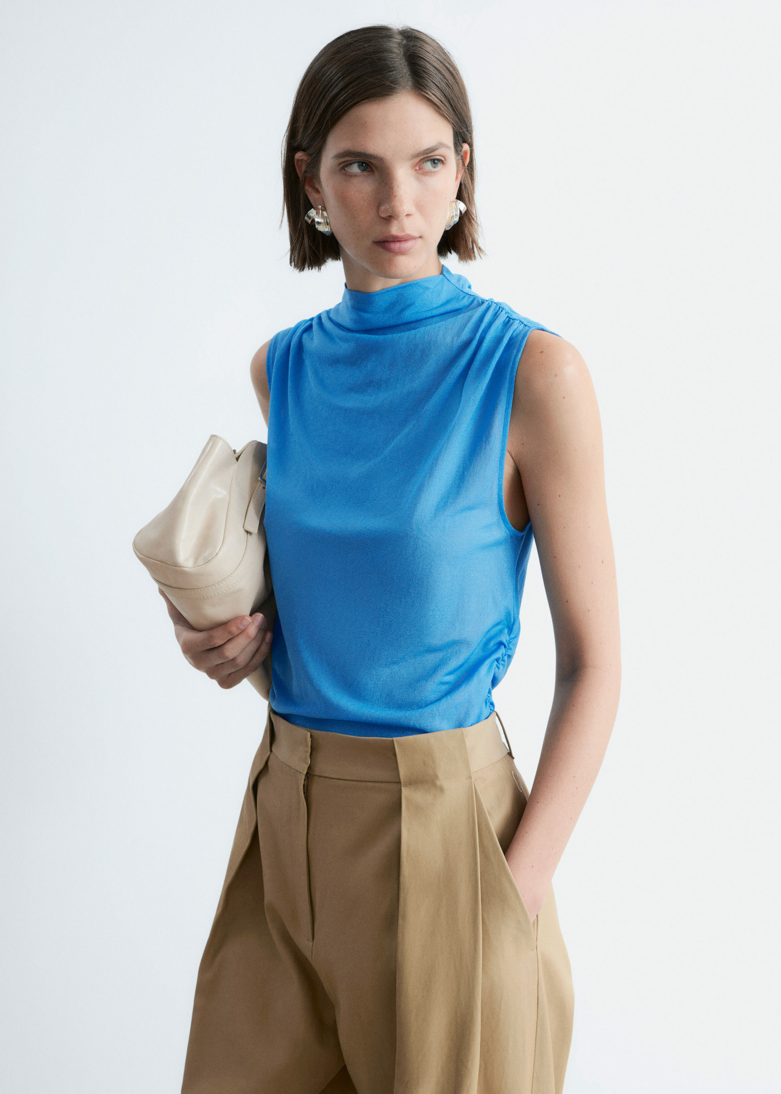 부드러운 저지 소재의 슬리브리스 탑이에요. 핏 되는 실루엣, 모크 넥, 은은한 셔링이 시선을 사로잡는답니다.