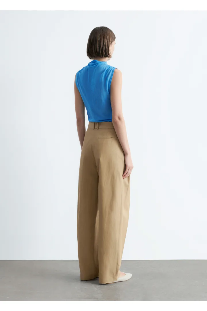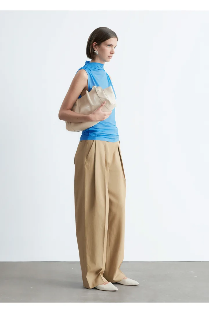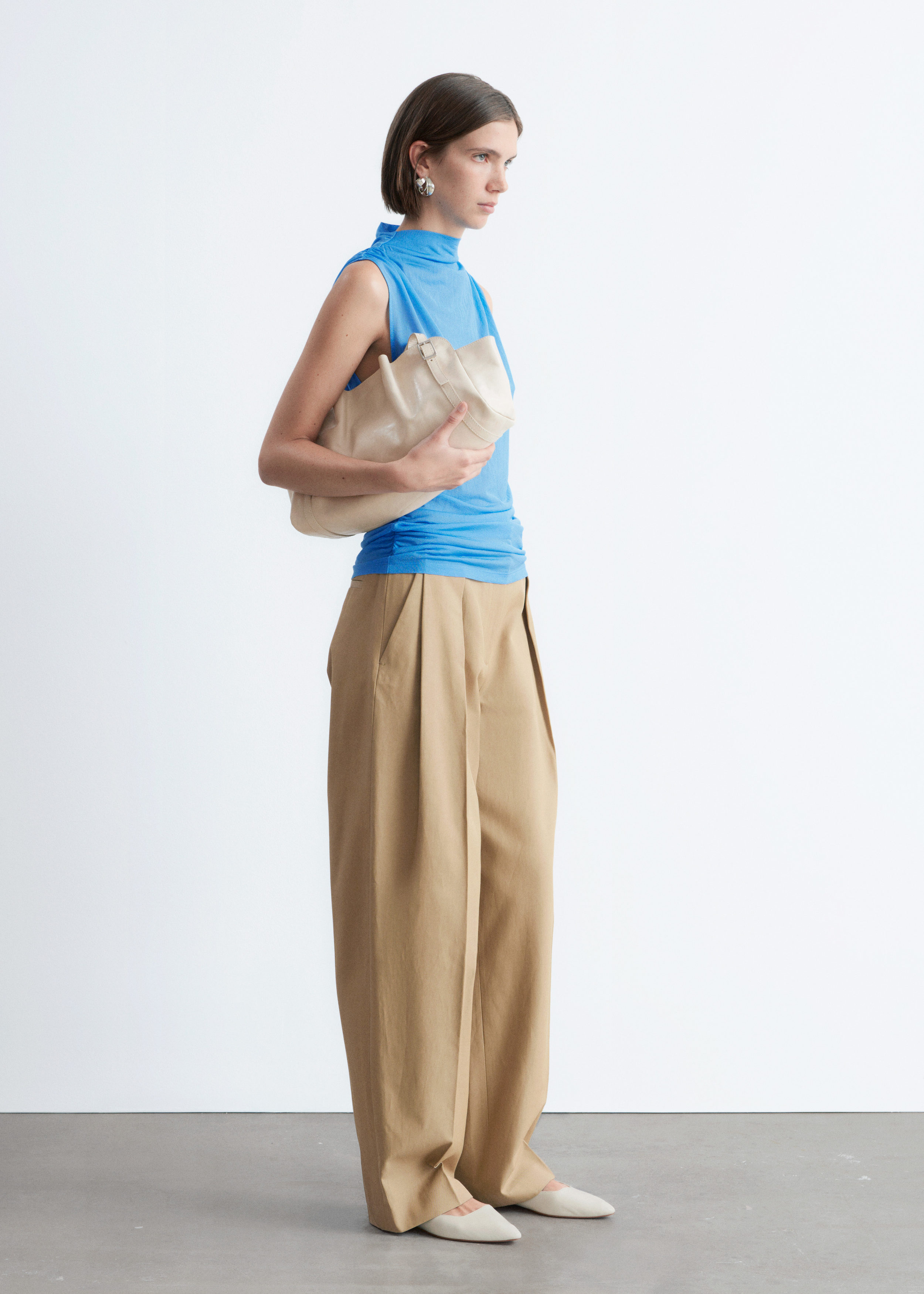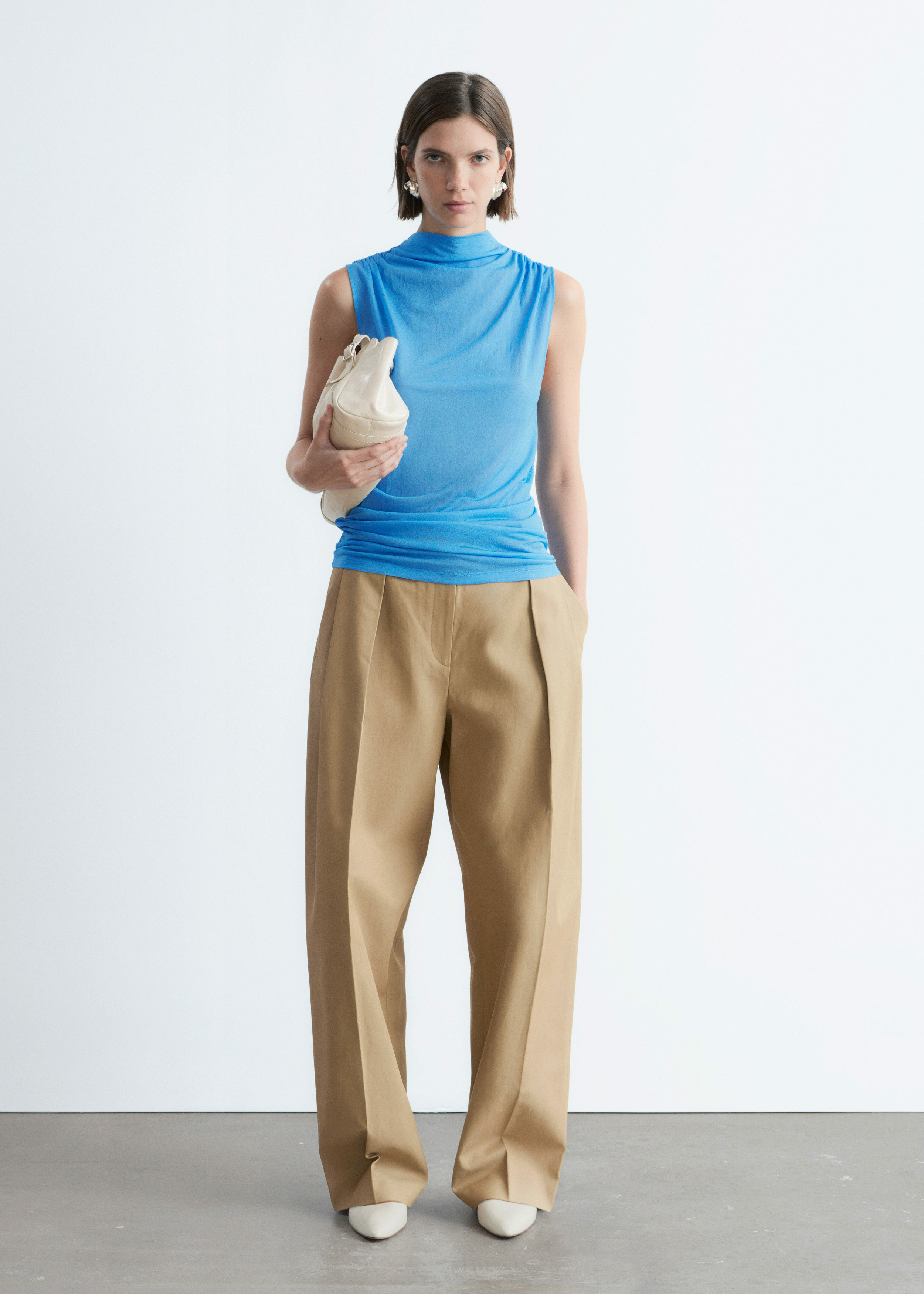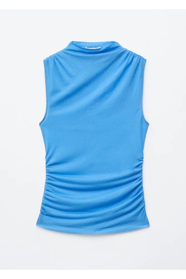 부드러운 저지 소재의 슬리브리스 탑이에요. 핏 되는 실루엣, 모크 넥, 은은한 셔링이 시선을 사로잡는답니다.