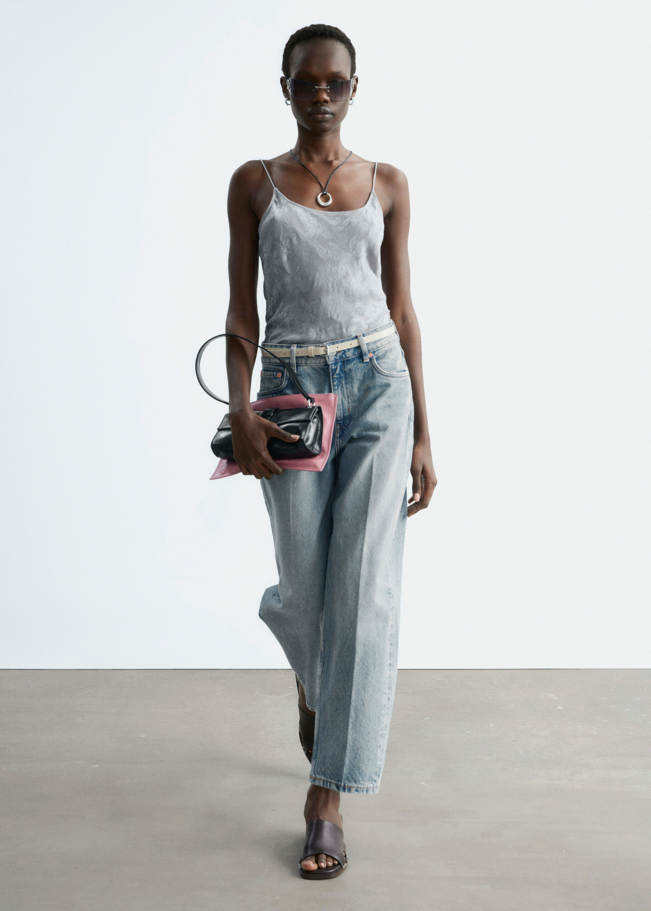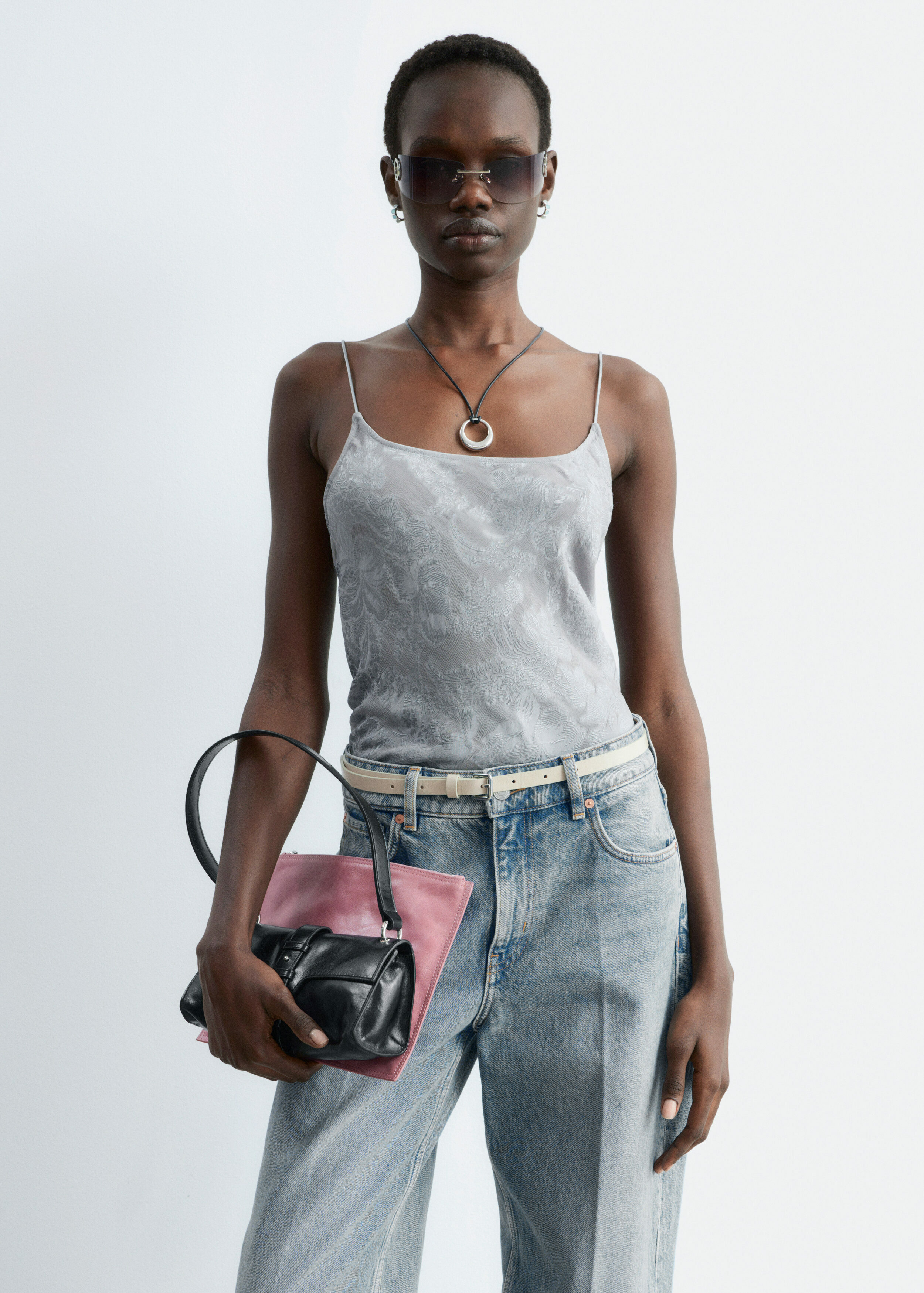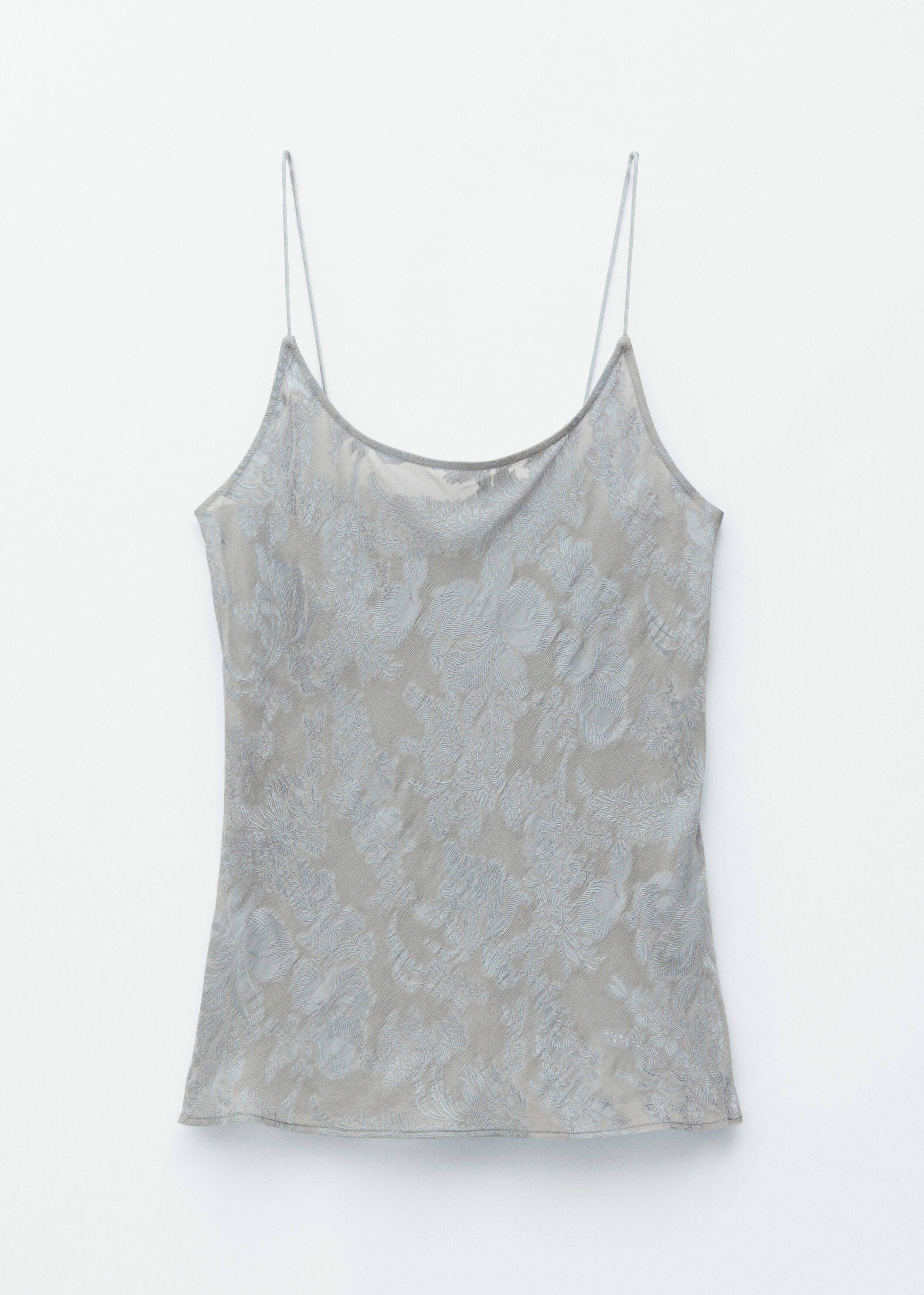 90년대 미니멀리즘을 재해석한 섬세한 무드의 캐미솔이에요. 가볍고 유려한 드레이프감이 돋보이는 실크 & 비스코스 혼방 소재로 탄생했으며, 내추럴하고 편안한 움직임을 연출한답니다. 스파게티 스트랩과 정교한 플로럴 자카드 디테일이 매력을 더해주어요.
