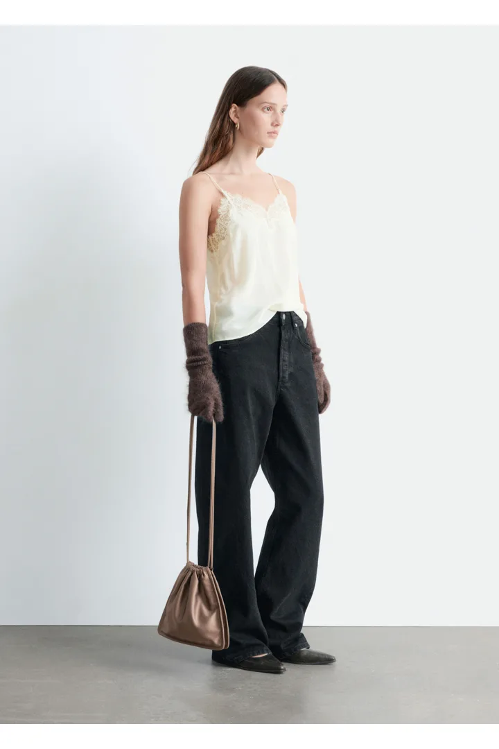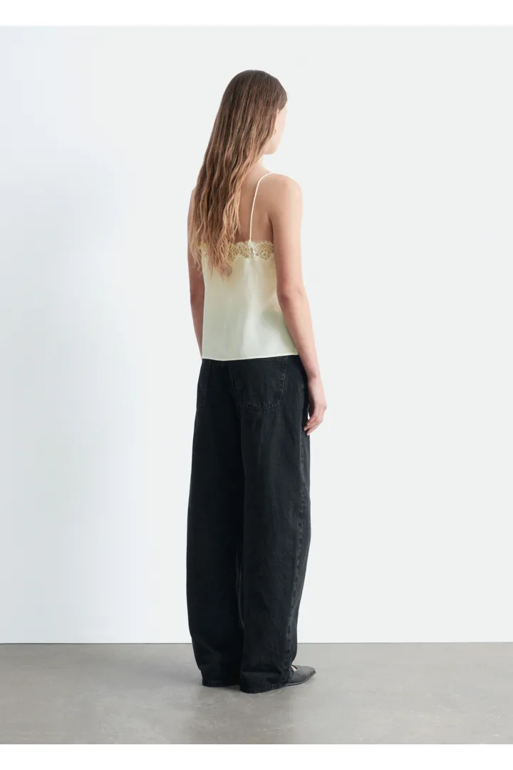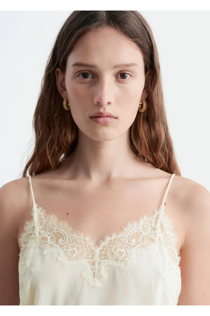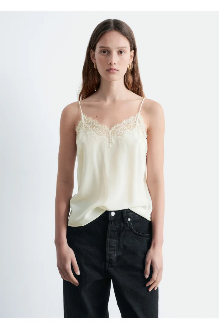 90년대 아이콘을 새롭게 재해석한 캐미솔이에요. 미니멀한 감각이 특징으로, 데님 진과 함께 근사한 데일리 룩을 연출할 수 있답니다. 100% 멀베리 실크 소재로 탄생했으며, 섬세한 레이스가 포인트로 자리한 클래식 V 넥, 얇은 숄더 스트랩, 그리고 측면부에 3개의 엘라스틱 루프 단추가 특징이에요.
