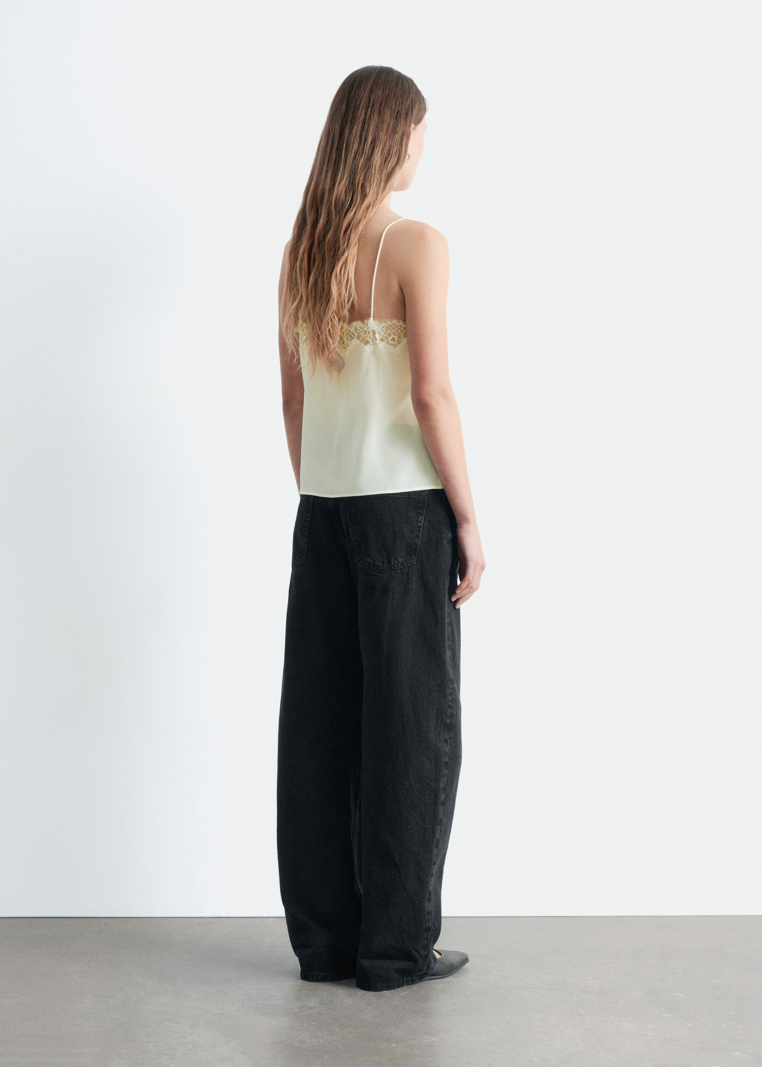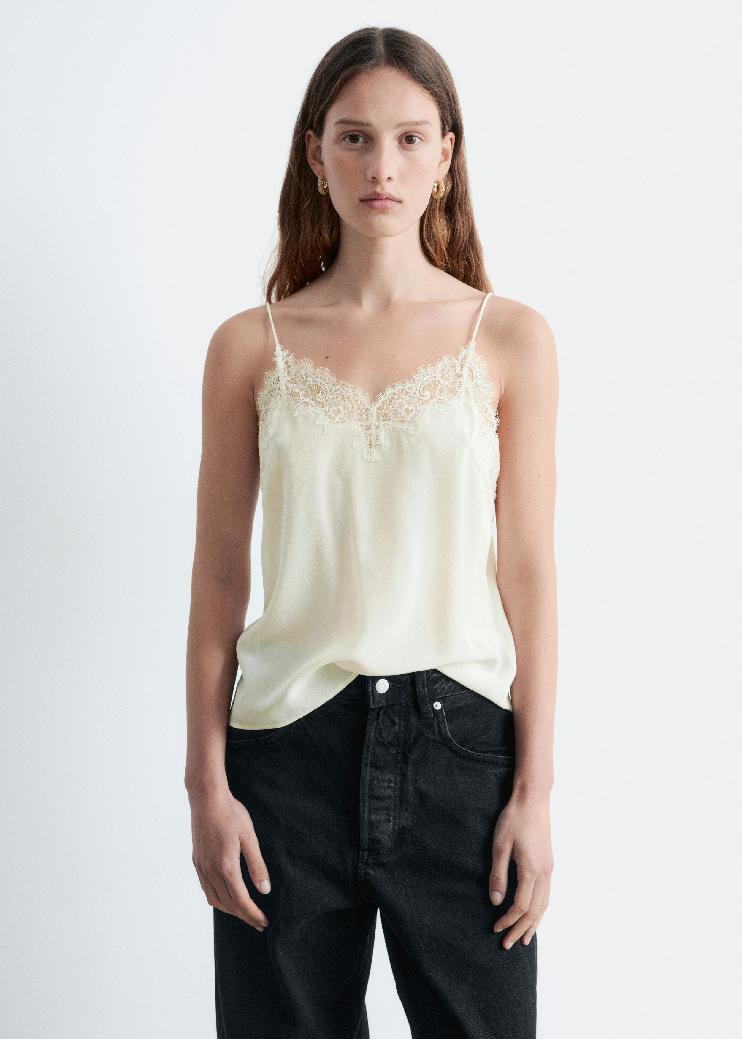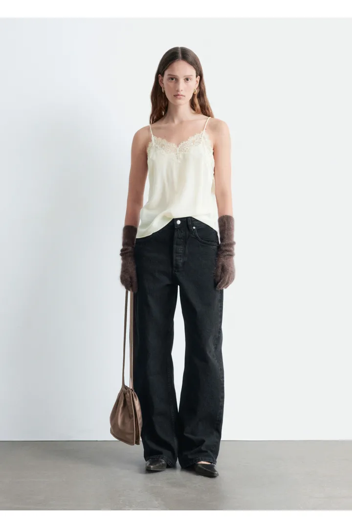 90년대 아이콘을 새롭게 재해석한 캐미솔이에요. 미니멀한 감각이 특징으로, 데님 진과 함께 근사한 데일리 룩을 연출할 수 있답니다. 100% 멀베리 실크 소재로 탄생했으며, 섬세한 레이스가 포인트로 자리한 클래식 V 넥, 얇은 숄더 스트랩, 그리고 측면부에 3개의 엘라스틱 루프 단추가 특징이에요.