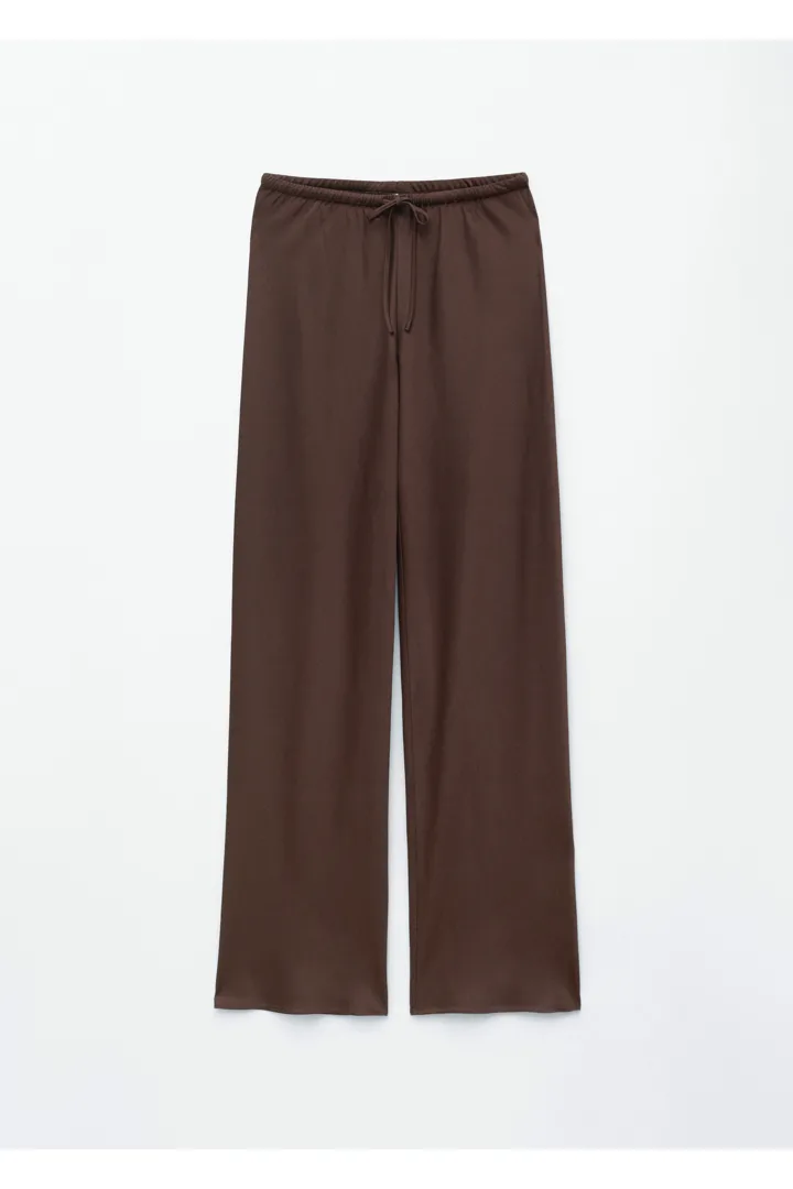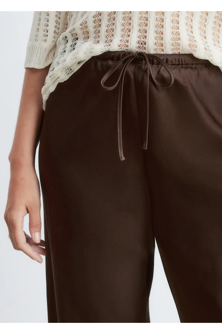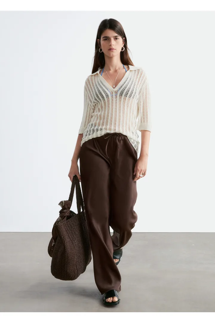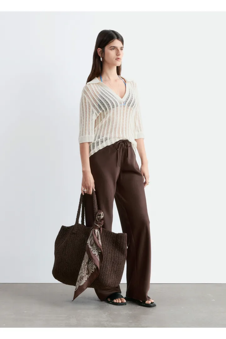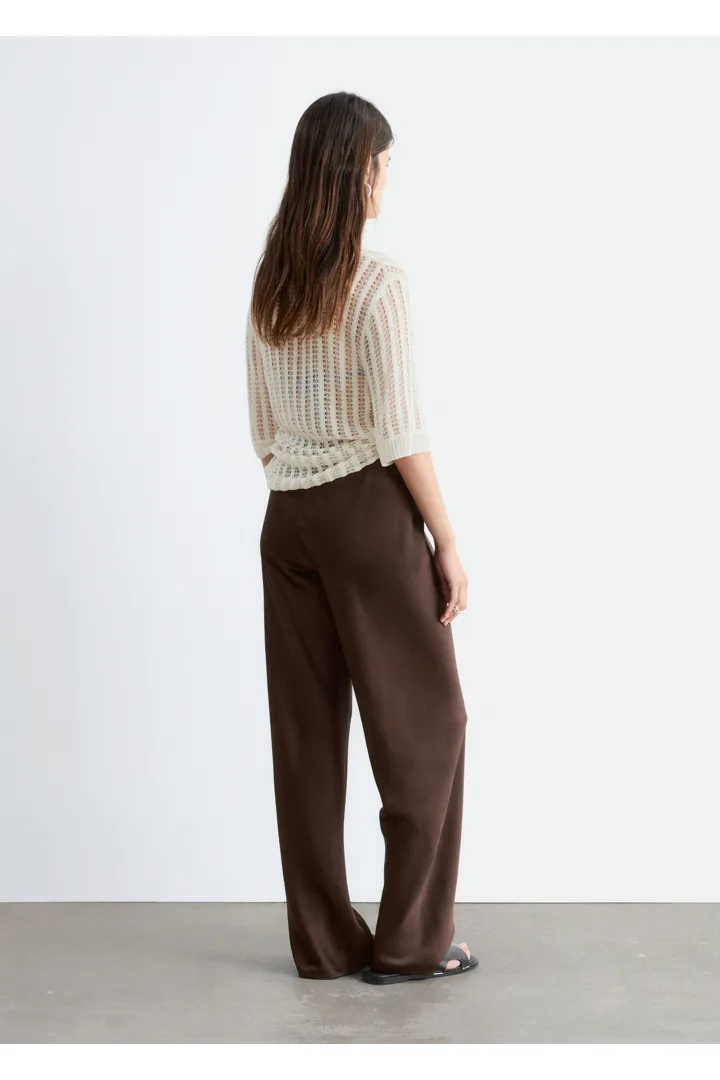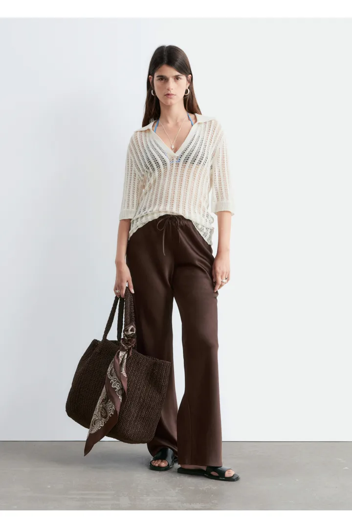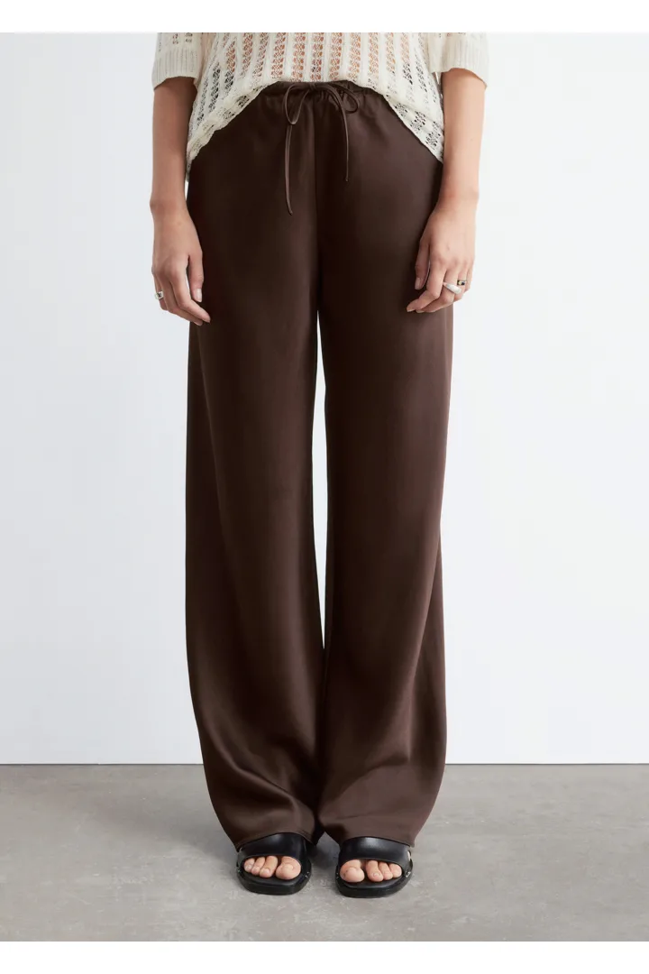 입는 순간 기분이 좋아지는 로우 웨이스트 트라우저예요. 루즈 실루엣과 유려한 트윌 혼방 소재로 탄생했으며, 동일 소재의 드로스트링이 있는 신축성 좋은 허리밴드로 핏 조절이 가능하답니다. 옆 솔기가 없는 디자인으로 깔끔하고 단정한 룩이 특징이에요.