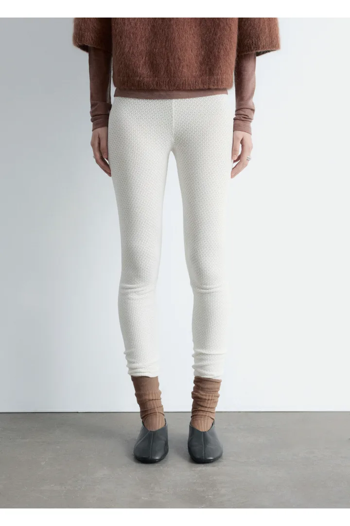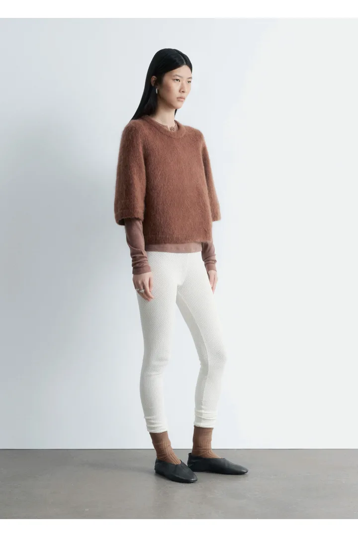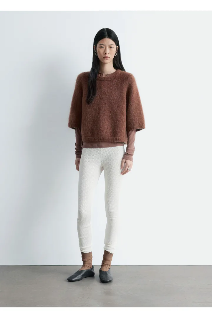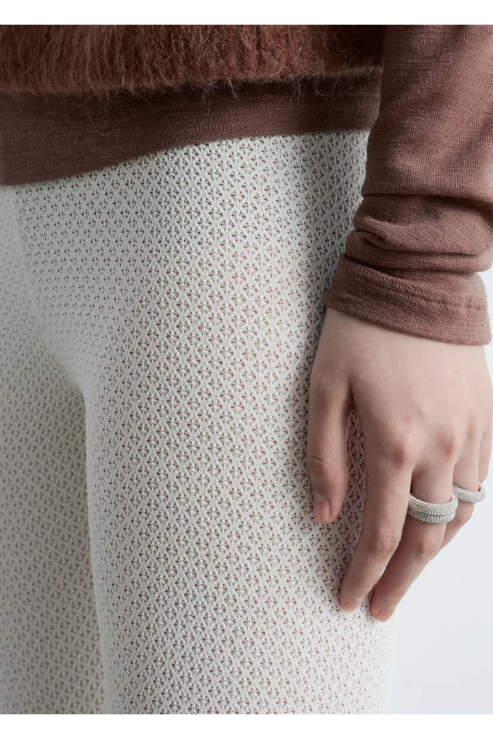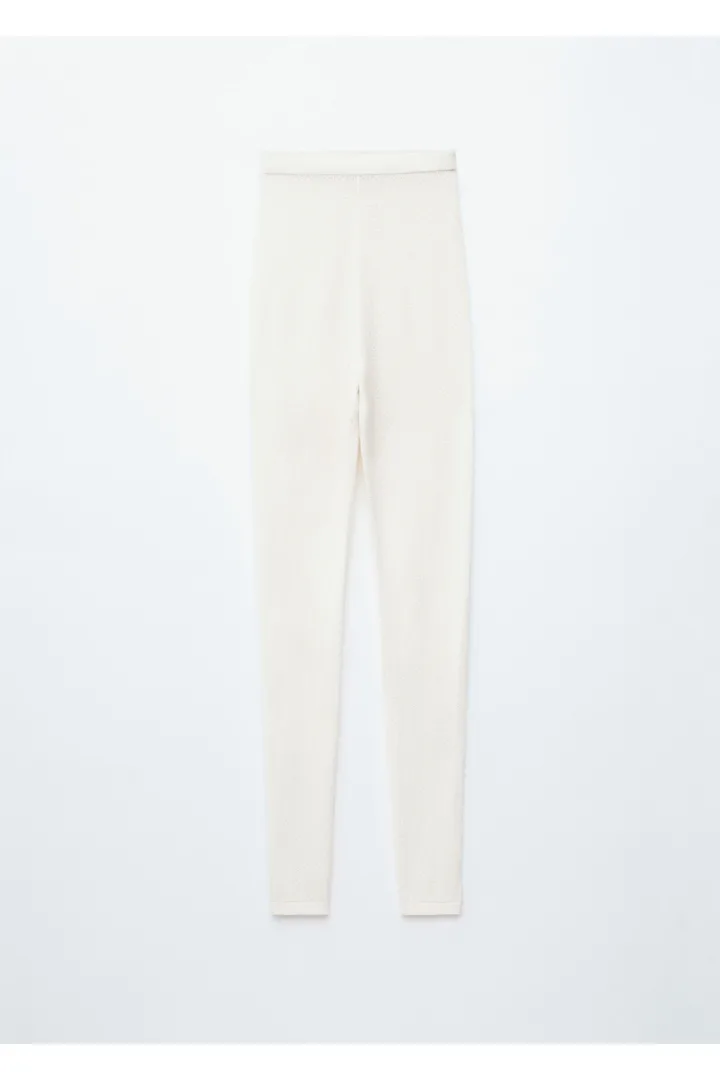 부드러운 포인텔 니트 소재로 탄생한 레깅스예요. 레귤러 웨이스트, 그리고 엘라스틱 허리밴드와 헴라인의 립 디테일이 특징이랍니다.