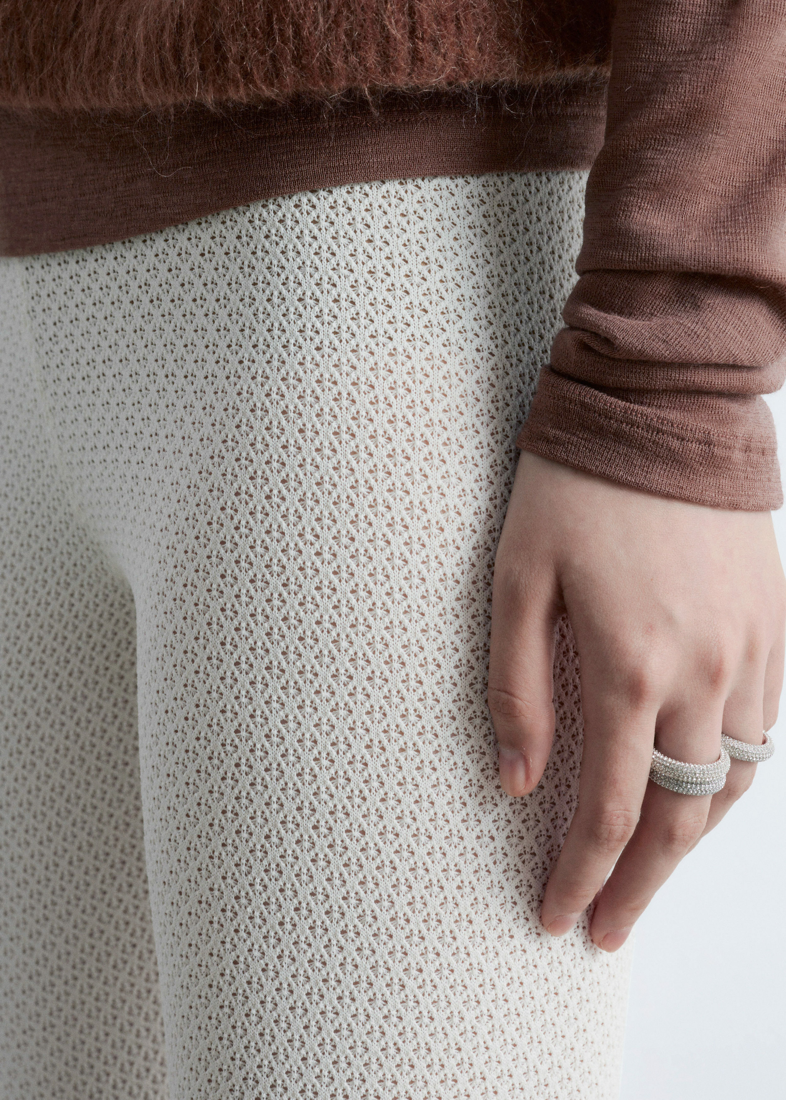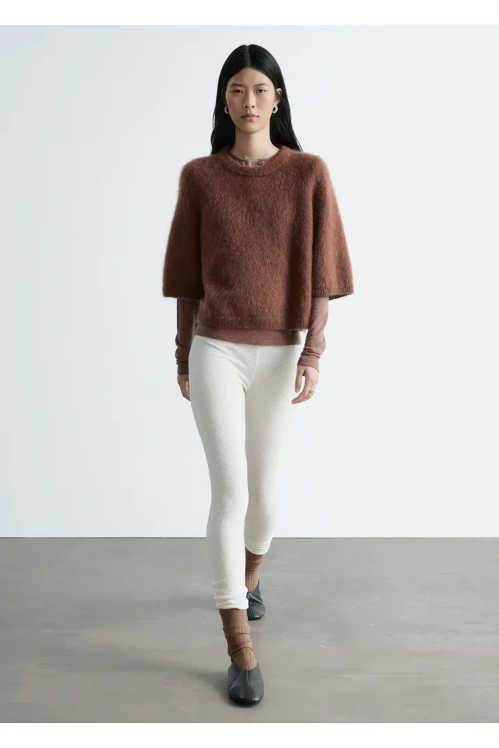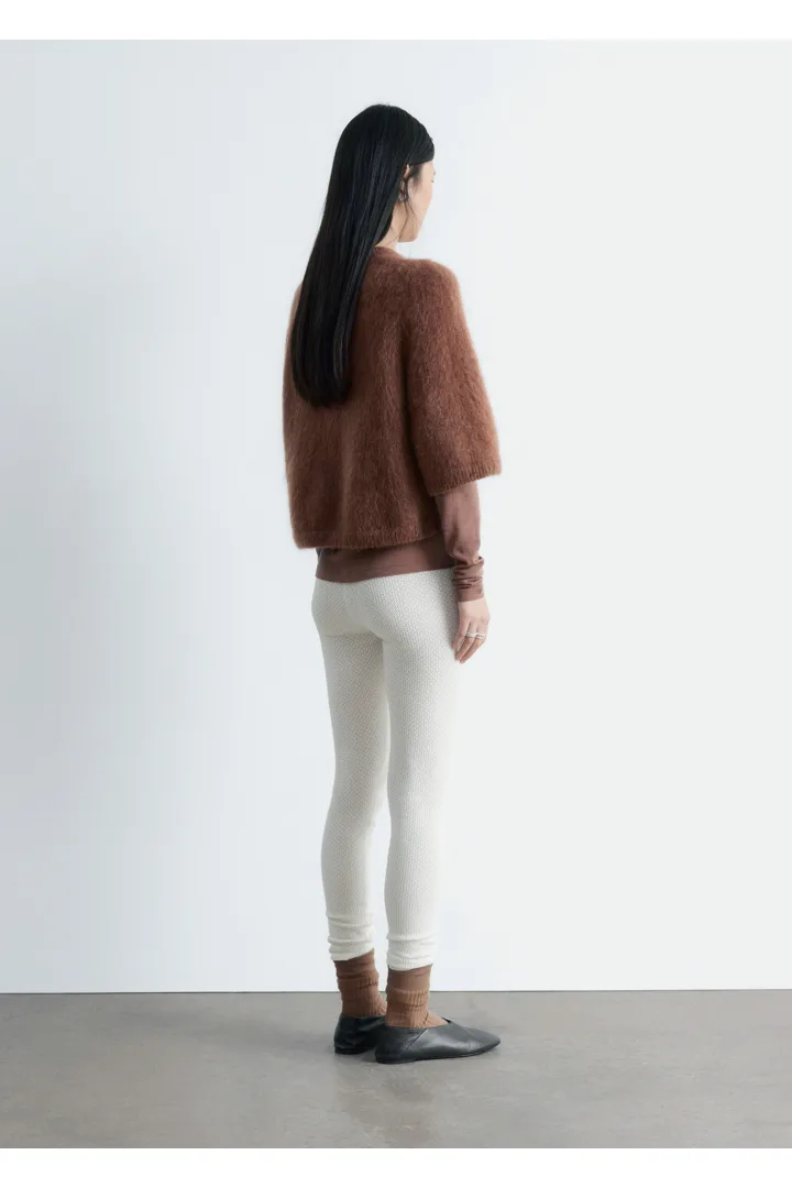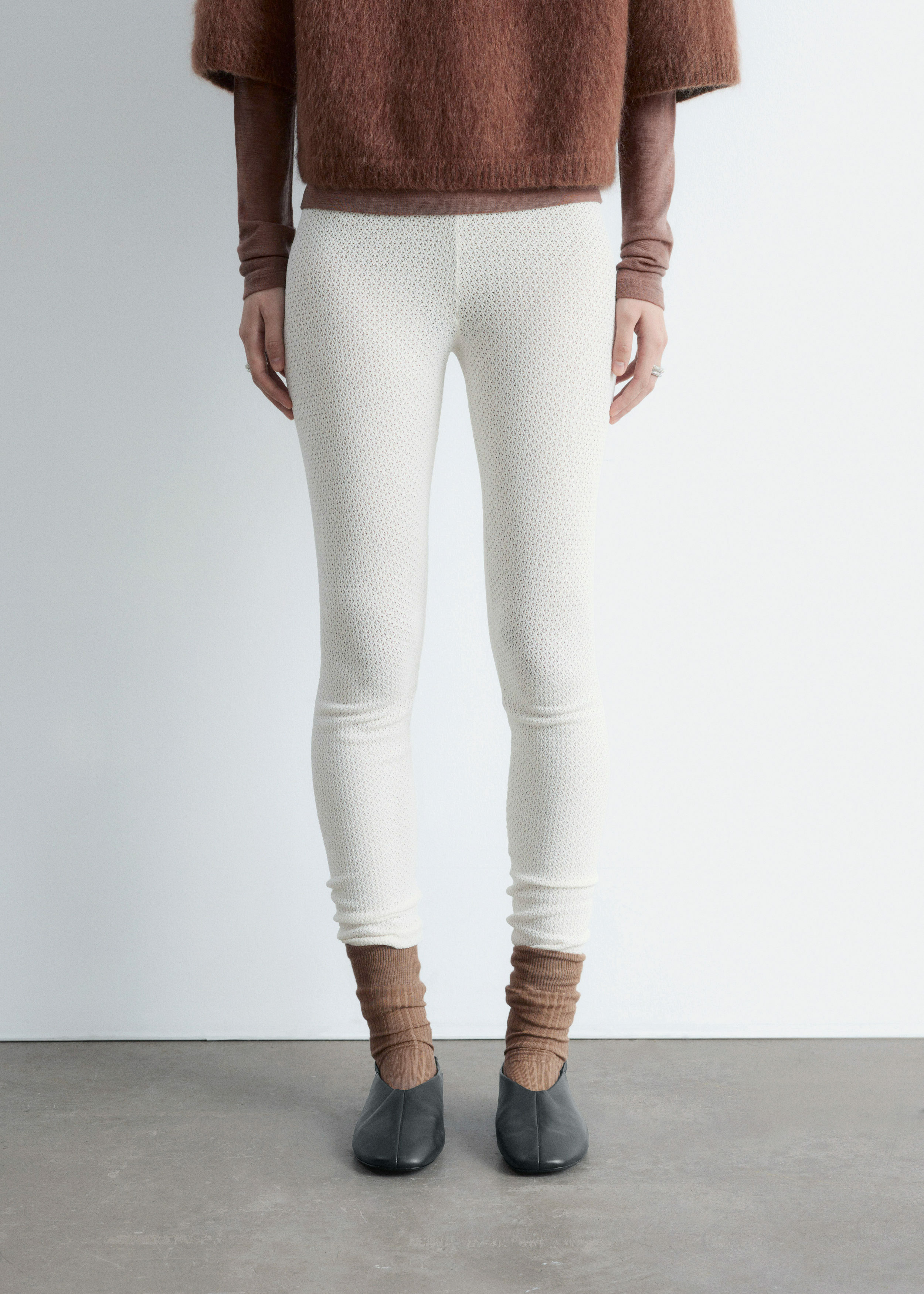 부드러운 포인텔 니트 소재로 탄생한 레깅스예요. 레귤러 웨이스트, 그리고 엘라스틱 허리밴드와 헴라인의 립 디테일이 특징이랍니다.