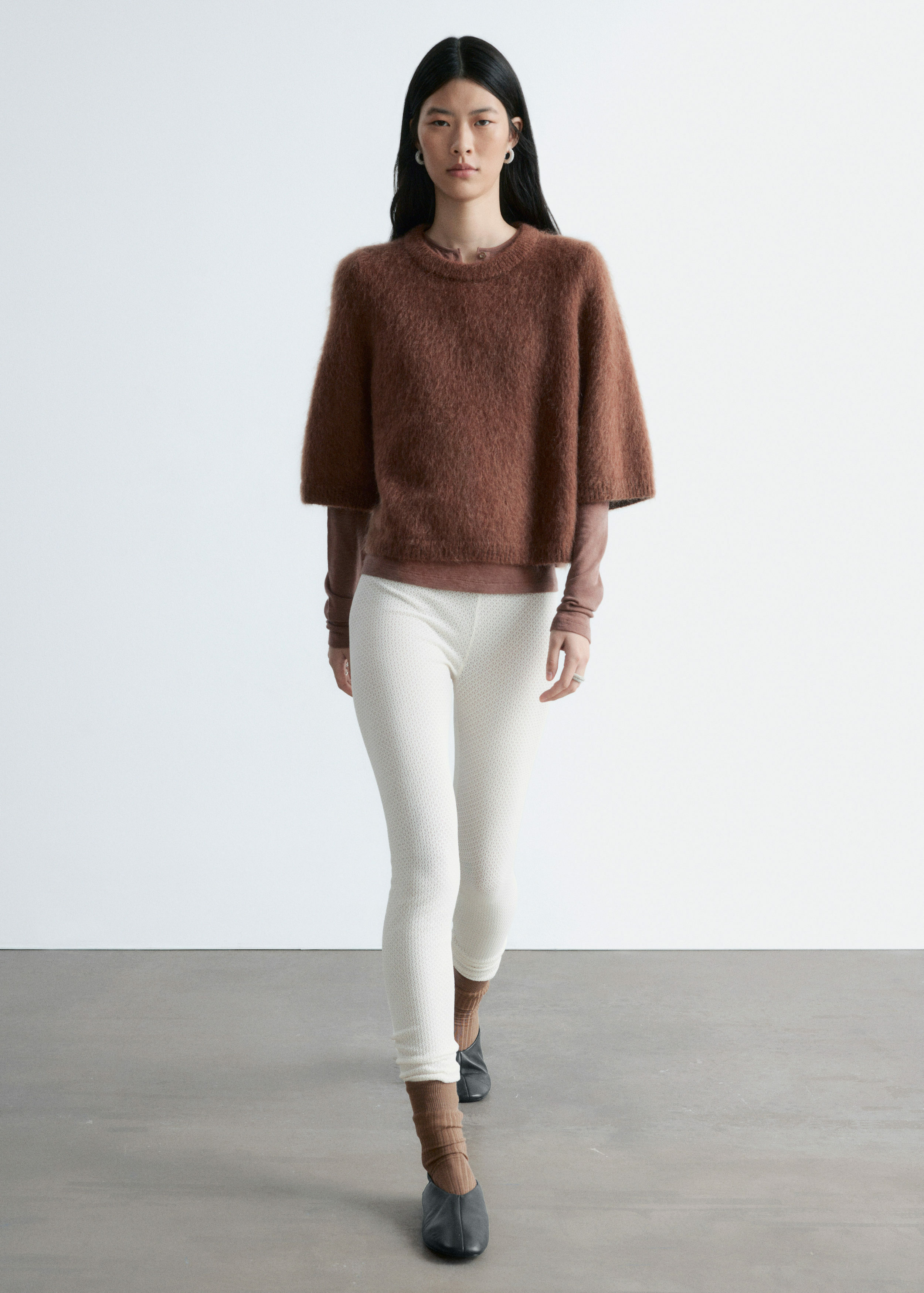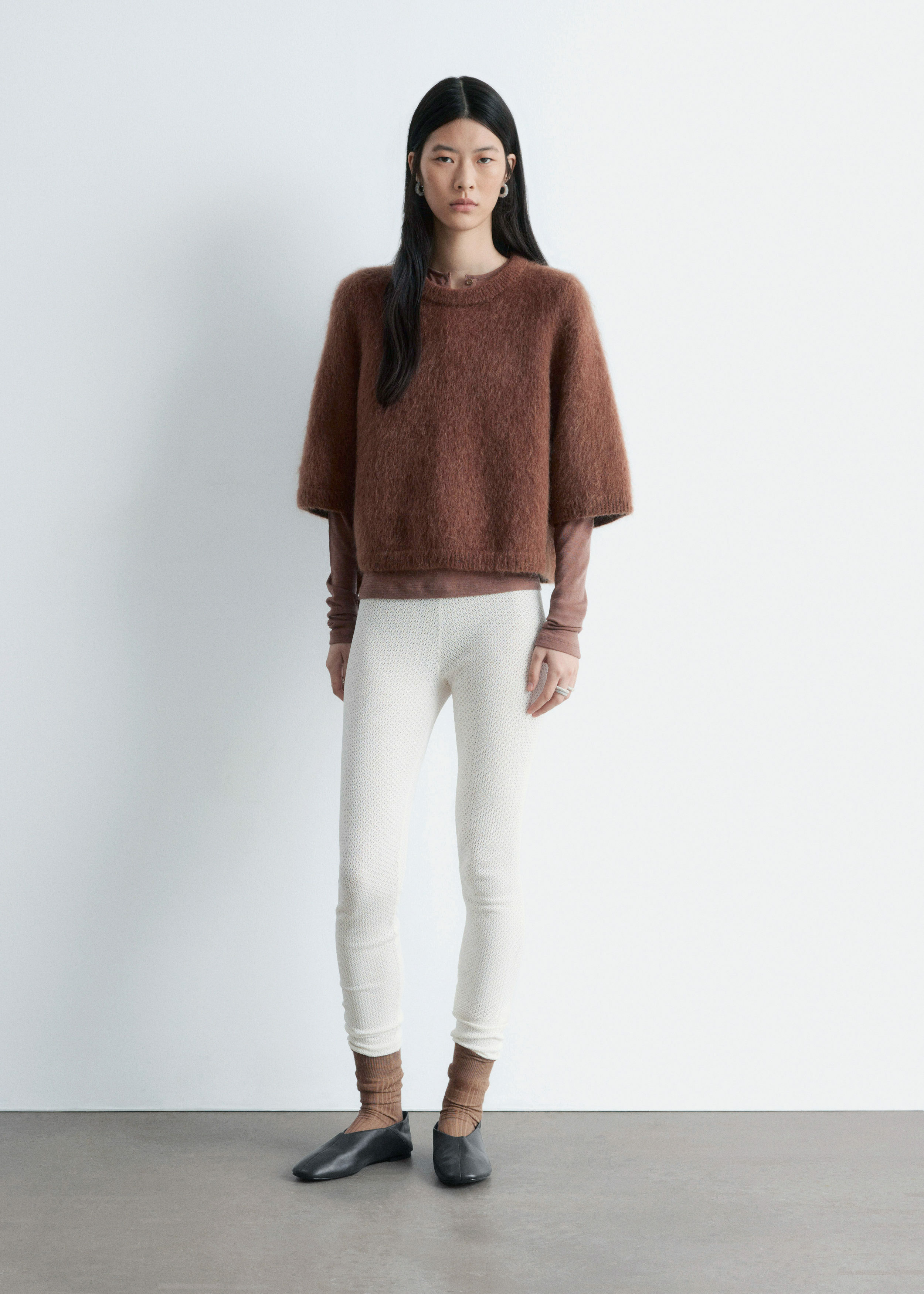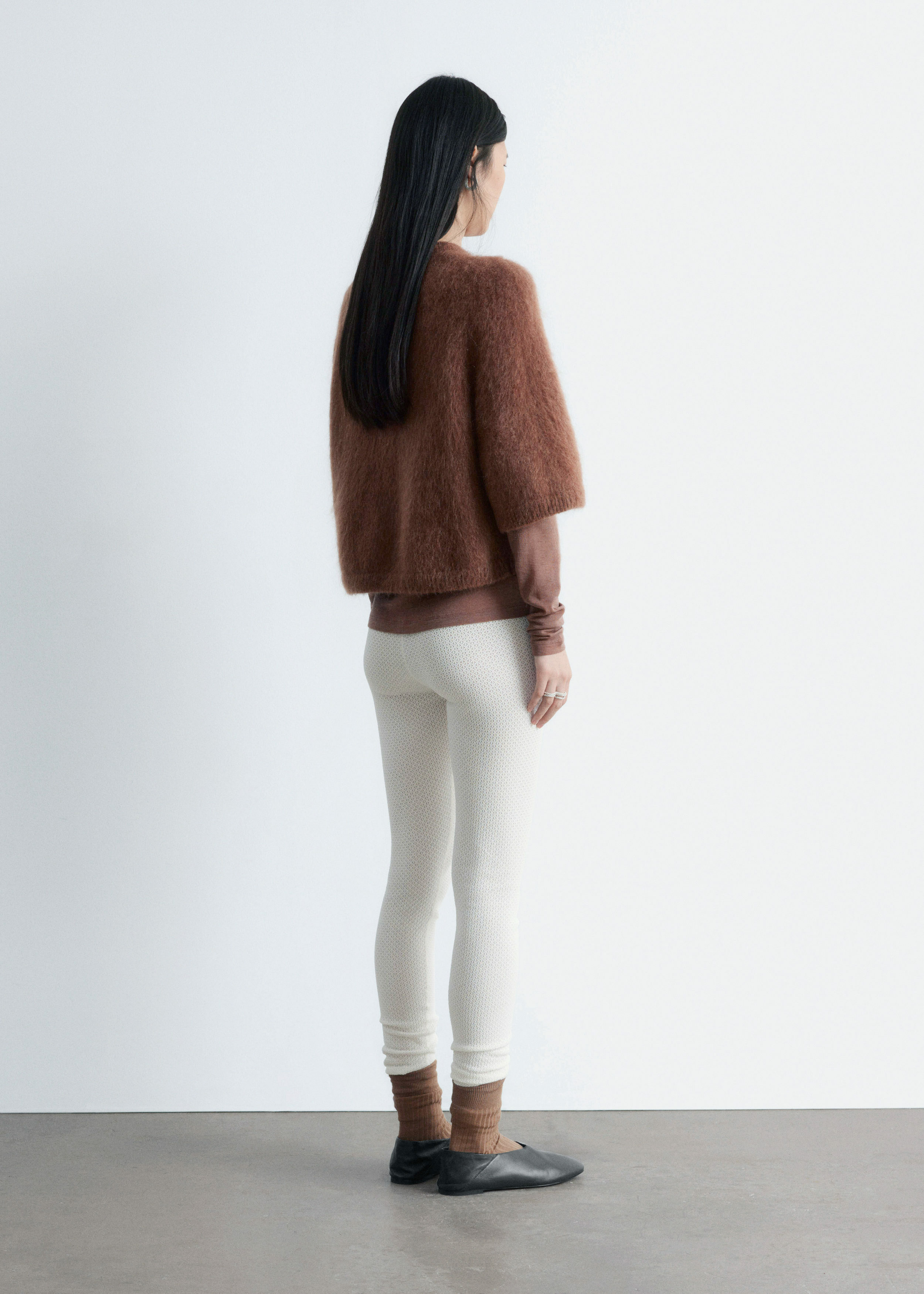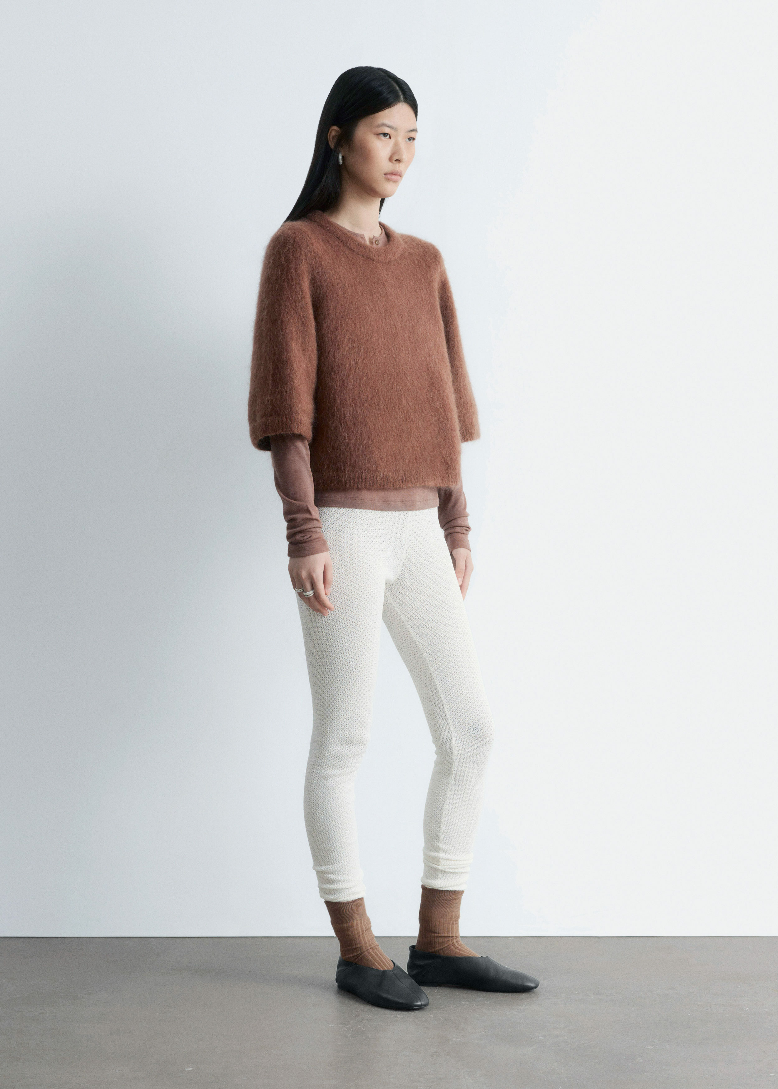 부드러운 포인텔 니트 소재로 탄생한 레깅스예요. 레귤러 웨이스트, 그리고 엘라스틱 허리밴드와 헴라인의 립 디테일이 특징이랍니다.