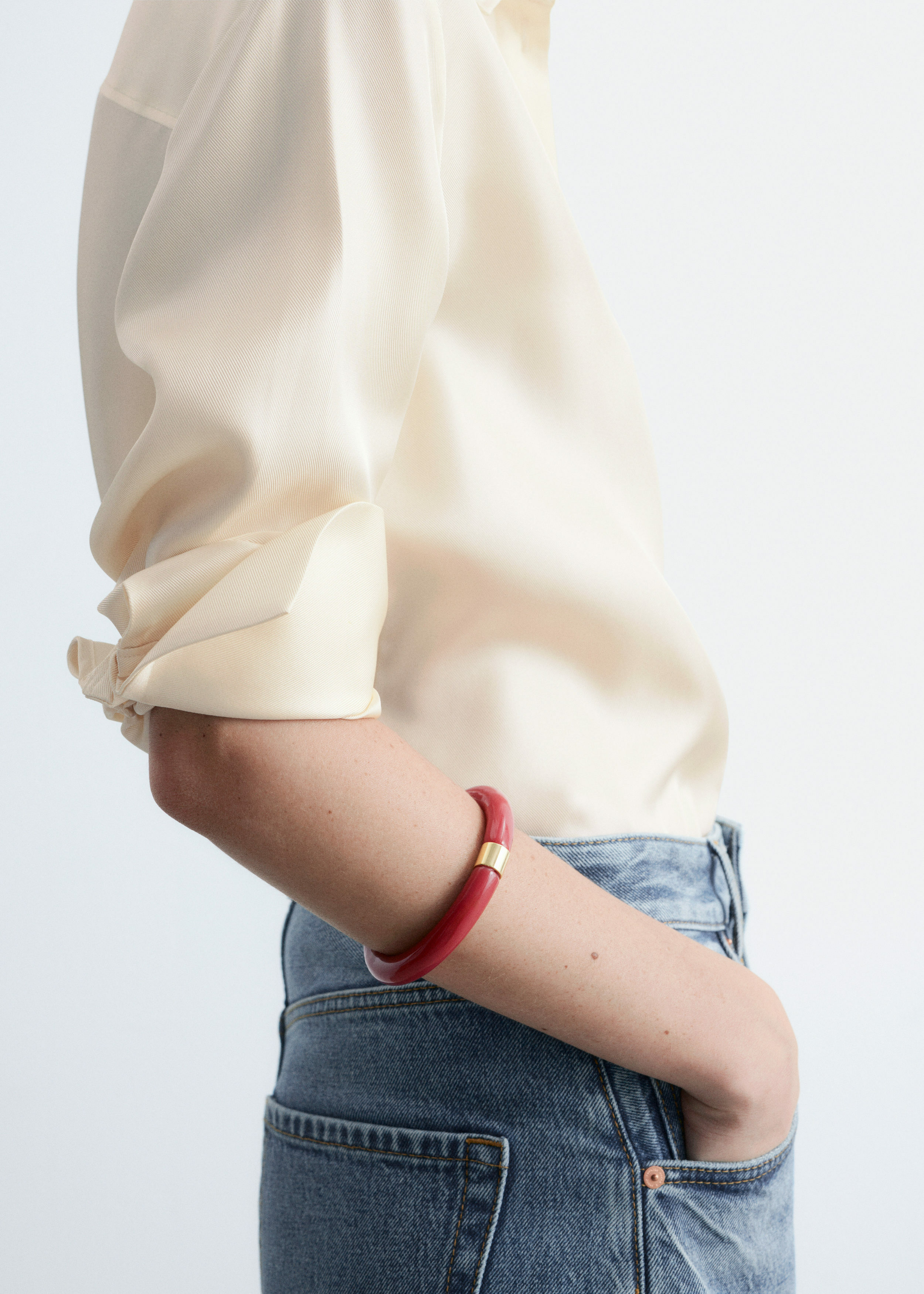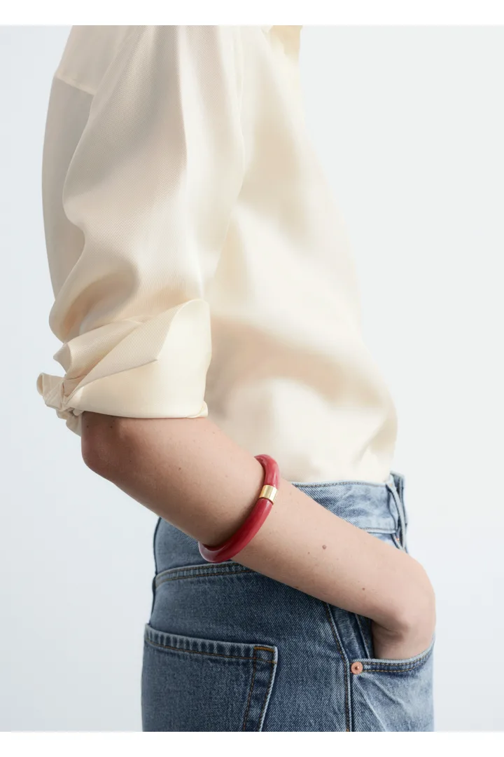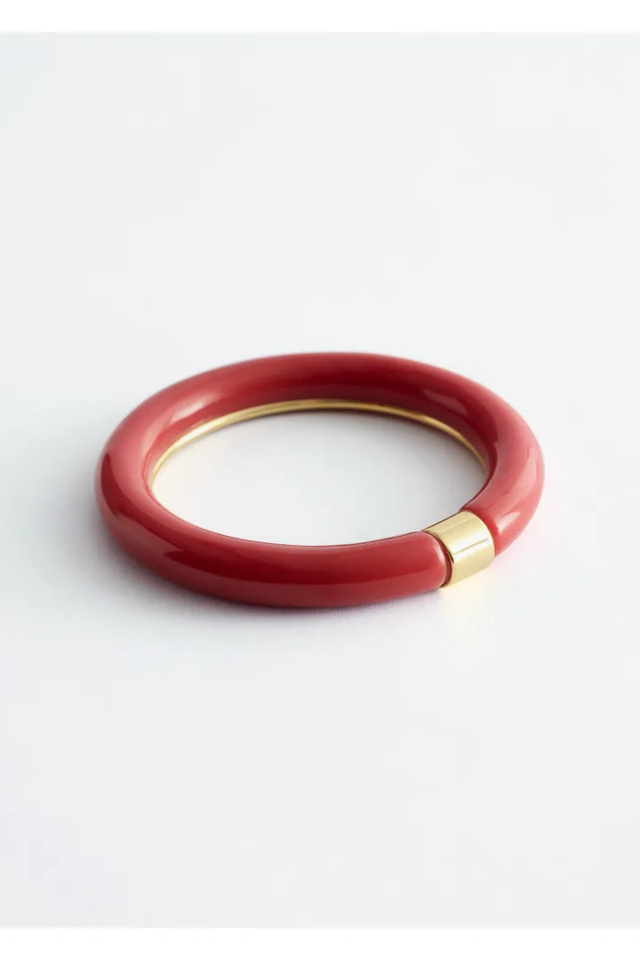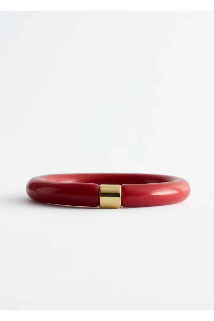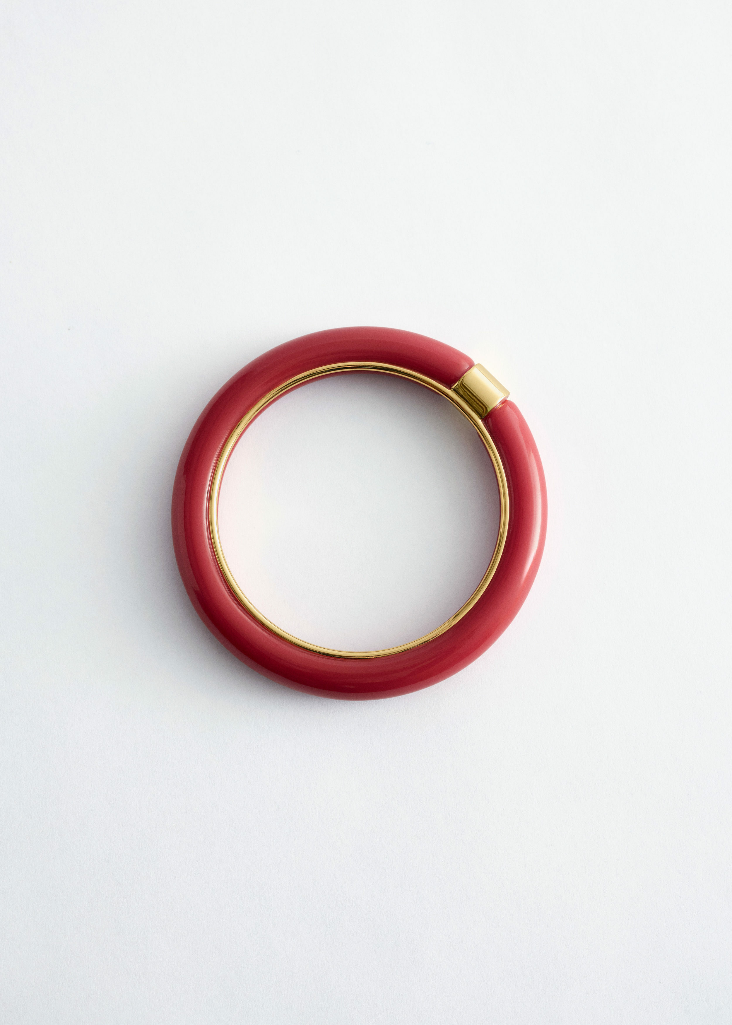 모던한 감각의 뱅글이에요. 부드러운 광택이 돋보이는 컬러 레진으로 탄생했으며, 대비되는 메탈 디테일이 자리해 있어요. 단독으로 착용하여 포인트를 주거나, 다른 브레이슬릿과 레이어링해 보세요.