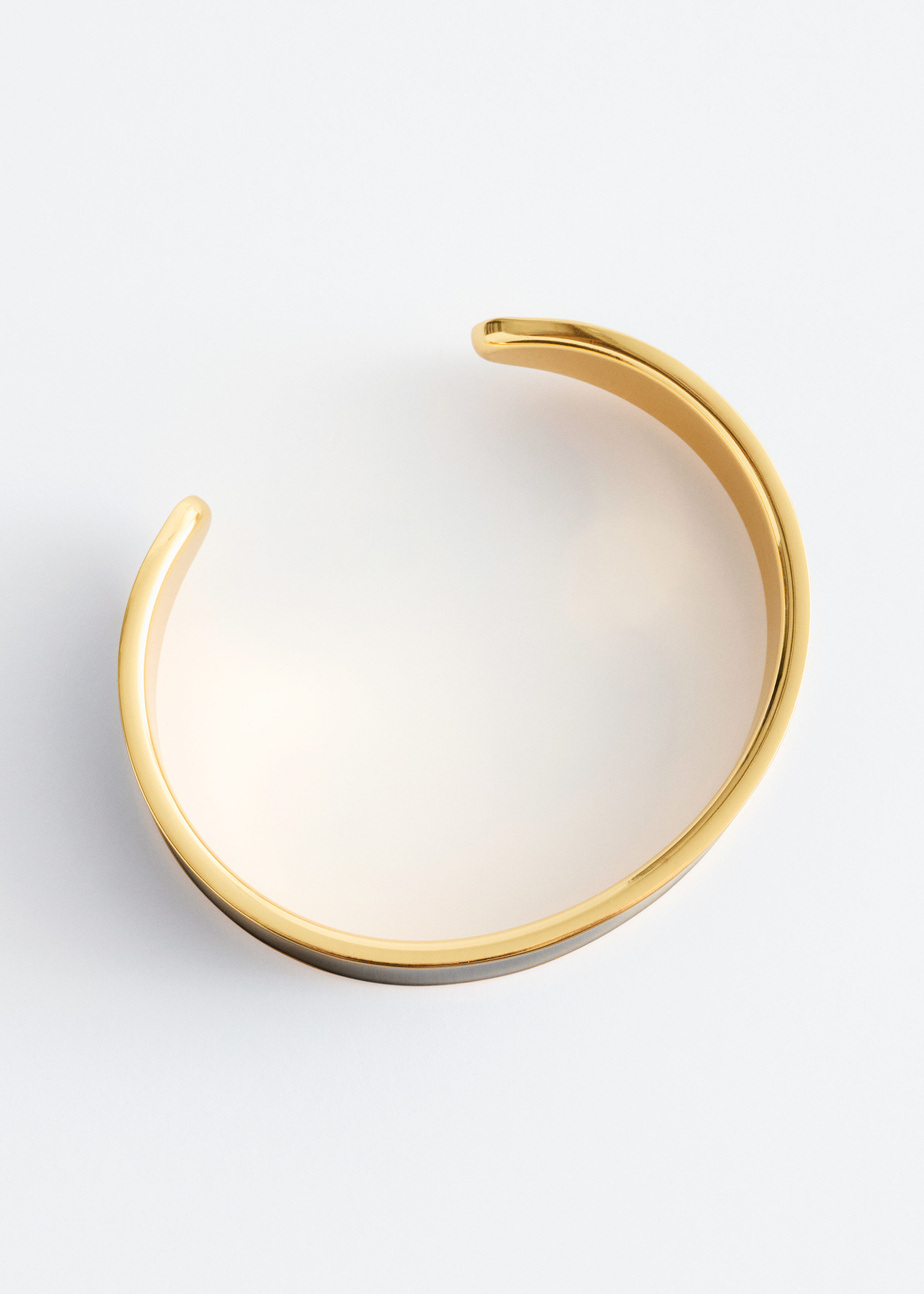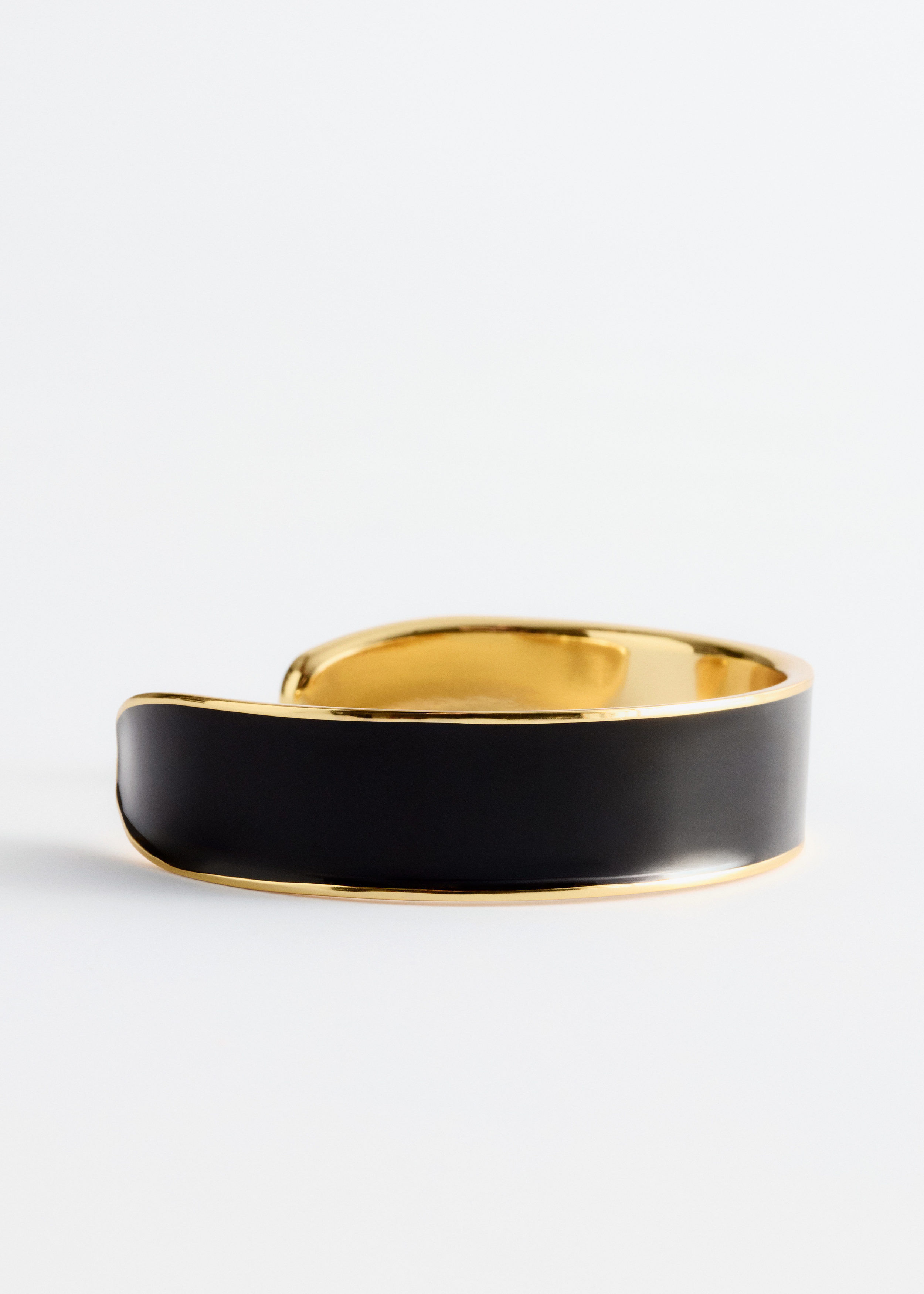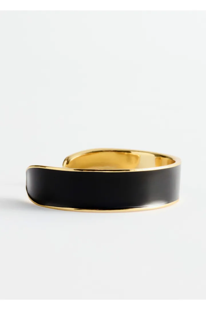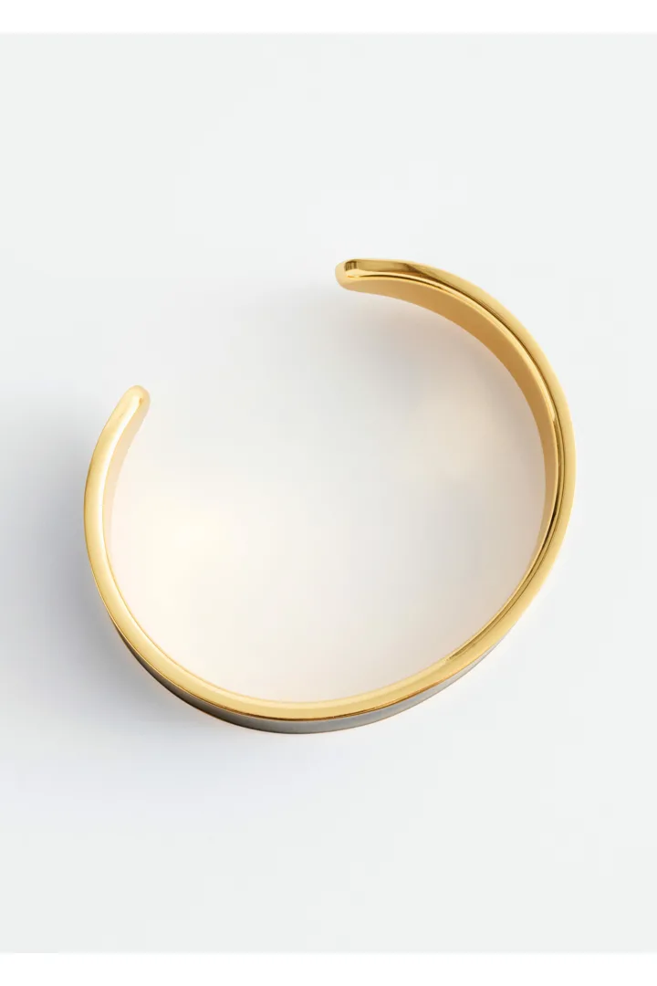 유광 브라스 소재의 커프 브레이슬릿이에요. 너비감 있는 리스트 밴드가 특징이며 겉면의 대비적인 컬러와 안쪽의 세련된 골드 톤 엣지로 모던한 투 톤 룩을 연출한답니다.