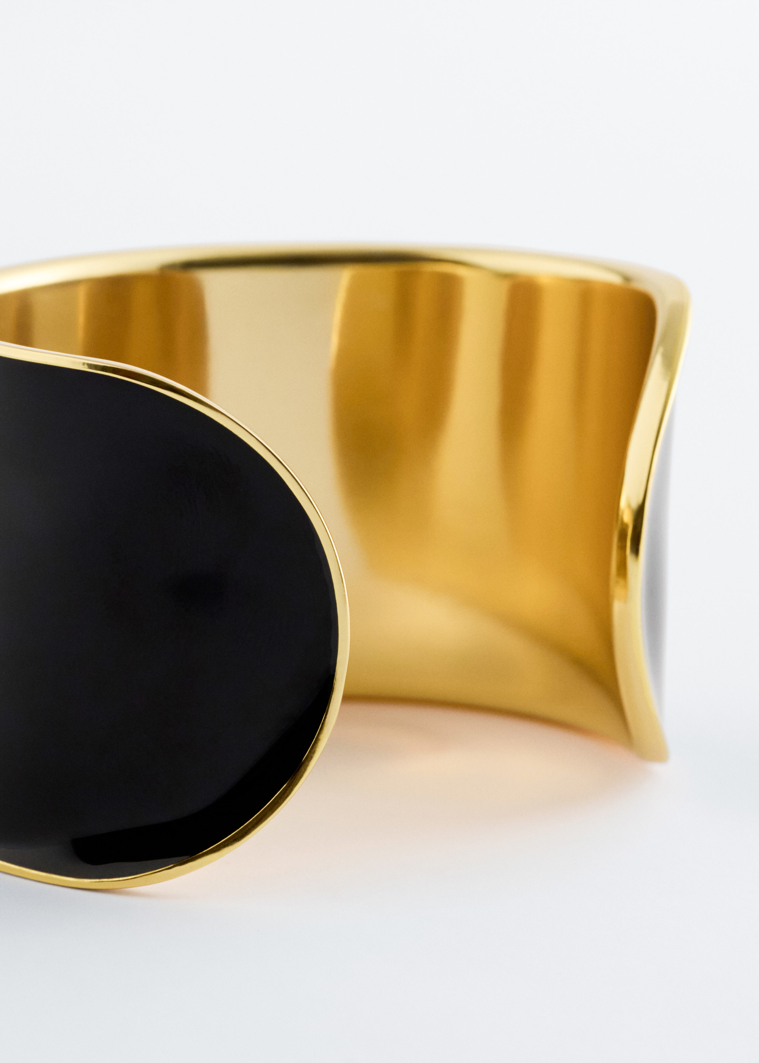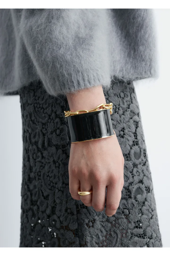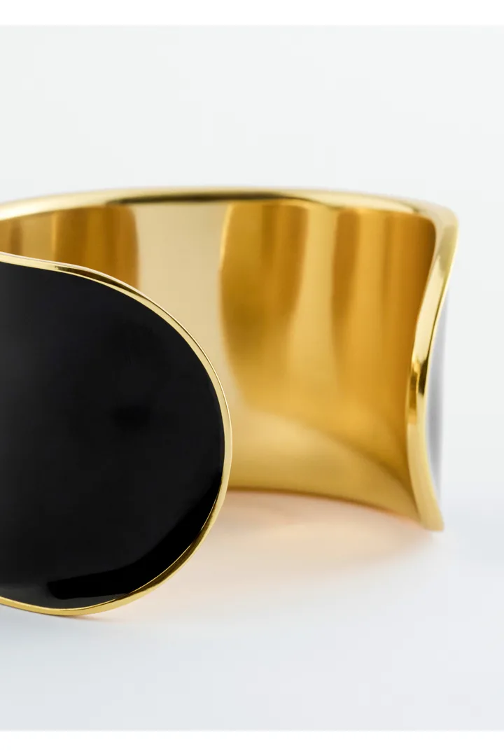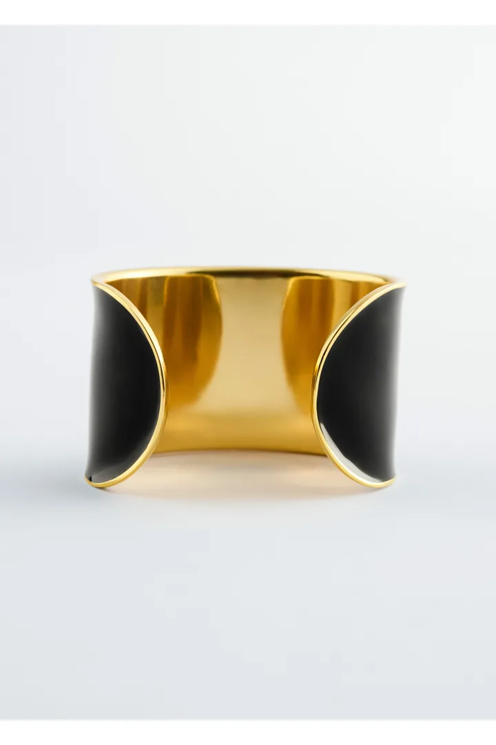 유광 브라스 소재의 커프 브레이슬릿이에요. 너비감 있는 리스트 밴드가 특징이며 겉면의 대비적인 컬러와 안쪽의 세련된 골드 톤 엣지로 모던한 투 톤 룩을 연출한답니다.