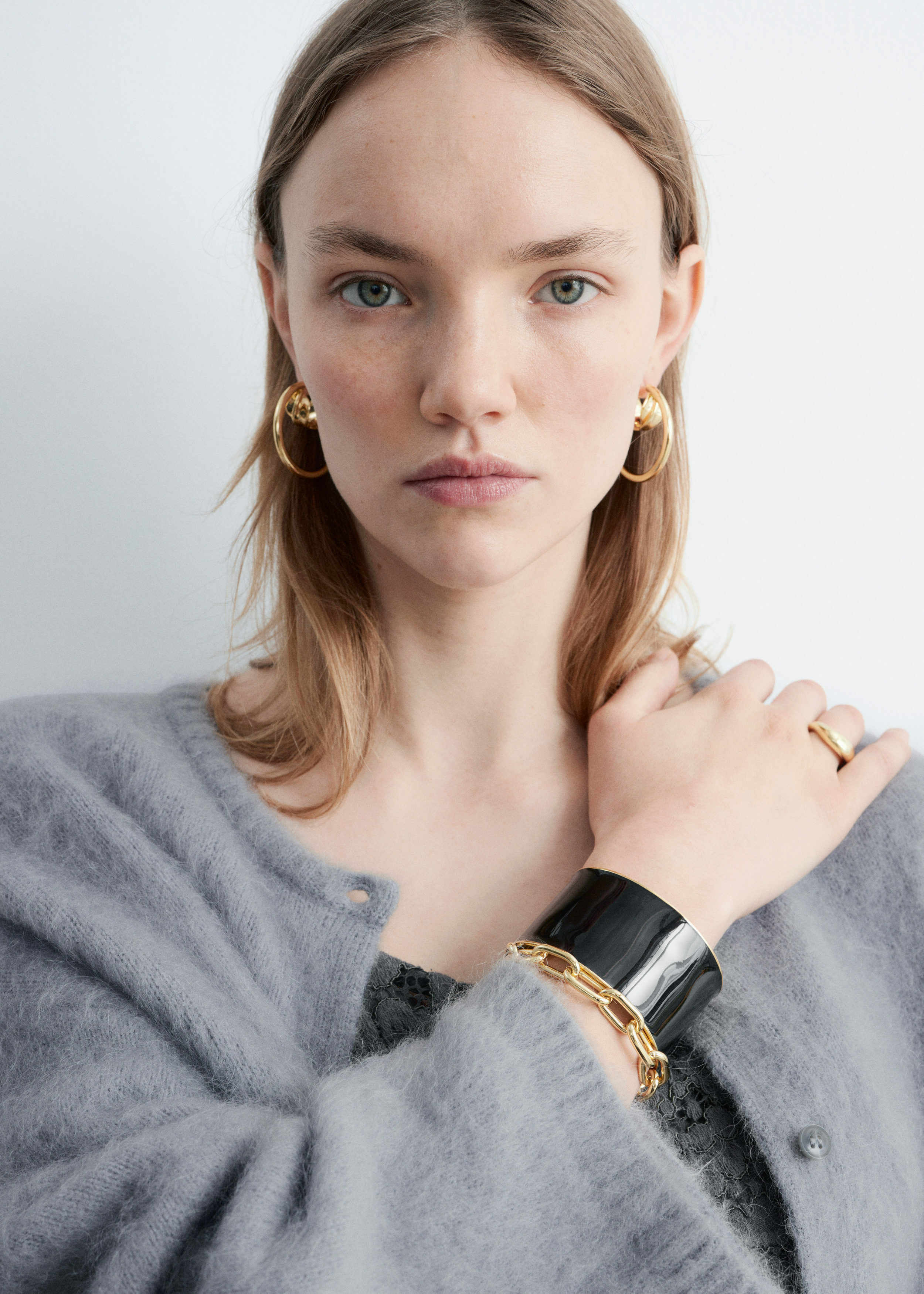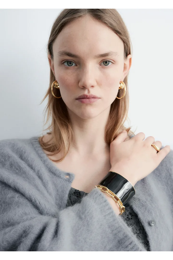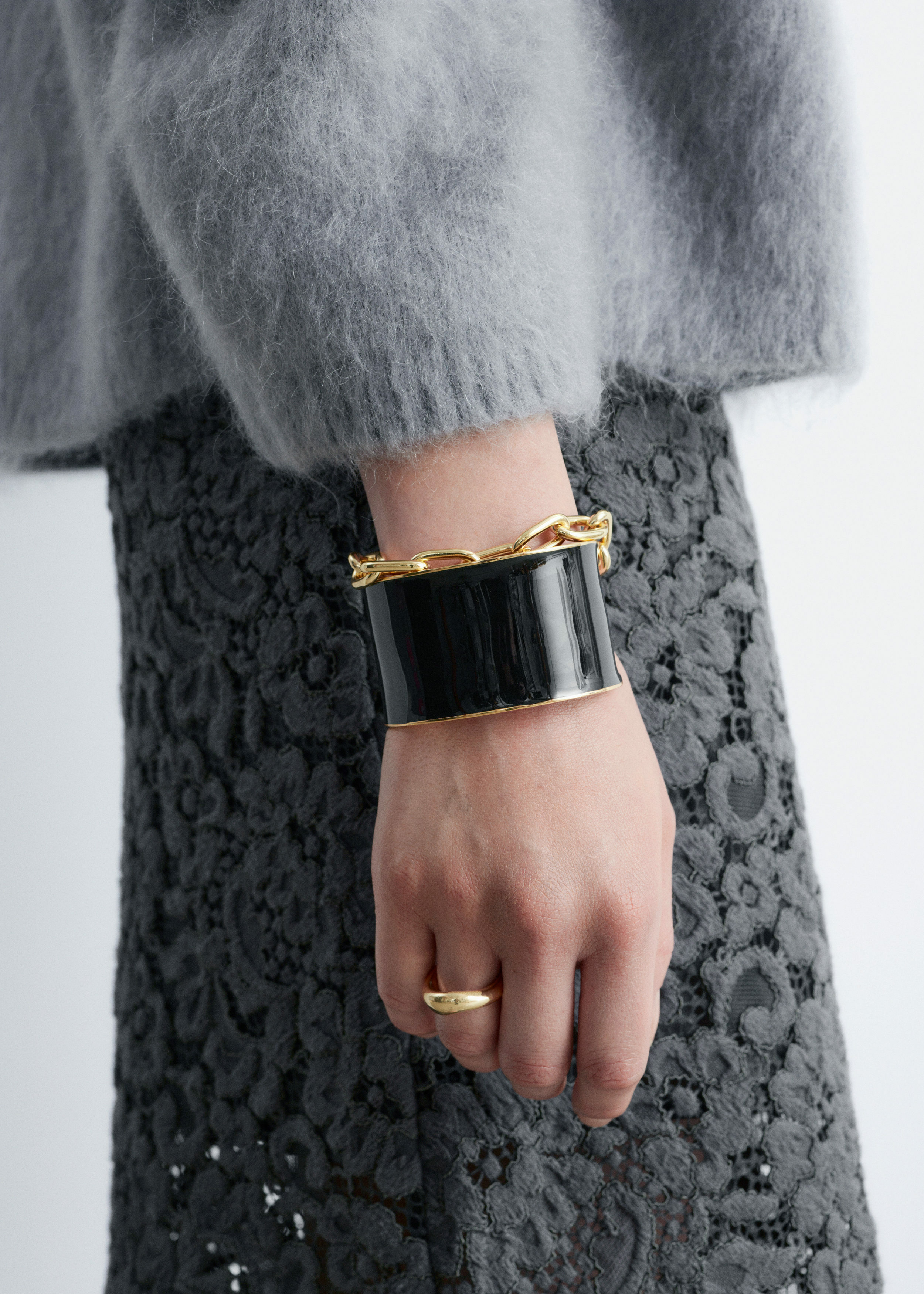 유광 브라스 소재의 커프 브레이슬릿이에요. 너비감 있는 리스트 밴드가 특징이며 겉면의 대비적인 컬러와 안쪽의 세련된 골드 톤 엣지로 모던한 투 톤 룩을 연출한답니다.