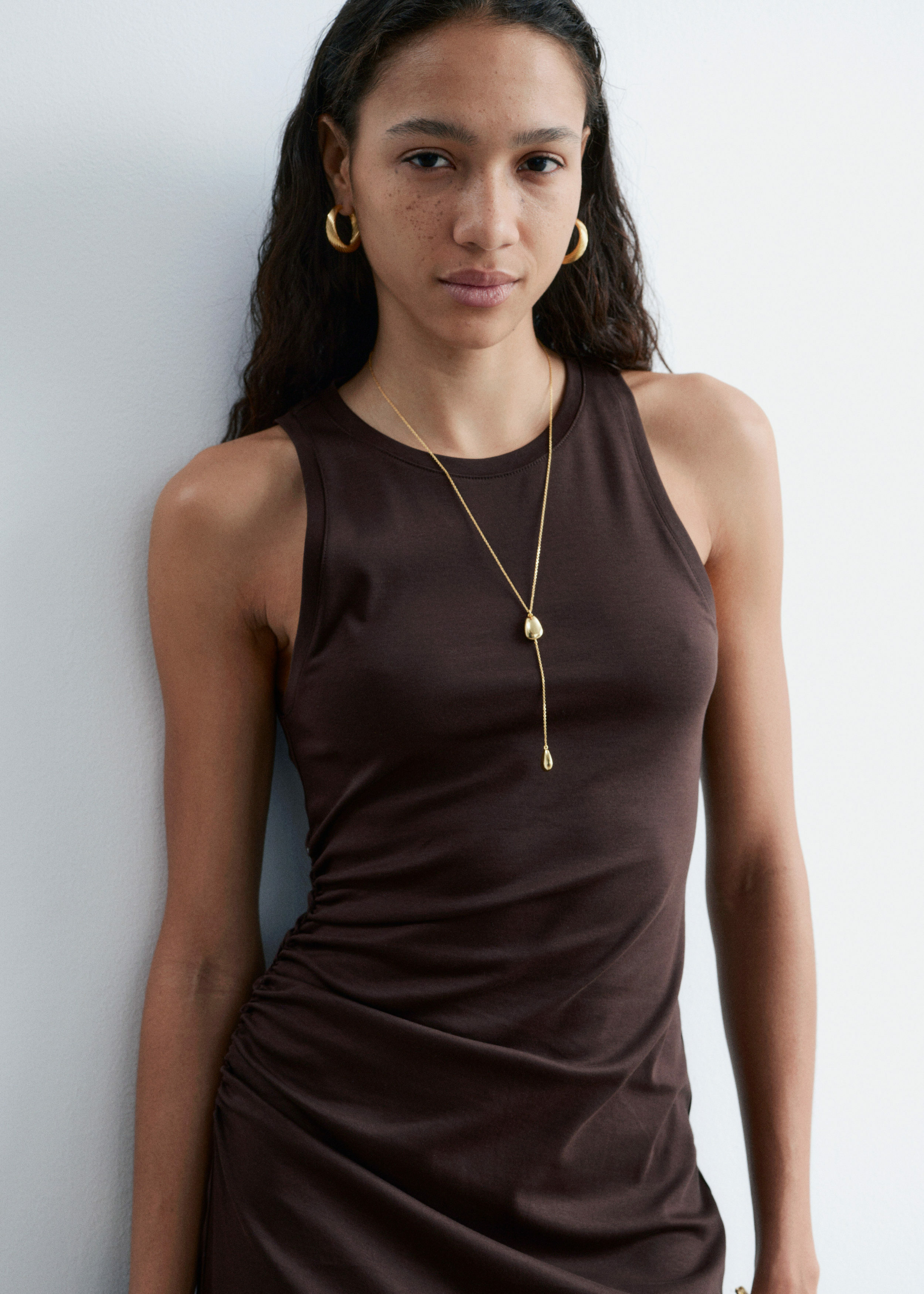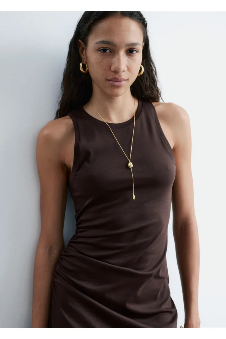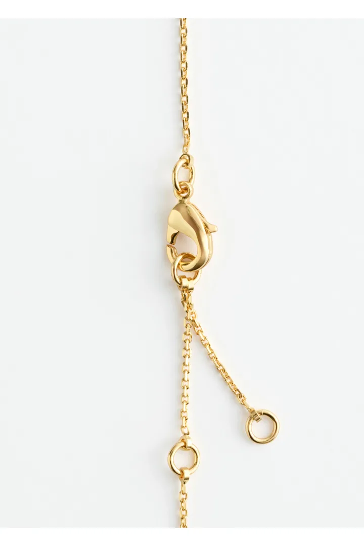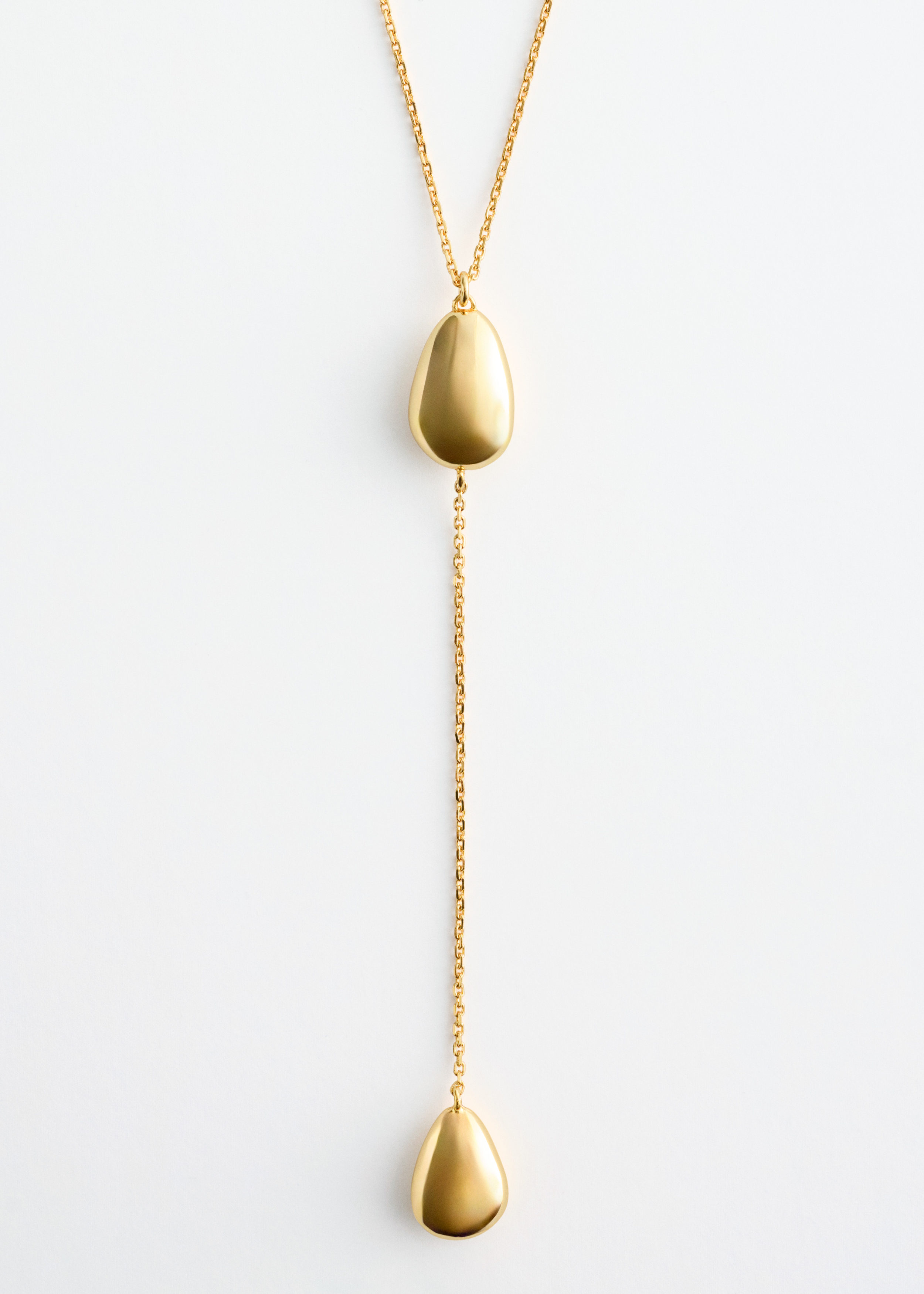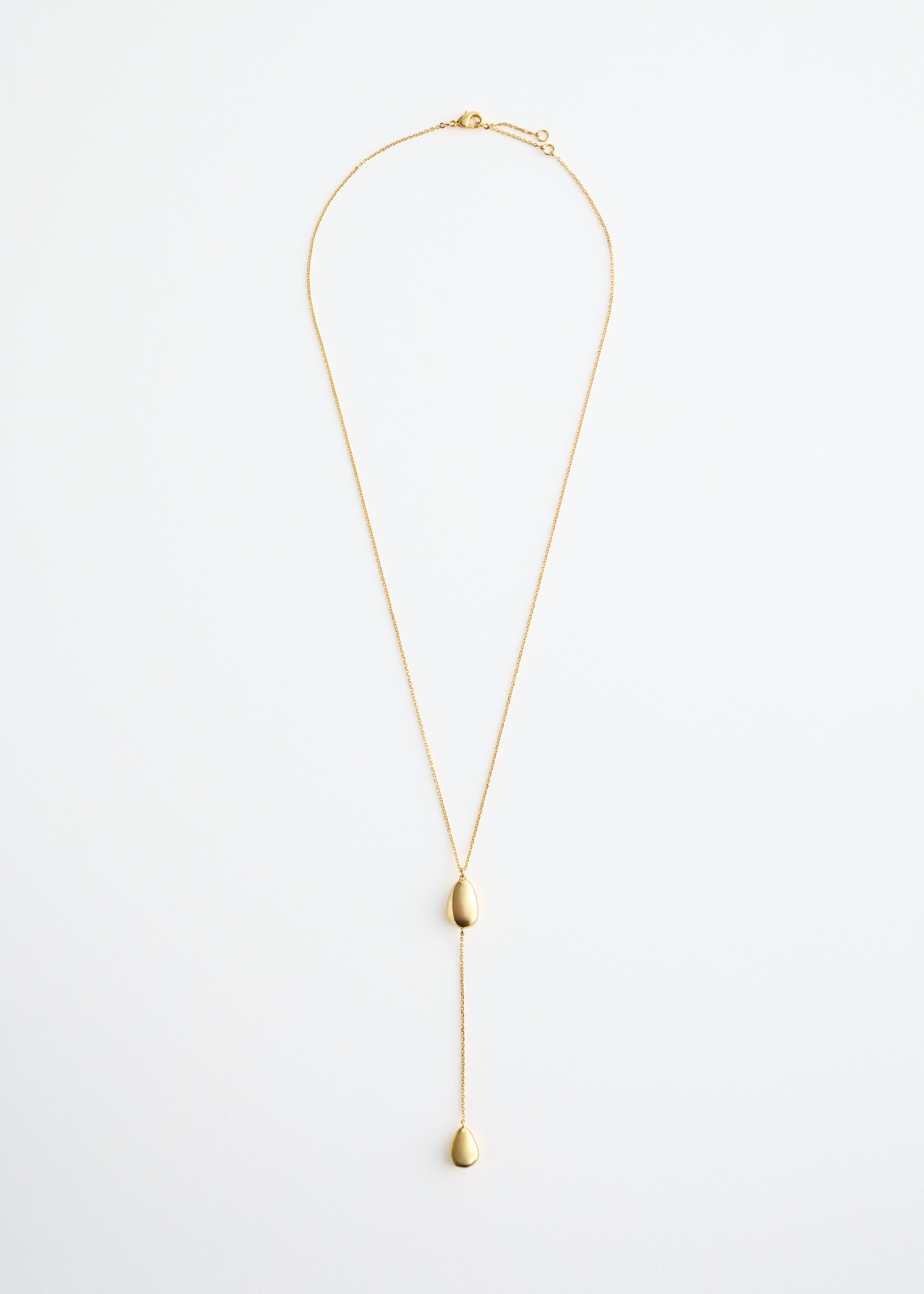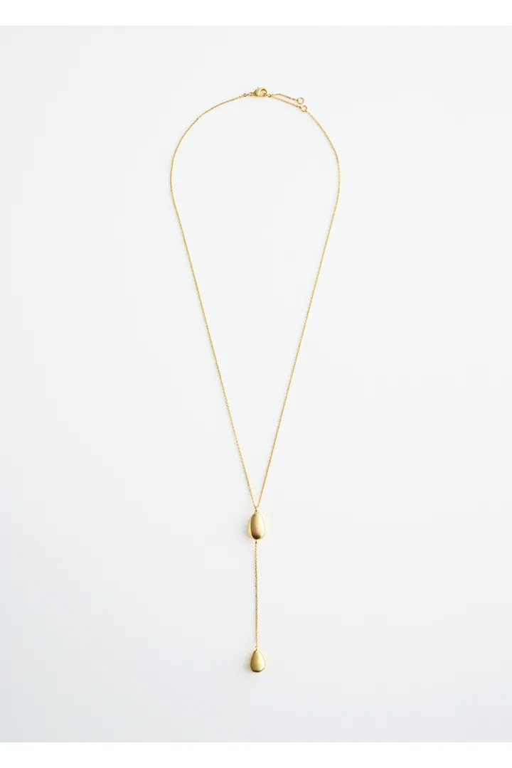 유광 브라스 소재로 탄생한 네크리스예요. 물방울 모양의 펜던트 2개가 장식된 롱 실루엣이 매력적이며, 길이 조절이 가능한 트리거 클래스프가 자리해 있어요. 네크라인이 드러나는 옷과 함께 착용하면 은은한 포인트가 되어준답니다.