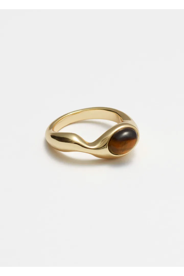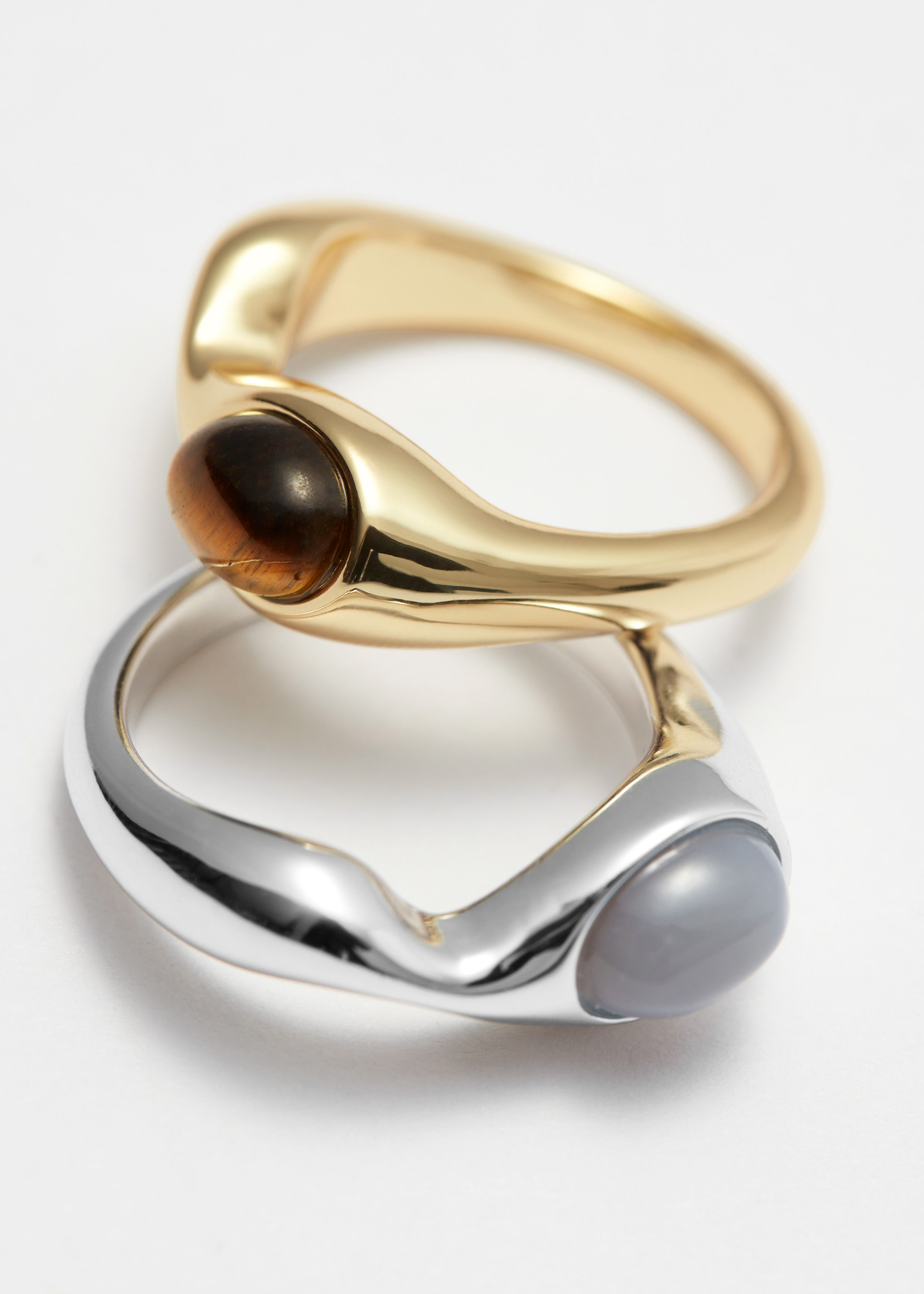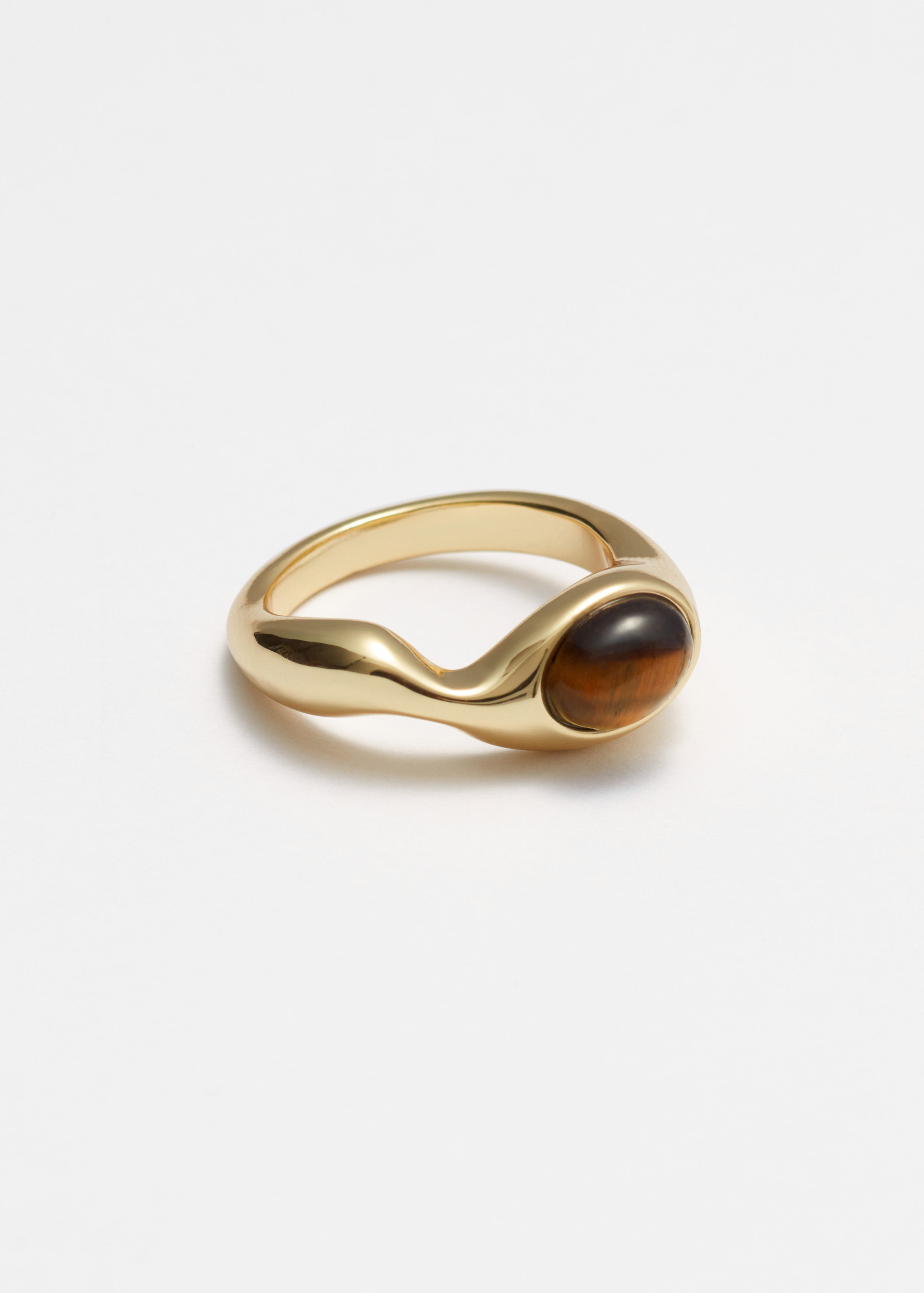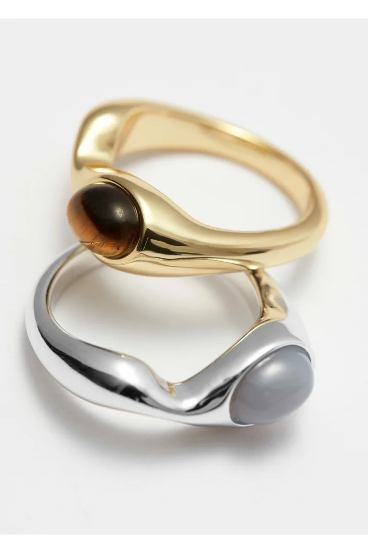 유광 브라스 소재로 탄생한 링이에요. 앞면에는 세미 매트 마감의 스톤이 포인트 컬러로 자리해 있어요. 한쪽 사이드의 굴곡 디자인으로 비대칭적인 쉐입이 특징이랍니다. 단독으로 연출하거나, 다른 링과 함께 섬세한 룩을 완성해 보세요.