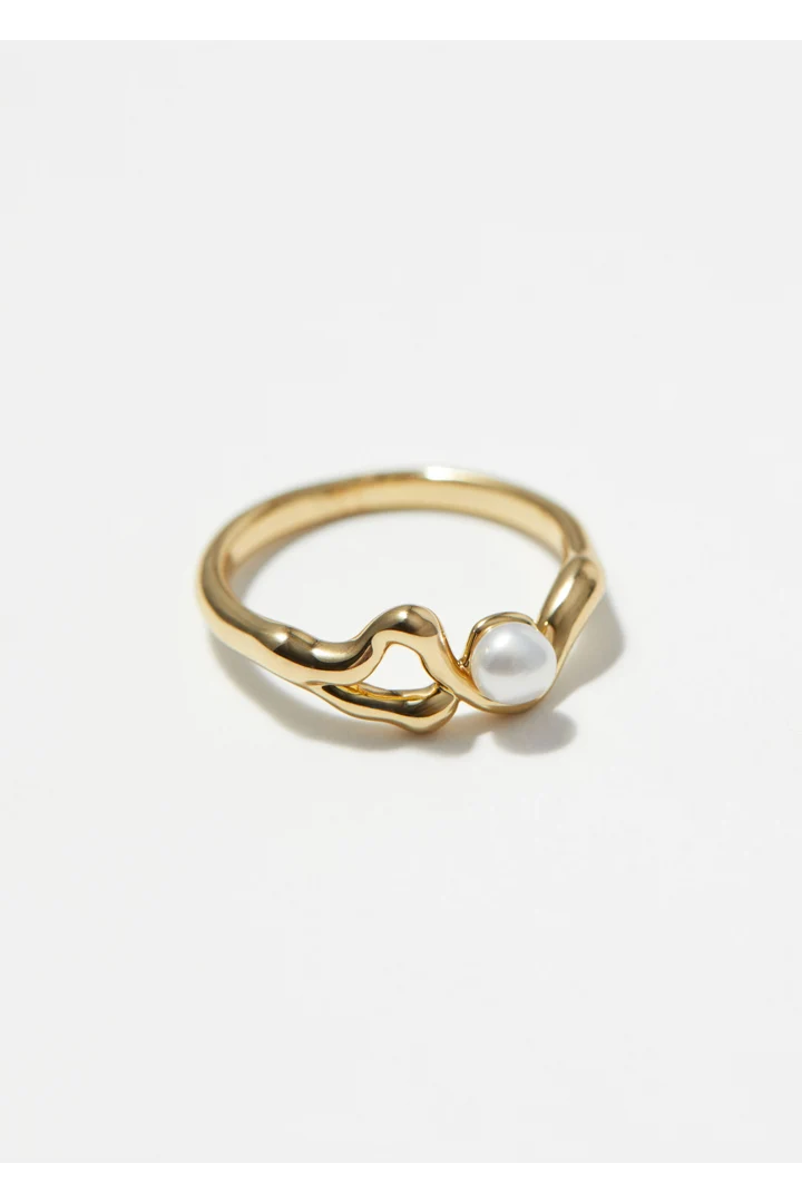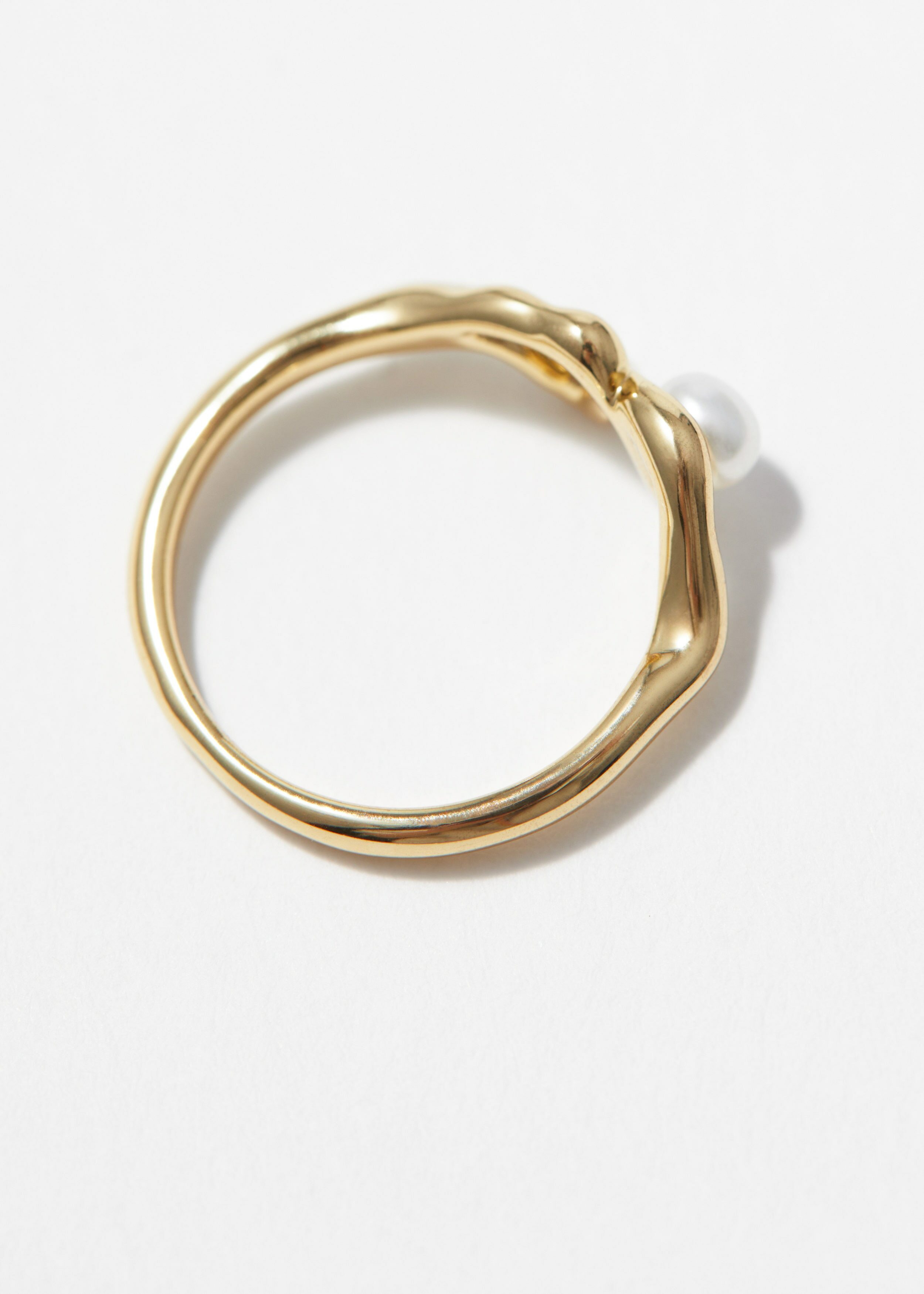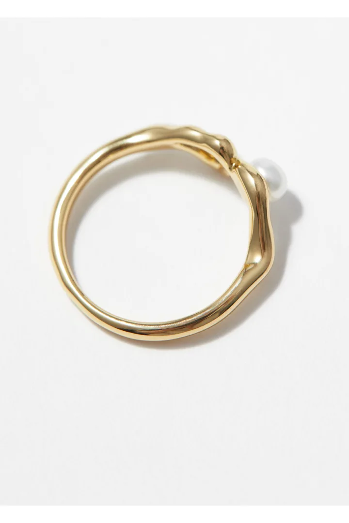 섬세한 무드의 유광 브라스 링이에요. 유기적인 형태와 상단의 담수 진주 디테일이 돋보이는 정교한 디자인이랍니다. 단독으로 미니멀하게 연출하거나, 다른 아이템과 함께 강렬한 무드를 완성해보세요.