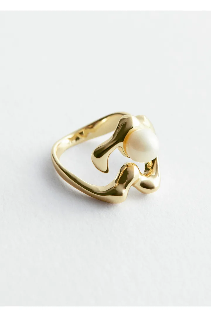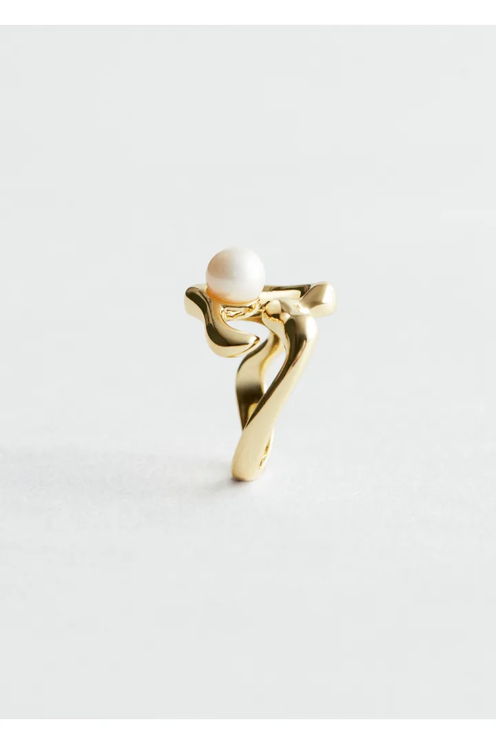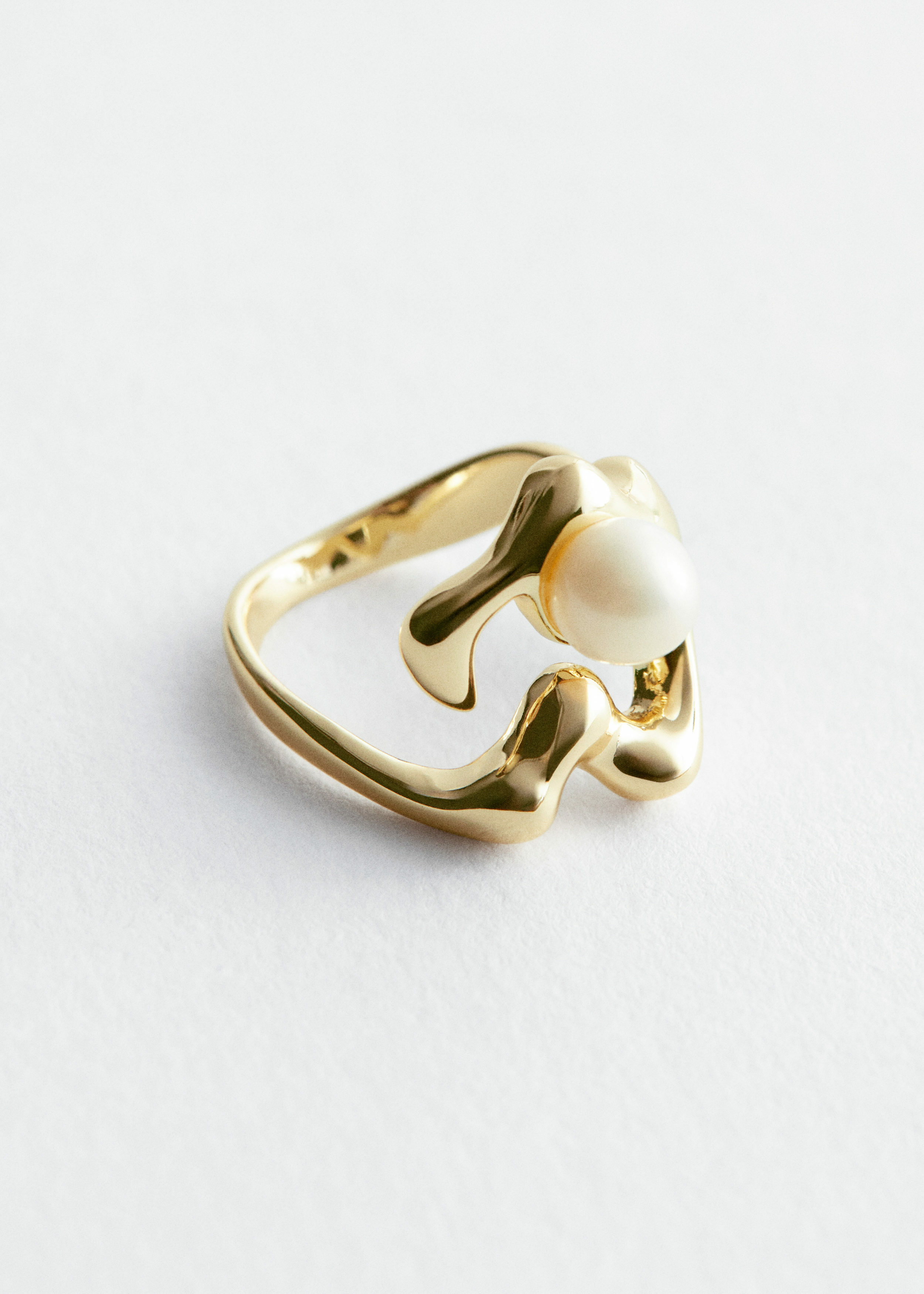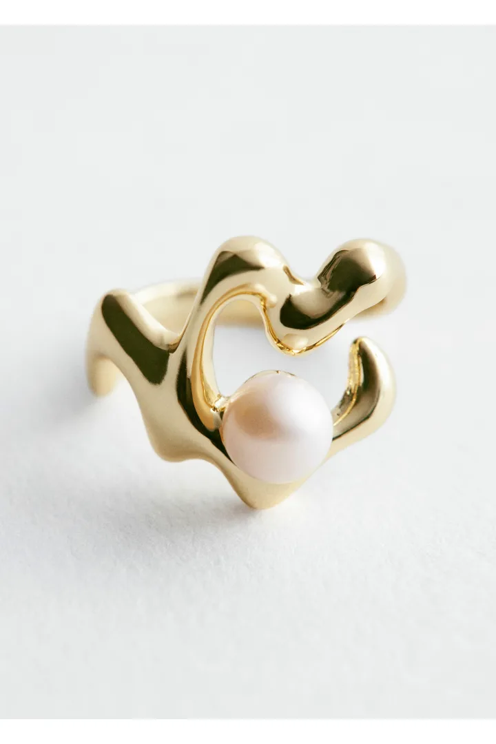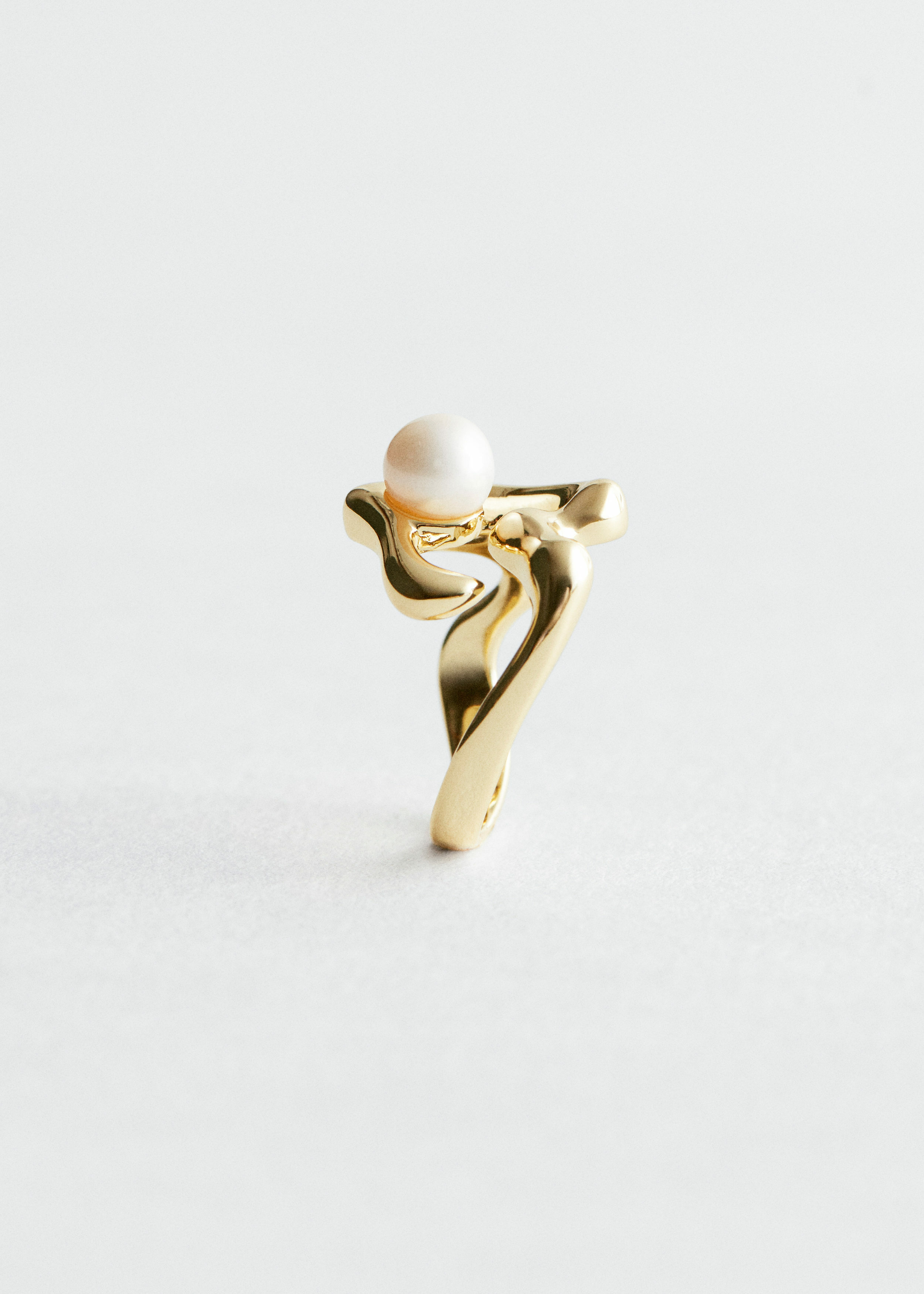 사랑스러운 감각의 링이에요. 유광 브라스로 탄생했으며, 유기적인 컷의 세팅과 광택감이 도는 담수 진주 디테일이 시선을 사로잡아요.
