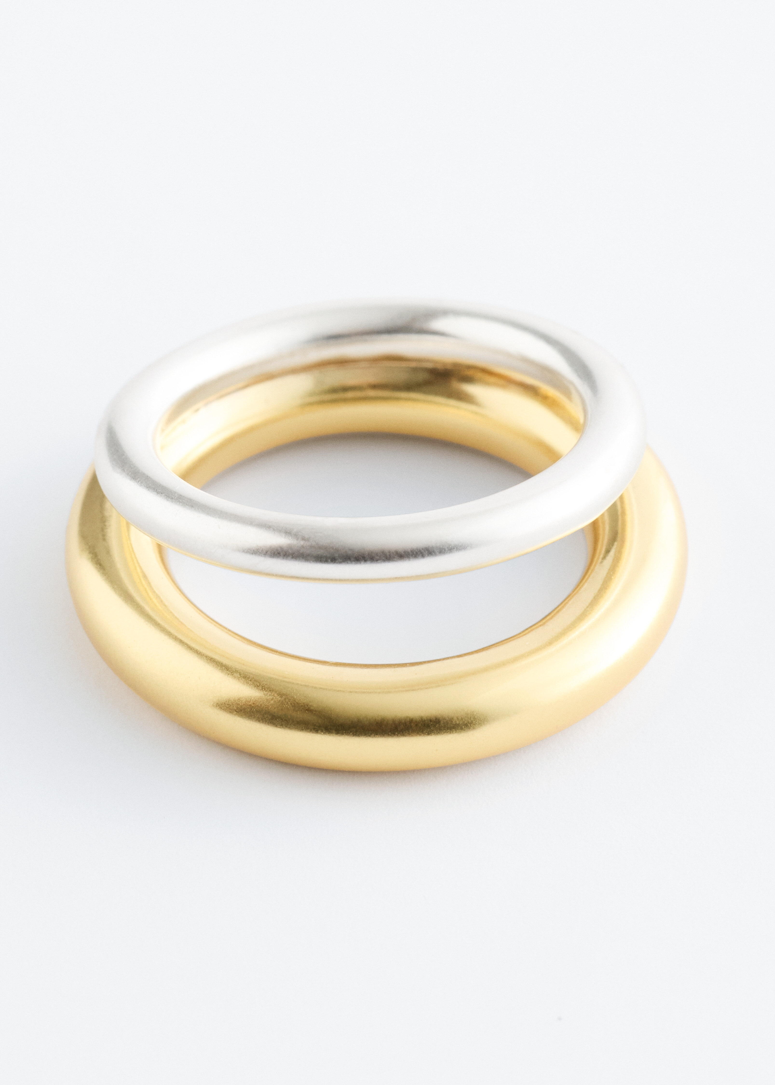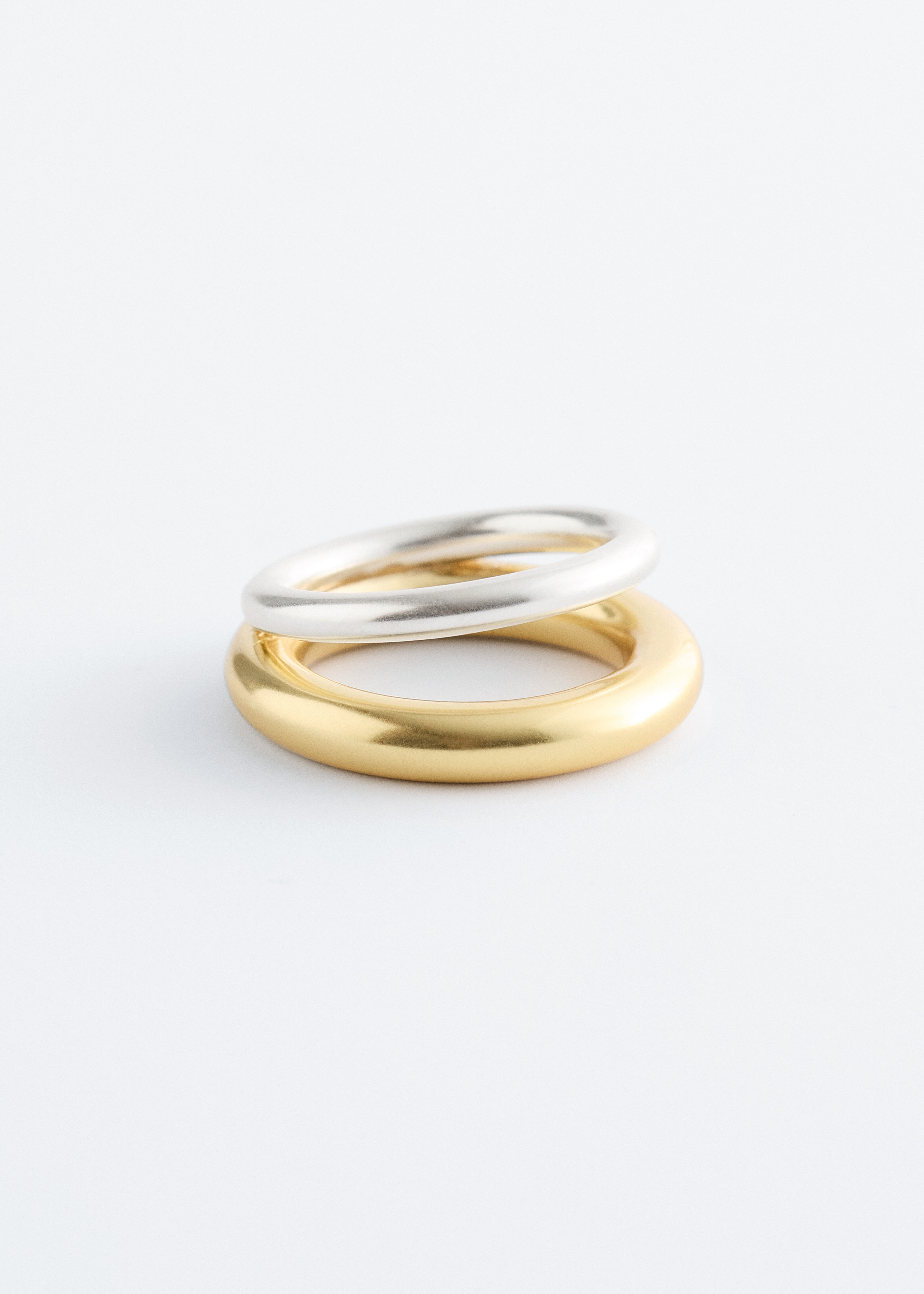 유광 브라스 소재의 링이에요. 대비적인 골드와 실버 톤의 링 2개가 결합되어 있는 구조적인 디자인이 특징이랍니다.